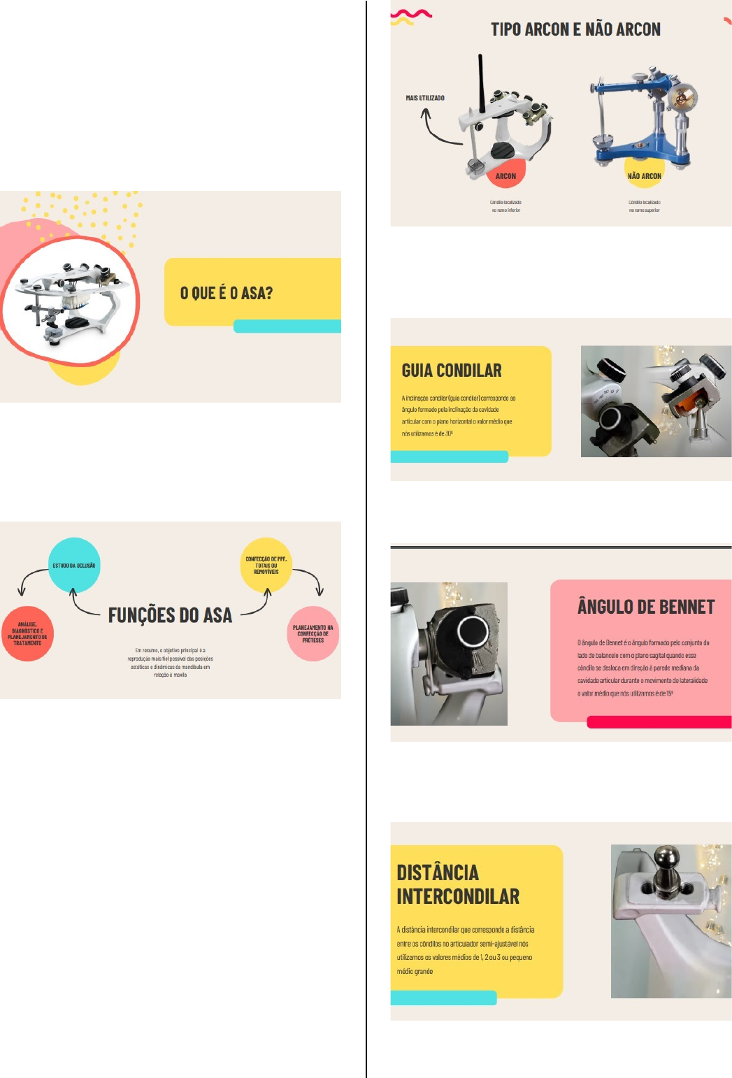 Desmitificando o articulador semi-ajustável Seminário 3 – integrada 3 26/03/2024 ASA – articulador semi-ajustável. Instrumento utilizado para reproduzir as relações e movimentos maxilo-mandibulares do paciente em laboratório, com a finalidade de estudo da oclusão e confecção de dispositivos que serão utilizados pelo paciente. Quando se realiza a montagem dos modelos em articuladores, tem-se como objetivo a reprodução do relacionamento oclusal do paciente com duas finalidades básicas: a) estudo da oclusão, no caso de presença de patologias oclusais e planejamento para confecção de próteses; b) confecção de próteses fixas (PPFs) totais ou removíveis ou de aparelhos interoclusais (placas). Em ambos os casos, o objetivo principal é a reprodução o mais fiel possível das posições estáticas e dinâmicas da mandíbula em relação à maxila. ARCON – semelhante a ATM. NÃO-ARCON – não se assemelha a ATM, côndilo fica lateralmente. Guia condilar – ângulo formado pela inclinação da articulação com o plano oclusal. Ângulo de bennet - Linha imaginaria entre a protusão e lateralidade. O de Fisher, muda a angulação em que é visto. MIH- posição em que ocorre o maior número de contatos dentários de forma bilateral e simultânea. Tem como referência os dentes. É esquelética. É a relação musculo-esquelética onde se tem a posição mais anterossuperior dos côndilos interposto no disco articular. É uma posição mais confortável para o paciente, considerada de repouso articular. Independe do contato dentário. Assim, pode- -se afirmar que o fator fundamental para a seleção da posição é a presença de estabilidade oclusal e a ausência de sinais e sintomas de trauma oclusal. Na confecção de elementos unitários ou de PPFs pequenas com presença de estabilidade oclusal e ausência SSTO, opta-se pela manutenção da MIH do paciente para o registro e a consequente confecção de trabalho protético. O registro em MIH utiliza o mecanismo de percepção neurológica do ligamento periodontal dos dentes que ocluem normalmente do lado oposto, preservando a dimensão vertical de oclusão (DVO) do paciente. Esse registro tem também a finalidade de compensar algumas das limitações dos ASAs. Nas situações em que a estabilidade oclusal não está mais presente (normalmente reabilitações orais extensas ou com perda de DVO) ou a oclusão interfere na saúde do sistema estomatognático, não se deve utilizar a posição de MIH para a construção do trabalho protético, pois as patologias estão relacionadas estritamente à oclusão. Nesses casos, é necessário utilizar o posicionamento condilar (RC) para a definição da posição de trabalho. Uma vez que a RC é assumida como posição de trabalho, ela deve manter harmonia com o relacionamento dentário. Portanto, quando a RC é utilizada como posição terapêutica, é preciso realizar o ajuste oclusal dos dentes remanescentes antes do preparo dos dentes pilares, para garantir a estabilização da oclusão. Essa nova posição maxilomandibular, na qual os contatos dentários estão em harmonia com a posição condilar em relação cêntrica, é denominada oclusão em relação cêntrica (ORC). Arco facial- registra a inclinação e posição da maxila, importante para determinar a altura das cúspides. A forma e a localização do arco estão diretamente relacionadas com a distância da cúspide até́ o eixo de rotação dos côndilos. Assim, para que não haja necessidade de grandes ajustes oclusais na prótese durante a prova e/ou a instalação, essa distância idealmente deveria ser semelhante no crânio e no articulador. No ASA, isso é conseguido por meio do arco facial, que transfere o eixo de rotação dos côndilos para o articulador e, consequentemente, a distância do eixo até́ a coroa que está́ sendo confeccionada. caso de articulador não ajustável - como a distância do eixo de rotação localizado na charneira até́ a coroa é menor que a do eixo de rotação dos côndilos até́ o dente que está́ sendo restaurado, a cúspide, ao ocluir com a fossa do antagonista, “bate” inicialmente em uma vertente antes de contatar a fossa do antagonista, o que resulta em uma restauração “alta”. o arco de fechamento no articulador será́ diferente do arco que a mandíbula realiza quando o paciente fecha a boca. Os instrumentos não ajustáveis podem ser utilizados para montagens de elementos isolados, nos quais as eventuais alterações oclusais incorporadas ao trabalho protético podem ser corrigidas diretamente na boca do paciente, sem grandes prejuízos ao tempo clínico e à qualidade das peças protéticas. No entanto, as limitações desse tipo de articulador reduzem sua utilização para a montagem de modelos de estudo ou modelos para confecção de próteses mais extensas. Para tais procedimentos, indica-se a utilização dos ASAs ou ATAs. O posicionamento do arco facial é feito por meio da colocação de um garfo na boca do paciente com três pontos de godiva de baixa fusão, um na região anterior e os outros dois na região posterior. A haste do garfo deve coincidir com a linha média da face do paciente, e moldam- -se somente as pontas de cúspides e a face incisal dos dentes superiores. Após o resfriamento da godiva, remove-se o garfo, analisam-se as impressões criadas e faz-se a remoção de todos os excessos de godiva, para que somente as pontas de cúspides e as faces incisais fiquem demarcadas, propiciando um assentamento completo do modelo de gesso. O garfo deve permanecer imobilizado durante a colocação do arco facial. O arco facial é posicionado introduzindo sua articulação na haste do garfo e mantendo-a o mais próximo da haste. Em seguida, os dispositivos plásticos existentes nas extremidades do arco facial (olivas) são introduzidos nos meatos auditivos externos do paciente, que é solicitado a manter o arco em posição com as mãos, fazendo