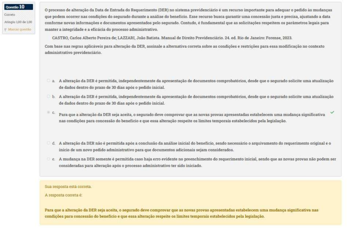 Questão 10 processo de alteração da Data de Entrada do Requerimento (DER) no sistema previdenciário é um recurso importante para adequar pedido às mudanças Correto que podem ocorrer nas condições do segurado durante a análise do Esse recurso busca garantir uma concessão justa e precisa, ajustando a data Atingiu 1,00 de conforme novas informações e documentos apresentados pelo segurado. Contudo, é fundamental que as solicitações respeitem os legais para Marcar manter a integridade e a eficácia do processo administrativo. CASTRO, Carlos Alberto Pereira de; LAZZARI, João Batista. Manual de Direito 24. ed. Rio de Janeiro: Forense, 2023. Com base nas regras aplicáveis para alteração da assinale a alternativa correta sobre as condições e restrições para essa modificação no contexto administrativo previdenciário. A alteração da DER é permitida, independentemente da apresentação de documentos comprobatórios, desde que o segurado solicite uma atualização de dados dentro do prazo de 30 dias após o pedido b. A alteração da DER é permitida, independentemente da apresentação de documentos comprobatórios, desde que o segurado solicite uma atualização de dados dentro do prazo de 30 dias após o pedido inicial. Para que a alteração da DER seja aceita, o segurado deve comprovar que as novas provas apresentadas estabelecem uma mudança significativa nas condições para concessão do beneficio e que essa alteração respeite os limites temporais estabelecidos pela legislação. d. A alteração da DER não é permitida após a conclusão da inicial do beneficio, sendo necessário o arquivamento do requerimento original e o inicio de um novo pedido administrativo para que documentos adicionais sejam considerados. A mudança na DER somente permitida caso haja erro evidente no preenchimento do requerimento inicial, sendo que as novas provas não podem ser consideradas para alteração após processo administrativo ter sido iniciado. Sua resposta está correta. A resposta correta Para que a alteração da DER seja aceita, o segurado deve comprovar que as novas provas apresentadas estabelecem uma mudança significativa nas condições para concessão do beneficio e que essa alteração respeite os limites temporais estabelecidos pela legislação.Questão 9 Os principios administrativos aplicáveis ao Instituto Nacional do Seguro Social (INSS), como legalidade, impessoalidade, moralidade, publicidade e Correto eficiência, orientam as práticas administrativas e promovem uma atuação e responsável por parte da administração pública. A aplicação prática Atingiu 1.00 de 1.00 desses principios busca assegurar que os procedimentos sejam realizados de acordo com as normas vigentes e com respeito aos direitos dos segurados, além Marcar questão de garantir a adequada utilização dos recursos públicos e a transparência nos processos Esses também limitam e orientam as ações dos servidores, assegurando que o INSS atue no melhor interesse público e dentro dos padrões legais e CARVALHO FILHO, Jose dos Santos. Manual de Direito 33. ed. São Paulo: Atlas, 2021. Em uma situação prática no INSS, um servidor descobre uma inconsistência nos dados de um processo de concessão de beneficio. A análise documental indica que o segurado poderia ter direito ao mas a documentação apresentada é insuficiente para comprovar todos os requisitos exigidos por lei. Com base nos principios administrativos aplicáveis, qual das ações a seguir servidor deve adotar para garantir a conformidade do processo? Negar beneficio de imediato, aplicando principio da legalidade, pois os documentos apresentados pelo segurado são insuficientes para comprovar o direito ao beneficio, como exige a legislação. b. Conceder o aplicando o principio da moralidade, uma vez que o segurado apresenta claros sinais de necessidade econômica e poderia, eventualmente, complementar a documentação posteriormente. Solicitar ao segurado os documentos faltantes, aplicando principio da eficiência, para evitar a necessidade de revisar processo em caso de futura contestação judicial. d. Conceder o provisoriamente, aplicando principio da impessoalidade, para evitar indeferimento e permitir que segurado comprove os requisitos restantes ao longo do e. Negar aplicando principio da publicidade, e expor publicamente a decisão para dar transparência ao motivo do indeferimento devido à falta de documentação Sua resposta está correta. A resposta correta é: Solicitar ao segurado os documentos faltantes, aplicando o principio da eficiência, para evitar a necessidade de revisar processo em caso de futura contestação judicial.Questão 8 o Cadastro Nacional de Informações Sociais (CNIS) é um banco de dados essencial para a concessão de beneficios previdenciários, reunindo informações Correto sobre vinculos empregaticios e contribuições previdenciárias. fundamental que as informações no CNIS estejam corretas, pois podem de 1.00 impactar a contagem de tempo de contribuição, o cálculo de valores de aposentadoria e a elegibilidade para outros A análise detalhada e a questão identificação de e lacunas são, portanto, etapas criticas que demandam o cruzamento de informações entre diferentes documentos e registros PAIVA, SILVA, M. V. Direito Previdenciário e CNIS: guia de análise e retificação de dados. São Paulo: Editora 2021. Considerando a da análise do CNIS para evitar prejuizos na concessão de beneficios previdenciários, qual das opções abaixo melhor exemplifica uma metodologia para identificação de inconsistências e lacunas nos registros? a A revisão de contribuições por meio de conferência direta com os registros de recolhimento na Receita Federal e comparação com o extrato de b. A conferência do CNIS apenas com base nos registros mensais de contribuições e vinculos fornecidos pelo empregador. A análise dos dados do CNIS por meio de consulta aos comprovantes d