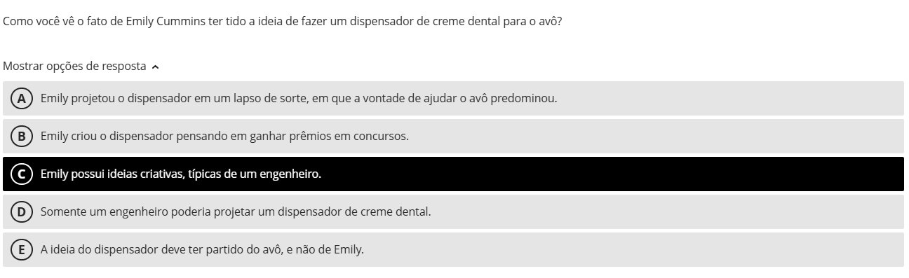 Como você vê o fato de Emily Cummins ter tido a ideia de fazer um dispensador de creme dental para avô? opções de resposta A Emily projetou o dispensador em um lapso de sorte, em que a vontade de ajudan o avô predominou. B Emily criou o dispensador pensando em prêmios em concursos. C Emily possui ideias criativas, típicas de um engenheiro. D Somente um engenheiro poderia projetar um dispensador de creme dental. E A ideia do dispensador deve ter partido do e não de Emily.