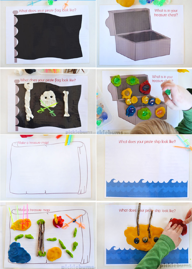 Pirate Playdough Mats This pirate themed play dough set contains four printable playdough mats: • A pirate flag to decorate. • A treasure chest waiting for some treasure. • An empty pirate map. • Empty sea for a pirate ship to sail on. What is in this set? You may have noticed that our play dough mats are a little different from some of the others out there. Our play dough mats are designed as an open-ended prompt. They offer a starting point to encourage imagination and creativity. They ask open-ended questions to encourage kids to come up with their own ideas rather than simply following instructions. There are no right or wrong answers, only creativity, exploration and fun, while also working on fine motor skills, hand strength, coordination and more. So if your child wants to put a unicorn on their pirate flag, that’s awesome! Or If the treasure chest full of candy, that’s cool too! Have fun, be creative, and enjoy these pirate playdough mats! What makes this play dough set dif ferent? Ideas and Extras These play dough mats and accessories are great for all kinds of play dough and modelling dough. You can use them with just dough, or with a range of play dough accessories and/or loose parts (small items are not suitable for very young children). Ideas for loose parts: • small pebbles • pipe cleaners • marbles. • sequins • glass gems • small blocks • wooden shapes • straws • toothpicks • craft sticks • leaves and sticks • pieces of bubble wrap Ideas for accessories: • cookie cutters • rolling pin • plastic knife • scissors • garlic press/extruder Printing Instructions This is an A4 sized pdf file, you will need a pdf reader such as Adobe Acrobat to open it. If you are printing on US ‘letter sized’ paper be sure to select ‘fit’ or ‘shrink to fit’ from your printer options. Print the play dough mats onto plain paper and laminate or slip into a plastic pocket. Please remember that these printables are for personal use only, you may not sell, share, or link directly to these files. See the end of this document for full terms of use. More play dough sets you might like... If your kids enjoy creating and learning with this play dough set, you might like to check out some of our other play dough sets. As a thank you for purchasing this play dough set, use the coupon code cityplaydough1 to get 20% off the purchase of one of the play dough sets below. (The coupon code can only be used once per customer so make sure you have all the items you want to buy in your cart before you add the code.) You can find the full range of printable play dough sets and other fun printables and items in our shop or check out some of our fun free printables on our blog. Halloween Play Dough Mats Christmas Play Dough Mats Easter Play Dough Mats Space Play Dough Set http://shop.picklebums.com/shop/ https://picklebums.com/category/printables-2/ http://shop.picklebums.com/product/halloween-play-dough-mats/ http://shop.picklebums.com/product/christmas-play-dough-mats/ http://shop.picklebums.com/product/easter-play-dough-mats/ http://shop.picklebums.com/product/space-play-dough-mats-accessories/ All images and content are © 2018, Kate Fairlie picklebums.com, all rights reserved. All contents of this package and other PIcklebums designs and products are copyright, unless otherwise stated. Ownership and copyright of all Picklebums designs and art are retained by Kate Fairlie. It is illegal to reproduce or distribute copyrighted material without the permission of the copyright owner. All Materials designed by Kate Fairlie, including but not limited to images and text, are protected by copyright under Australian copyright laws, international conventions, and other relevant copyright laws. All items designed by Kate Fairlie are for personal, non-commercial, use only. By downloading this product you are agreeing to the terms of this user license as stated below : You may purchase and download this printable pdf document for your personal use at home, or for use as a teacher with your own class or group. You may not alter, edit or change this document in any way. You may not share or redistribute this document- that means you may not link directly to the pdf file from your site, you may not email this file to others, you may not upload this file to your own server, or to facebook, or any other file sharing site. You may not use this pdf document for any commercial purposes - that includes selling the document, giving it away to promote your business or website, or printing the file to sell or to use when promoting your business. You may not use this document or any of the images or text for the purpose of web design or web templates. Limited Liability - Kate Fairlie/picklebums.com shall not be held liable for any damages resulting from the use of these items. If you have any questions please email kate@picklebums.com Terms of Use picklebums.com mailto:kate%40picklebums.com?subject=Merry%20and%20Bright%20Advent%20Kit
