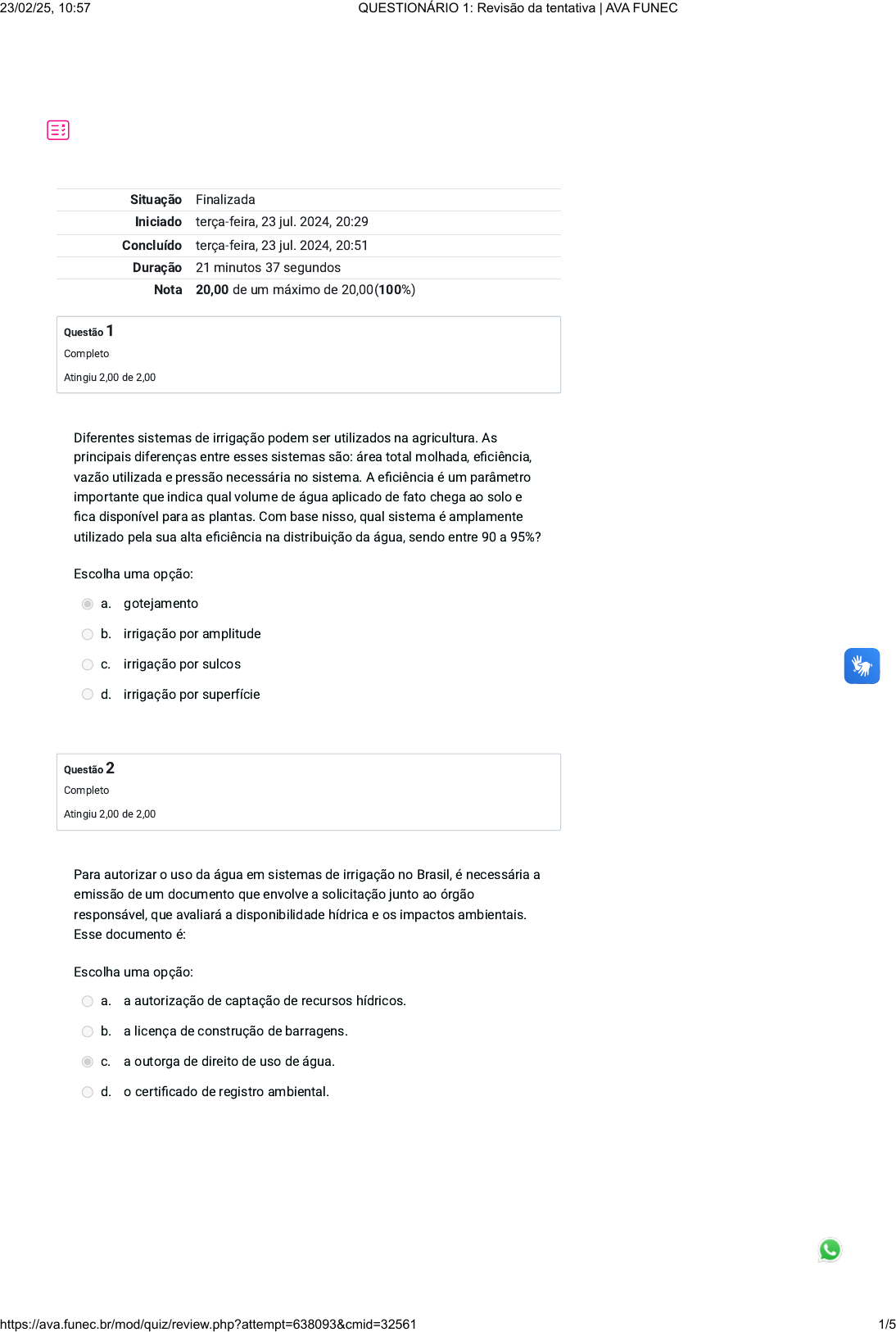 Situação Finalizada Iniciado terça-feira, 23 jul. 2024, 20:29 Concluído terça-feira, 23 jul. 2024, 20:51 Duração 21 minutos 37 segundos Nota 20,00 de um máximo de 20,00(100%) Questão 1 Completo Atingiu 2,00 de 2,00 Questão 2 Completo Atingiu 2,00 de 2,00 Diferentes sistemas de irrigação podem ser utilizados na agricultura. As principais diferenças entre esses sistemas são: área total molhada, eficiência, vazão utilizada e pressão necessária no sistema. A eficiência é um parâmetro importante que indica qual volume de água aplicado de fato chega ao solo e fica disponível para as plantas. Com base nisso, qual sistema é amplamente utilizado pela sua alta eficiência na distribuição da água, sendo entre 90 a 95%? Escolha uma opção: a. gotejamento b. irrigação por amplitude c. irrigação por sulcos d. irrigação por superfície Para autorizar o uso da água em sistemas de irrigação no Brasil, é necessária a emissão de um documento que envolve a solicitação junto ao órgão responsável, que avaliará a disponibilidade hídrica e os impactos ambientais. Esse documento é: Escolha uma opção: a. a autorização de captação de recursos hídricos. b. a licença de construção de barragens. c. a outorga de direito de uso de água. d. o certificado de registro ambiental. 23/02/25, 10:57 QUESTIONÁRIO 1: Revisão da tentativa | AVA FUNEC https://ava.funec.br/mod/quiz/review.php?attempt=638093&cmid=32561 1/5 Questão 3 Completo Atingiu 2,00 de 2,00 Questão 4 Completo Atingiu 2,00 de 2,00 Considere a seguinte situação abaixo: Em uma região de cultivo de hortaliças com histórico de déficit hídrico durante o período de estiagem, um engenheiro agrônomo propõe a implementação de um sistema de irrigação por gotejamento, visando a otimização do uso da água e a redução do impacto ambiental. Considerando a situação descrita, assinale a alternativa CORRETA. Escolha uma opção: a. A irrigação por gotejamento é ideal para culturas de grande porte, como árvores frutíferas, mas não para hortaliças; b. A irrigação por gotejamento tende a aumentar a salinização do solo, sendo desaconselhada para a região. c. A escolha do sistema de irrigação por gotejamento é adequada, pois proporciona alta eficiência na aplicação da água diretamente na zona radicular das plantas; d. O sistema de aspersão é mais indicado devido à sua capacidade de cobrir grandes áreas uniformemente; Nos estudos e planejamento de irrigação, o solo pode ser classificado de acordo com sua aptidão para irrigação. Para o manejo da irrigação, é necessário que se conheçam algumas das propriedades físicas e físico- hídricas do solo. Entretanto, a medição ou estimativa do conteúdo de água do solo em condições de campo é difícil, resultando em variações na amostragem devido a diversos fatores. Acerca deste assunto, assinale a afirmativa incorreta. Escolha uma opção: a. Em condições de campo, distúrbios e mudanças na densidade global, variação em volume de poros e distribuição de tamanho de poros não são capazes de causar profundas variações no conteúdo de água ao longo do perfil do solo. b. O crescimento desigual das plantas e a desuniformidade na distribuição do sistema radicular causam variações no conteúdo de água no solo. c. Sistemas de irrigação mal dimensionados ou operados inadequadamente podem contribuir para uma distribuição de água desuniforme, no campo. d. A variação do solo no campo com relação à estrutura, estratificação e textura causa diferenças na quantidade de água armazenada no solo. 23/02/25, 10:57 QUESTIONÁRIO 1: Revisão da tentativa | AVA FUNEC https://ava.funec.br/mod/quiz/review.php?attempt=638093&cmid=32561 2/5 Questão 5 Completo Atingiu 2,00 de 2,00 Questão 6 Completo Atingiu 2,00 de 2,00 Em relação aos métodos de irrigação, marque a opção INCORRETA: Escolha uma opção: a. O método de irrigação em sulco consiste na condução da água em pequenos canais situados paralelos às fileiras das plantas durante o tempo necessário para a água infiltrar e umedecer o solo na zona radicular da cultura. b. Solos com alta capacidade de infiltração facilitam o uso de irrigação por aspersão e gotejamento, por permitirem irrigação com maior intensidade de aplicação, diminuindo assim o tempo de irrigação por posição. c. Em virtude de as irrigações por aspersão e por gotejamento estarem menos sujeitas à interferência do irrigante no campo, estes métodos apresentam menores eficiências do que os métodos de irrigação por superfície. d. O sistema de irrigação por tabuleiros em contorno pode ser aplicado nas culturas de arroz, cereais, capineiras e pastagem, em áreas com topografias irregulares, declividade igual ou menor que 2%, em solos de textura média a argilosa. Considerando o projeto de construção de um sistema de irrigação por gotejamento para uma plantação de tomates em uma região semiárida, onde a eficiência na utilização da água é crucial para o sucesso da produção. Avalie as alternativas abaixo em relação à seleção e execução do projeto. Escolha uma opção: a. O planejamento deve incluir uma análise detalhada do solo, topografia e condições climáticas para determinar os requisitos de água das plantas; b. Considerações sobre o impacto ambiental da obra são pouco relevantes no contexto da engenharia rural. c. A instalação de sensores de umidade do solo é desnecessária, visto que a irrigação por gotejamento sempre fornece água suficiente para as plantas; d. A escolha do sistema de irrigação por gotejamento deve ser baseada unicamente no custo inicial do sistema; 23/02/25, 10:57 QUESTIONÁRIO 1: Revisão da tentativa | AVA FUNEC https://ava.funec.br/mod/quiz/review.php?attempt=638093&cmid=32561 3/5 Questão 7 Completo Atingiu 2,00 de 2,00 Questão 8 Completo Atingiu 2,00 de 2,00 Para mitigar os efeitos da salinização, 