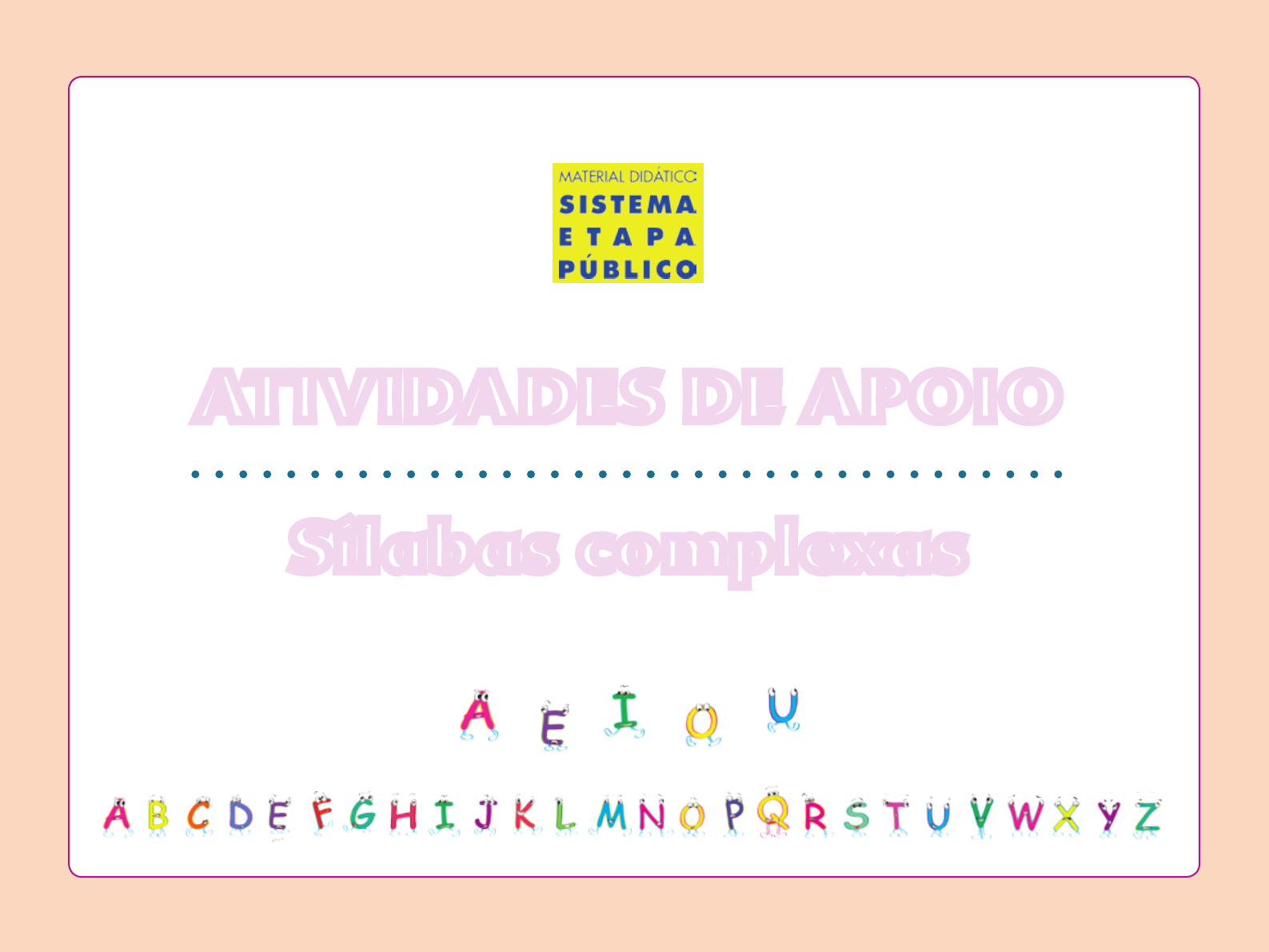 ATIVIDADES DE APOIO Sílabas complexas FAMÍLIA SILÁBICA QU AQUÁRIO – aquário QUA – QUE – QUI – QUO Qua – Que – Qui – Quo qua – que – qui – quo 2 IV A N V IE IT O G A R C IA /S H U TT ER S TO C K .C O M 1. Com as sílabas QUA, QUE, QUI e QUO, podemos escrever várias palavras. Pense em outras palavras com essas sílabas e escreva-as no seu caderno. 2. Observe a foto abaixo e escreva o nome do animal no espaço indicado. 3. Leia as palavras abaixo e sublinhe a que possui a sílaba QUO. AQUÁRIO QUEIJO QUIABO AQUOSO 3 4. Recorte e cole no espaço abaixo palavras com as sílabas QUA, QUE, QUI e QUO. 5. Organize as sílabas para formar palavras e, em seguida, complete as frases. a) O barulho que o relógio faz é ________________-________________. (que + ti – ta + que) b) O soldado fica no ________________________________. (quar + tel) c) O diminutivo de barraca é ________________________________. (bar + ra + nha + qui) d) O aspecto da água é ________________________________. (so + quo + a) 6. Complete com QUA, QUE ou QUI. a) O peri________to é uma ave pe________na. b) Comprei ________abo na ________tanda. c) Ganhei um a________rio com ________tro peixes. 4 FAMÍLIA SILÁBICA BR COBRA – cobra BRA – BRE – BRI – BRO – BRU Bra – Bre – Bri – Bro – Bru bra – bre – bri – bro – bru Banco de palavras BRINCAR BRAÇO BRILHO BRONCA EMBRULHO 5 1. Observe as cenas dos quadrinhos abaixo e utilize o banco de palavras para escrever uma história em quadrinhos no seu caderno. 2. Escolha duas palavras do banco de palavras e forme duas frases. a) b) 6 3. Complete as frases com as palavras do quadro. CASEBRE – BRUXA – BRAÇO – BROA – BRINCO – BRASIL a) João caiu e quebrou o ________________________________. b) A ________________________________ tem uma vassoura voadora. c) A lebre morava em um ________________________________. d) Eu comi ________________________________ de fubá. e) O ________________________________ da menina é de ouro. f ) A bandeira do ________________________________ é verde e amarela. 4. Pinte no diagrama as palavras abaixo. BRAÇO BREJO BRIGA BROTO BRUXA JAHSJALAKISNBRAÇOLAÇSKIENBREJOJAHSHHSNS L Ç K A N B R I G A K A J H S N L A Ç Ç W P K N D J N B R O T O J H A ÇSJSJBNYTEUJSBRUXALAKJSNEKORLJNAMSJNS J S N L O N M J N B X D H K L L Ç P O N N V V H M L K B B K K B 7 FAMÍLIA SILÁBICA CR CRIANÇA – criança CRA – CRE – CRI – CRO – CRU Cra – Cre – Cri – Cro – Cru cra – cre – cri – cro – cru Banco de palavras CRAVO CRENTE CRIAR CROSTA CRUA 8 1. Quantas palavras podemos escrever com as sílabas que acabamos de ler? Escreva quantas conseguir. CRA CRE CRI CRO CRU 2. Com ajuda do seu professor, leia o texto abaixo. O CRAVO DO CROATA O cravo é uma flor muito bonita e cheirosa. Existem muitas espécies de cravo, mas os mais bonitos estão na cratera do jardim do croata que mora aqui perto de casa. O croata fez um lindo arranjo de cravos para criar um buquê para a filha, Cristina, que se casaria no dia seguinte em uma igreja cristã. © Acervo Editora Núcleo 3. Interpretação da história. a) Qual é o nome da filha do croata? 9 b) Por que o croata fez um arranjo de cravos? c) Onde ficava o jardim de cravos do croata? d) Crie um final para a história. 10 4. Vamos praticar? Continue escrevendo as sílabas abaixo. Cra – Cre – Cri – Cro – Cru – 11 FAMÍLIA SILÁBICA DR QUADRADO – quadrado DRA – DRE – DRI – DRO – DRU Dra – Dre – Dri – Dro – Dru dra – dre – dri – dro – dru Banco de palavras DRAGÃO PADRE RODRIGO VIDRO MADRUGADA 12 1. Leia em voz alta as frases abaixo e, em seguida, circule as palavras que também aparecem no banco de palavras. a) O dragão ficou com muito frio e usou um grande edredom. b) O padre celebrou a missa para toda a comunidade. c) O vidro da janela da casa do André está quebrado. d) Na escola, o meu melhor amigo é o Rodrigo. 2. Junte as sílabas e forme palavras. a) ma + dru + ga + da = b) po + dre = c) ro + dri + go = d) vi + dro = e) dra + gão = 3. Combine as palavras das três colunas e forme frases. Siga o modelo. A FRUTA REZOU O PADRE ESTÁ PODRE O DRAGÃO A LUA BRILHA NA MADRUGADA COSPE FOGO 13 4. Reescreva as frases formadas na atividade anterior. 5. Forme frases com as sílabas DRA, DRE e DRI. a) b) c) 14 FAMÍLIA SILÁBICA FR Juntando a letra F com R, vamos ver o que teremos? PAI FRANCISCO Pai Francisco entrou na roda Tocando o seu violão Bi-rim-bão bão bão, Bi-rim-bão bão bão! Vem de lá Seu Delegado E Pai Franciso foi para a prisão. Como ele vem todo requebrado, Parece um boneco desengonçado. (Cantiga popular) FRA – FRE – FRI – FRO – FRU Fra – Fre – Fri – Fro – Fru fra – fre – fri – fro – fru Banco de palavras FRALDA COFRE FRIGIDEIRA FRONHA FRUTA 15 1. No banco de palavras, pinte a palavra que contém quatro sílabas. Escreva-a no espaço abaixo. 2. Circule as palavras que começam com a sílaba FRA. cofre fraco frase frigideira fralda frango 3. O que é, o que é? Começa com FRI e utilizamos para fritar ovo. 16 FAMÍLIA SILÁBICA GR Juntando a consoante G com R formamos GR. Vamos juntar as vogais e descobrir novas palavras. SAPO DE GRAVATA Já vi sapo dentro do saco, sapo batendo papo, mas... Sapo de gravata é como sapato de grife. Só vi em fotografia, no pé de uma grã-fina. A grã-fina tomava suco de groselha na Groenlândia, terra gelada e distante. Eu vi no globo terrestre Que fica no alto da prateleira. © Acervo Editora Núcleo GRA – GRE – GRI – GRO – GRU Gra – Gre – Gri – Gro – Gru gra – gre – gri – gro – gru 17 Banco de palavras GRAVATA IGREJA GRILO GROSSO GRUDE 1. Encontre e circule no diagrama as cinco palavras do banco. ABCDGRAVATAMLNONAHSJLMAIGREJAANJAKMSNJKA JNSGRILOLAMNSJLMANSLGROSSOLAMKSNHANJKSK GRUDELMAKJNSJLMAABDGSLMKGRIPEKKNSDOPUE 2. Escreva uma frase para cada palavra abaixo. Tigre – Grama – 18 3. Separe as sílabas das palavras abaixo. Agri