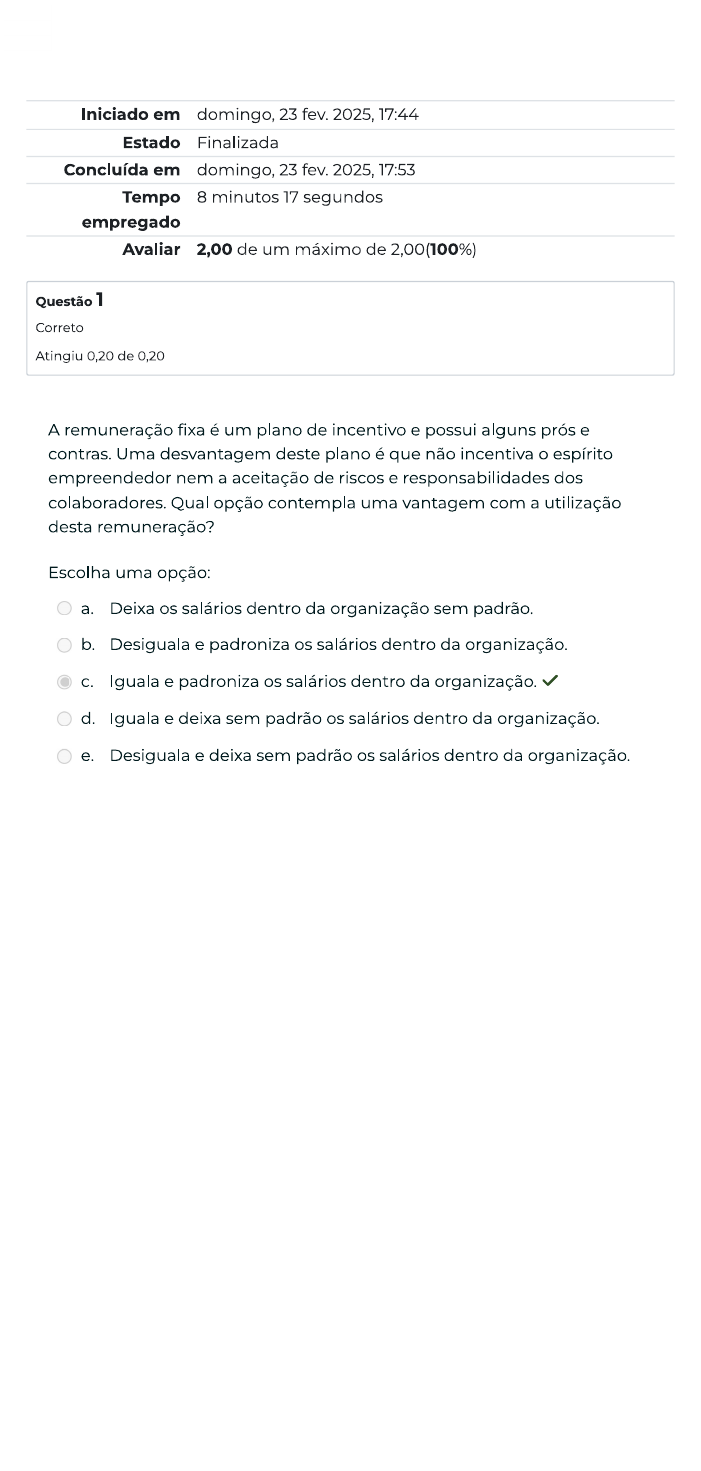 Iniciado em domingo, 23 fev. 2025, 17:44 Estado Finalizada Concluída em domingo, 23 fev. 2025, 17:53 Tempo 8 minutos 17 segundos empregado Avaliar 2,00 de um máximo de 2,00(100%) Questão 1 Correto Atingiu 0,20 de 0,20 A remuneração fixa é um plano de incentivo e possui alguns prós e contras. Uma desvantagem deste plano é que não incentiva o espírito empreendedor nem a aceitação de riscos e responsabilidades dos colaboradores. Qual opção contempla uma vantagem com a utilização desta remuneração? Escolha uma opção: a. Deixa os salários dentro da organização sem padrão. b. Desiguala e padroniza os salários dentro da organização. C. Iguala e padroniza os salários dentro da organização. d. Iguala e deixa sem padrão os salários dentro da organização. e. Desiguala e deixa sem padrão os salários dentro da organização.Questão 2 Correto Atingiu 0,20 de 0,20 A gestão por competências causa impactos organizacionais. Pensando nisso, analise as afirmações e marque a opção correta: Escolha uma opção: a. Gestão por competências é conjunto de ferramentas que, junto com a metodologia de apoio à gestão de pessoas, atua no desenvolvimento de competências técnicas do b. A gestão por competências serve como indicador dos resultados efetivos da contraprestação das entregas dos empregados, e, na falta de resultados, justifica as C. aumento da permanência dos empregados em uma empresa que tem plano de carreira depende exclusivamente da remuneração oferecida. d. A gestão por competências serve para que os empregados melhorem seu desempenho e possam ser elegíveis ao aumento de remuneração e/ou promoções. e. Avaliação por competências é um processo cujas competências devem ser previamente mapeadas e definidas como objetivos a serem atingidos para um cargo. Questão 3 Correto Atingiu 0,20 de 0,20 Analise as afirmações sobre remuneração estratégica e assinale a alternativa que tenha a sequência de verdadeiro e falso correta. I) Os benefícios extrassalariais oferecidos aos empregados são de decisão única da empresa empregadora. II) A remuneração estratégica é uma forma global para o conjunto de medidas e ações voltadas à administração de valores, monetários ou que podemos dispor na gestão empresarial. III) A remuneração estratégica abrange práticas e políticas voltadas à remuneração fixa e à remuneração variável. IV) A política de benefícios pode se tornar uma importante ferramenta de marketing para a empresa. Escolha uma opção: a. b. C. d.Questão 4 Correto Atingiu 0,20 de 0,20 "São realizados levantamentos para a captura de todas as informações possíveis sobre as estruturas de cada departamento da empresa, a identificação dos principais tipos de cargos, as atividades desempenhadas pelos colaboradores, a quantidade de cargos existentes na estrutura organizacional e os salários pagos para os funcionários." Diante disso, qual a fase da descrição de cargos e salários está descrita acima? Escolha uma opção: a. Análise de cargos. b. Coleta de funções. C. Coleta de cargos. d. Coleta de informações. e. Análise de informações. Questão 5 Correto Atingiu 0,20 de 0,20 A descrição e a especificação de cargos focam-se na redação escrita e detalhada dos aspectos inerentes aos cargos. Entretanto, nessa tarefa detalhada, tem-se alguns principios cruciais que devem ser levados em consideração quando se procede à descrição e especificação dos cargos, a saber. Escolha uma opção: a. Ao descrever os cargos e especificá-los, não é necessário se fazer uso de termos que sejam passíveis de medidas; isso porque se a empresa tem avaliação de desempenho, com os resultados dos funcionários, ela poderá avalia-los. b. Quando se descreve e especifica um cargo não precisamos usar de termos técnicos (inclusive pouco conhecidos), não há necessidade de defini-los, uma vez que vários funcionários podem exercem aquele cargo e foram selecionados para eles, portanto conhecem os termos técnicos. C. Ao descrever e especificar os cargos, as empresas podem assim fazê-lo de forma pessoal, não necessitando de formalidades extremas. Utilizando uma linguagem informal, simples que seja compreendida por todos. d. A descrição e especificação de cargos requer que alguns aspectos sejam tomados nesse processo a começar pela: Clareza, Precisão, Concisão e Impessoalidade. e. Ao descrever e especificar um cargo se faz necessário o relato do ambiente de trabalho, contando como ambiente está composto. Na verdade, uma narração escrita do ambiente é necessária, indicando, também, a chefia imediata, os setores da empresa, enfim, as minúcias descritas em um mapa de como o cargo se encaixa naquele setor, e na empresa.Questão 6 Correto Atingiu 0,20 de 0,20 Em relação aos objetivos dos planos de benefícios, analise as asserções a seguir e assinale a alternativa que apresenta a análise correta das asserções. I) Os objetivos individuais são aqueles que, de forma individual, proporcionam benefícios que garantem uma vida pessoal, familiar e profissional mais tranquila. PORQUE II) Proporcionam condições para que os empregados possam se desligar de problemas do dia a dia, podendo então se concentrar nas atividades do trabalho a fim de satisfazer necessidades mais elevadas. Escolha uma opção: a. As asserções e são proposições verdadeiras, e a II justifica a I. b. A asserção lé uma proposição verdadeira, e a II, falsa. C. As asserções e são proposições verdadeiras, mas a não justifica a I. d. A asserção I é uma proposição falsa, e a II, verdadeira. e. As asserções e são proposições falsas. Questão 7 Correto Atingiu 0,20 de 0,20 Durante processo de implantação do plano de cargos e salários, diversas etapas acontecem, sendo que cada etapa é consequência da outra, e ambas se complementam. Anterior à finalização da tabela salarial, ocorre a realização do ranqueame