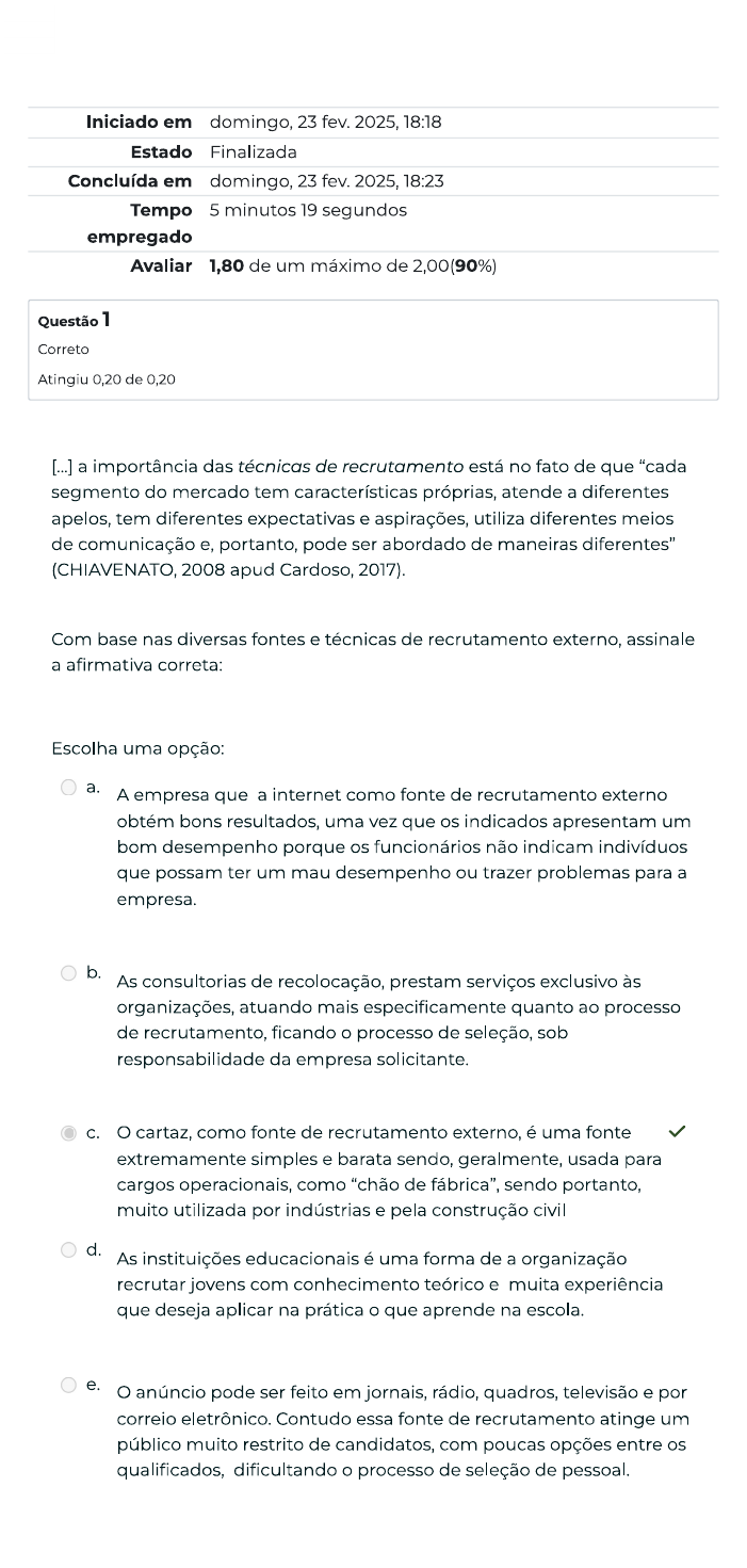 Iniciado em domingo, 23 fev. 2025, 18:18 Estado Finalizada Concluída em domingo, 23 fev. 2025, 18:23 Tempo 5 minutos 19 segundos empregado Avaliar 1,80 de um máximo de 2,00(90%) Questão 1 Correto Atingiu 0,20 de 0,20 [...] a importância das técnicas de recrutamento está no fato de que "cada segmento do mercado tem características próprias, atende a diferentes apelos, tem diferentes expectativas e aspirações, utiliza diferentes meios de comunicação e, portanto, pode ser abordado de maneiras diferentes" (CHIAVENATO, 2008 apud Cardoso, 2017). Com base nas diversas fontes e técnicas de recrutamento externo, assinale a afirmativa correta: Escolha uma opção: a. A empresa que a internet como fonte de recrutamento externo obtém bons resultados, uma vez que os indicados apresentam um bom desempenho porque os funcionários não indicam indivíduos que possam ter um mau desempenho ou trazer problemas para a empresa. b. As consultorias de recolocação, prestam serviços exclusivo às organizações, atuando mais especificamente quanto ao processo de recrutamento, ficando o processo de seleção, sob responsabilidade da empresa solicitante. C. cartaz, como fonte de recrutamento externo, é uma fonte extremamente simples e barata sendo, geralmente, usada para cargos operacionais, como "chão de fábrica", sendo portanto, muito utilizada por indústrias e pela construção civil d. As instituições educacionais é uma forma de a organização recrutar jovens com conhecimento teórico e muita experiência que deseja aplicar na prática o que aprende na escola. e. anúncio pode ser feito em jornais, rádio, quadros, televisão e por correio eletrônico. Contudo essa fonte de recrutamento atinge um público muito restrito de candidatos, com poucas opções entre os qualificados, dificultando processo de seleção de pessoal.Questão 2 Correto Atingiu 0,20 de 0,20 Segundo (Ribeiro, 2006 apud Cardoso, 2017, recrutamento interno, ocorre quando a organização procura preencher uma vaga para um posto de trabalho mediante remanejamento de seus funcionários, que podem ser promovidos, transferidos (horizontalmente) ou transferidos c/ promoção (ascensão funcional)" FERREIRA; FORTUNA, 2001). apesar de apresentar papel muito importante para a movimentação dos recursos humanos de uma organização, trata-se de uma ferramenta que apresenta algumas vantagens e desvantagens quando de sua aplicabilidade. Diante do exposto e considerando os estudos referentes ao recrutamento interno, assinale a afirmativa correta: Escolha uma opção: a. Como malefício do recrutamento interno, podemos citar que a inserção de sangue novo na empresa, vem prejudicar a cultura organizacional vigente b. Apesar de ser um processo consideravelmente rápido recrutamento interno não estimula a motivação dos colaboradores internos em busca de oportunidades de crescimento. C. A entrevista é uma fonte que não se deve utilizar no recrutamento interno, uma vez que neste processo não se faz necessário levantamento de informações do candidato, muito menos de testes e provas de conhecimento. d. recrutamento interno não permite que ideias de concorrentes e de outras empresas possam ser utilizadas. e. No recrutamento interno a falta de companheirismo ou de bom relacionamento entre o corpo funcional, de nada influenciará quanto ao sucesso e eficácia da promoção e/ou remanejamento de pessoal.Questão 3 Correto Atingiu 0,20 de 0,20 A cerca do processo de recrutamento I. Um processo de procurar empregados, estimulá-los e encorajá-los a se candidatar a determinadas vagas. II. Recrutamento vem de uma necessidade em ocupar uma posição que está disponível, e cuja espaço deva ser preenchido, ou que foi criado para superar um falha dentro do sistema organizacional ou para o melhor desenvolvimento da organização. III. a organização quando procura por um profissional, tem por metodologia, fazer a divulgação da vaga para que se possa conhecer e escolher os candidatos que melhor se ajustem para essa oportunidade. IV. os interessados (candidatos) também querem escolher as empresas em que irão trabalhar, por isso escolhem algumas empresas para enviar seus currículos e não escolhem outras. Escolha uma opção: a. apenas II e III estão corretas b. apenas e estão corretas C. apenas I, III e IV estão corretas d. III está incorreta e. III e IV estão corretasQuestão 4 Correto Atingiu 0,20 de 0,20 Ao estudamos processo de recrutamento e seleção, vimos que uma organização quando procura por um profissional, tem por metodologia, fazer a divulgação da vaga para que se possa conhecer e escolher os candidatos que melhor se ajustem para essa oportunidade, (Cardoso, 2017). Com base nesse assunto e considerando o entendimento sobre os processos de recrutamento e seleção, leia as proposições a seguir e assinale a alternativa correta. I. recrutamento se destina a aumentar número de candidatos cujas qualificações atendam aos requisitos de cargo e às necessidades da organização. Sendo assim, II. A seleção é processo de redução desse número e a escolha entre indivíduos com qualificações relevantes. Escolha uma opção: a. A primeira frase está correta e a segunda não diz respeito ao mesmo assunto. b. Ambas as frases estão corretas e a segunda complementa a primeira. C. Ambas estão corretas mas a segunda não corresponde a primeira. d. A primeira está incorreta e a segunda correta. e. Ambas estão incorretas, mas a segunda corresponde à primeira.Questão 5 Correto Atingiu 0,20 de 0,20 Segundo Cardoso, (2017), recrutamento externo, buscará candidatos no mercado de trabalho, em outros termos fora do ambiente organizacional da empresa. Entretanto este tipo de recrutamento, pode proporcionar alguns benefícios e/ou vantagens para as empresas que fizerem uso da mesma. Considerando, as desvantagens que as organizações podem vir a ter com a aplicabilidade deste tipo de recrutamento (externo), assinale (