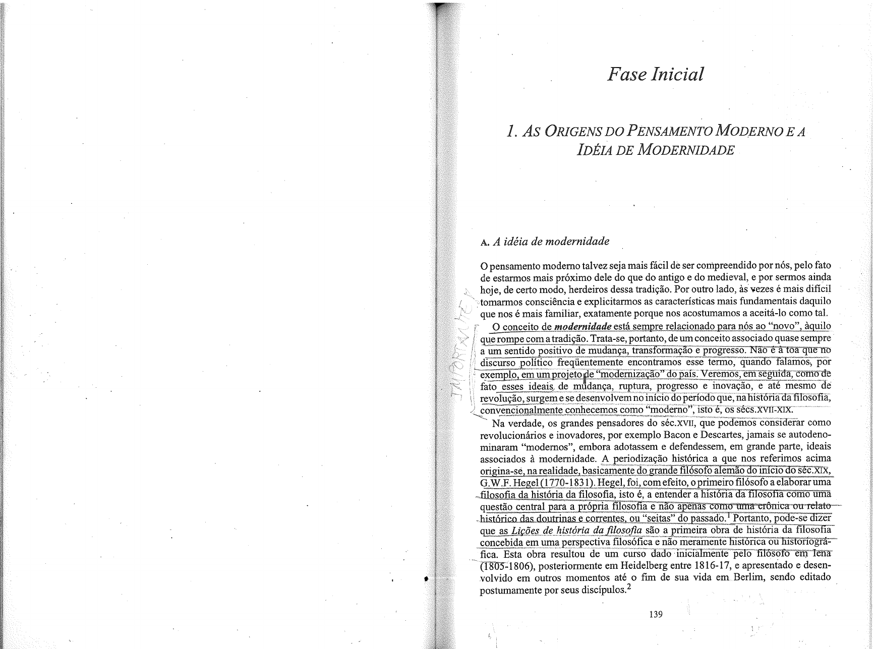 Fase Inicial 1. As ORIGENS DO PENSAMENTO MODERNO E A IDÉIA DE MODERNIDADE A. A idéia de modernidade pensamento moderno talvez seja mais fácil de ser compreendido por nós, pelo fato de estarmos mais próximo dele do que do antigo e do medieval, e por sermos ainda hoje, de certo modo, herdeiros dessa tradição. Por outro lado, às vezes é mais difícil tomarmos consciência e explicitarmos as características mais fundamentais daquilo que nos é mais familiar, exatamente porque nos acostumamos a aceitá-lo como tal. O conceito de modernidade está sempre relacionado para nós ao "novo", àquilo que rompe com a tradição. Trata-se, portanto, de um conceito associado quase sempre a um sentido positivo de mudança, transformação e progresso. é à toa que no discurso político encontramos esse termo, quando falamos, por exemplo, em um projeto de "modernização" do país. Veremos, em seguida, como de fato esses ideais de mudança, ruptura, progresso e inovação, e até mesmo de revolução, surgem e se desenvolvem no início do período que, na história da filosofia, convencionalmente conhecemos como "moderno", isto os sécs XVII-XIX. Na verdade, os grandes pensadores do que podemos considerar como revolucionários e inovadores, por exemplo Bacon e Descartes, jamais se autodeno- minaram "modernos", embora adotassem e defendessem, em grande parte, ideais associados à modernidade. A periodização histórica a que nos referimos acima na realidade, basicamente do grande filósofo alemão do início do G.W.F. Hegel (1770-1831). Hegel, foi, com efeito, o primeiro filósofo a elaborar uma filosofia da história da filosofia, isto é, a entender a história da filosofia como uma questão central para a própria filosofia e não apenas como uma crônica ou histórico das doutrinas e correntes, ou "seitas" do passado. Portanto, pode-se dizer que as Lições de história da filosofia são a primeira obra de história da filosofia concebida em uma perspectiva filosófica e não meramente histórica ou historiográ- fica. Esta obra resultou de um curso dado inicialmente pelo filósofo em Tena (1805-1806), posteriormente em Heidelberg entre 1816-17, e apresentado e desen- volvido em outros momentos até o fim de sua vida em Berlim, sendo editado postumamente por seus 139140 INICIAÇÃO À HISTÓRIA DA FILOSOFIA FILOSOFIA MODERNA 141 É nessa obra, fundamentalmente, que Hegel estabelece a periodização que adota- Três fatores históricos principais podem ser atribuídos à origem, por vezes de mos até hoje, dividindo a história da filosofia em três períodos distintos, cada um forma contraditória, da filosofia moderna, bem como à influência de seu surgimento com suas características específicas e fazendo parte de um mesmo processo: o antigo, e desenvolvimento: o humanismo renascentista do a Reforma protestante do o medieval e, em suas palavras, "a filosofia dos tempos modernos" (Neuzeit), que, e a revolução científica do Vamos analisar em maior detalhe como segundo ele, "consolidou-se apenas ao tempo da Guerra dos Trinta Anos contribuem decisivamente para a formação do pensamento moderno, sem ignorar- com Bacon, Jacob Boehme e Descartes", dando especial ênfase a Descartes e à sua mos, no entanto, outros fatores históricos como a descoberta do Novo Mundo (1492), "filosofia do o desenvolvimento do mercantilismo como novo modelo econômico que supera Na realidade, entretanto, o termo "moderno" era usado já na filosofia medieval, progressivamente a economia feudal, e o surgimento e consolidação dos Estados designando novo movimento na lógica a partir do que se opunha à tradição nacionais (Espanha e Portugal, Países Baixos, Inglaterra e França), que substituem anterior, a chamada logica vetus. A logica modernorum, ou logica terminista, tem o modelo político do feudalismo. Mais uma vez, devemos insistir que se trata de um assim um sentido inovador, introduzindo uma nova problemática nesse campo. processo de transição, já que concepções tradicionalistas continuam a vigorar ainda Posteriormente, já no Ockham e seus seguidores serão conhecidos como nos écs.XVI-XVII, e partes da Europa ainda vivem sob o feudalismo nesse período. defensores da via moderna na lógica e na metafísica, estando essa concepção associada ao nominalismo. B. humanismo renascentista Há uma tradição ainda anterior, datando dos primeiros séculos do cristianismo, acerca de questões sobre o objeto da fé, que opõe antiqui e moderni, os antigos e os Vasari, em sua Vida dos mais excelentes pintores, escultores e arquitetos modernos, sendo os primeiros aqueles que viveram antes de Cristo, e os segundos, (1550), quem primeiro empregou o termo "renascimento" (rinascità) para designar os posteriores a Cristo, os "contemporâneos", por assim dizer. a retomada do estilo clássico na pintura pelo pintor Giotto influenciando Uma terceira origem importante da noção de moderno é a famosa querela dos um novo estilo, que rompe com a arte gótica, característica do final do período antigos e dos modernos (Les anciens et les modernes), que agitou os meios literários medieval. O conceito de Renascimento designando um período histórico, interme- franceses nas últimas décadas do Enquanto tradicionalistas como Boileau diário entre o medieval e o moderno, e abrangendo XV a XVI origina-se defendiam o classicismo greco-romano, os modernos como Perrault e Fontenelle4 se entretanto, da obra do historiador da arte suíço Jacob Burkhardt, A civilização do opunham à suposta superioridade dos clássicos e à sua autoridade, defendendo a Renascimento na Itália (1860), de grande influência na época.5 Este conceito foi aplicação da idéia de progresso nas artes e nas letras tanto quanto nas ciências. Essa adotado por outros historiadores da arte como o inglês Walter Pater, cuja obra The controvérsia literária parece ter sido efetivamente o primeiro momento em que a Renaissance (1873) teve també