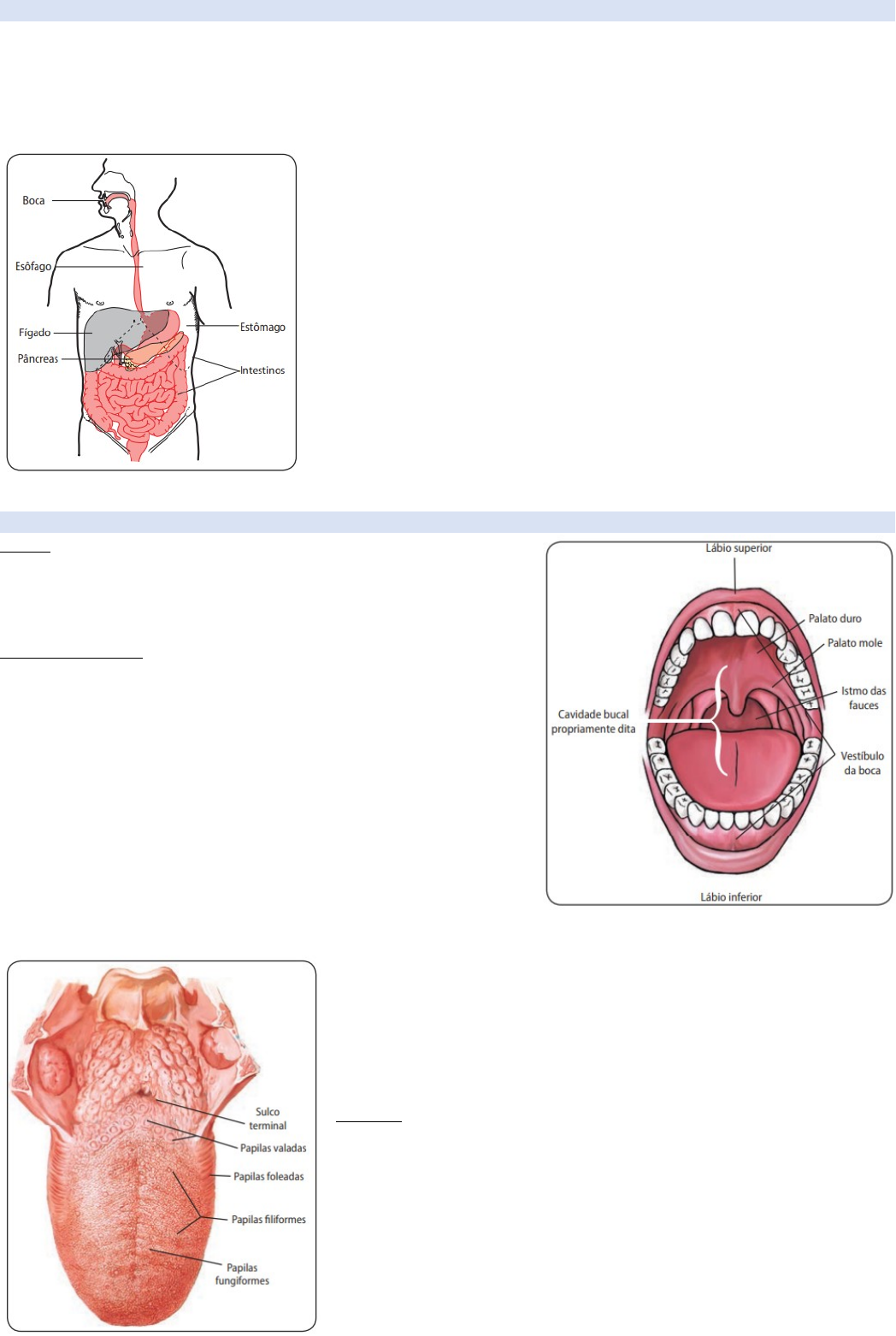 03/02/2025 – AULA 1 ANATOMIA (VINI) SISTEMA DIGESTÓRIO O sistema digestório caracteriza-se como um conjunto de órgãos responsáveis pela apreensão, mastigação, deglutição (depois da deglutição não tem mais nada voluntário), absorção e eliminação dos resíduos em forma de fezes. Está disposto em forma de um tubo por onde passa o bolo alimentar e recebe o produto de secreção das glândulas anexas que vão auxiliar na digestão dos alimentos. É um sistema aberto que permite a eliminação dos resíduos não aproveitáveis pelo organismo. Podemos dividir o sistema digestório em: → Tubo Digestório; que é composto de uma sequência de órgãos tubulares, como boca, faringe, esôfago, estômago intestinos, canal anal e ânus. → Glândulas Anexas: que é composta de glândulas salivares, fígado e pâncreas. BOCA E CAVIDADE ORAL BOCA A boca é a abertura que fica na face entre o lábio superior e o lábio inferior. É a porção inicial do tubo digestório onde ocorre a apreensão, mastigação e deglutição do bolo alimentar. CAVIDADE ORAL A cavidade oral pode ser dividida em duas partes: vestíbulo e a cavidade bucal propriamente dita. OBS: É NA CAVIDADE ORAL O LOCAL ONDE SE INICIA O PROCESSO DE DIGESTÃO ALIMENTAR. → Vestíbulo: região da cavidade oral anterior à gengiva e às arcadas dentárias. Função: controlar a rima da boca. → Cavidade oral: é a região situada internamente aos dentes e à arcada dentária. A língua está dentro da cavidade oral propriamente dita. OBS: SE CONECTA POSTERIORMENTE COM A OROFARINGE. É LIMITADA PELO PALATO DURO E MOLE. Fazem parte dos limites da cavidade oral: os lábios (fazem o limite anterior); o istmo das fauces (fazem o limite posterior); as bochechas (fazem o limite lateral); os palatos duro e mole (fazem o limite superior) e o músculo milohióide da cavidade oral (faz o limite inferior/assoalho). ❀ Lábios: são controlados pelo músculo orbicular da boca. Atuam como a válvula de controle da rima da boca. LÍNGUA É um órgão muscular, recoberto por uma túnica mucosa. É importante para o transporte dos alimentos para a faringe, além de participar na gustação e na fonação. A face superior da língua é chamada de dorso da língua. O dorso apresenta uma depressão em forma de “V” conhecida como sulco terminal, que divide a língua em duas porções: → 2/3 anteriores ao sulco terminal correspondem ao corpo da língua (parte móvel); → 1/3 posterior ao sulco terminal corresponde à raiz da língua (parte fixa). No dorso da língua encontram-se as papilas linguais que se projetam na mucosa de revestimento da língua. Distinguimos, no dorso da língua quatro tipos de papilas linguais: as filiformes, fungiformes, circunvaladas e folhadas. Que são divididas em papilas gustativas e táteis/estruturais: → Papilas gustativas: fungiformes, folhadas e circunvaladas. → Papilas táteis/estruturais: filiformes. OBS: TUDO DEPOIS DO PALATOFARINGEO É OROFARINGE ❀ Músculos da Língua → Músculos extrínsecos: - Vem de fora pra dentro. Começam (fixação) no crânio e terminam na língua; - Modificam a posição, vão movimentar a língua. Também podem alterar seu formato. - Genioglosso, Hioglosso, Estiloglosso e Palatoglosso. → Músculos intrínsecos: - Internos: começam e terminam na língua. Possuem fixação completamente na língua. - Modificam o formato da língua; - Longitudinal superior, Longitudinal inferior, Vertical e Transverso. OBS: TODOS ELES SÃO INERVADOS PELO N. HIPOGLOSSO (XII), EXCETO O PALATOGLOSSO, QUE É INERVADO PELO N. VAGO (X). ** Paralisia do músculo genioglosso: caso esse músculo paralise, a língua pode cair posteriormente, obstruindo a via respiratória e com risco de sufocação. Durante a anestesia geral há o relaxamento total dos músculos genioglossos. Portanto, a pessoa anestesiada é intubada para evitar o sufocamento causado pela queda da língua. BOCHECHAS Paredes móveis da cavidade oral; Estrutura musculofibrosa, semelhante aos lábios. O principal músculo é o Bucinador – que confere resistência a pressões excessivas. Sua túnica externa leva o nome de mucosa jugal. Superficialmente aos músculos bucinadores, há coleções encapsuladas de gordura – Bolas de Bichat. Essas bolas de Bichat são proporcionalmente muito maiores em lactentes, provavelmente para reforçar as bochechas e evitar seu colapso durante a sucção. Em adultos é puramente estrutural. GLÂNDULAS SALIVARES As glândulas salivares são divididas em glândulas salivares maiores e menores. A diferença entre elas é que as maiores possuem dimensões muito maiores e constituem verdadeiramente uma coleção de tecido exócrino que secreta como um todo em um único ducto salivar, ao invés de glândulas agindo individualmente. Assim, os ductos maiores terminam produzindo uma quantidade muito maior de saliva por dia do que os ductos menores. Por sua vez, o principal papel das glândulas menores é o de lubrificar a cavidade oral, enquanto a saliva digestiva e protetiva é produzida pelas glândulas maiores, → Glândulas Salivares Maiores - Glândula Parótida; é a maior das glândulas salivares, mas não é a que produz maior quantidade de saliva, ela produz entre 25% a 30% do débito salivar total. Localiza-se entre o ramo da mandíbula e o músculo Esternocleidomastoideo. A saliva produzida pela glândula parótida é liberada pelo ducto de Stensen, cujo ducto pode ser visto na parede bucal, ao nível do segundo dente molar superior. - Glândula Submandibular: é a segunda maior das glândulas salivares, e como as outras três, é uma glândula pareada. É a glândula que produz maior quantidade de saliva, cerca de 70% do débito salivar total diário. O ducto de Wharton, que drena a saliva produzida pelas glândulas submandibulares, se abre na papila sublingual, sob a língua. - Glândula Sublingual: é a menor das glândulas salivares maiores, sendo a única devido ao fato de p