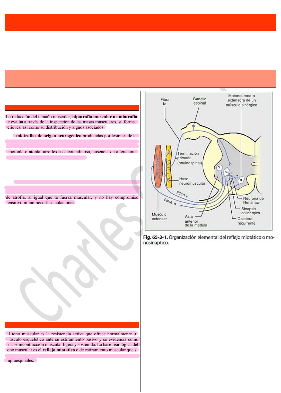 I n s t a g r a m : @ c h a r l e s s . g a b r i e l P á g i n a | 1 de 6 Semiología Médica 2 Sistema nervioso MOTILIDAD El examen de la motilidad comprende la exploración del trofismo, del tono muscular y de la motilidad activa voluntaria e involuntaria. TROFISMO MUSCULAR. La reducción del tamaño muscular, hipotrofia muscular o amiotrofia, se evalúa a través de la inspección de las masas musculares, su forma y relieves, así como su distribución y signos asociados. Las amiotrofias de origen neurogénico producidas por lesiones de las motoneuronas periféricas de la vía piramidal suelen ser asimétricas, con predominio distal, asociadas con una marcada reducción de la fuerza, hipotonía o atonía, arreflexia osteotendinosa, ausencia de alteraciones sensitivas y presencia de fasciculaciones (contracciones musculares parcelares de fascículos musculares aislados, involuntarias, visibles debajo de los tegumentos como movimientos vermiculares de la masa muscular). Las amiotrofias producidas por patologías musculares o atrofias miogénicas presentan una distribución proximal, son simétricas, con reflejos osteotendinosos en principio están en consonancia con el grado de atrofia, al igual que la fuerza muscular, y no hay compromiso sensitivo ni tampoco fasciculaciones. La amiotrofia que acompaña a la desnutrición afecta toda la masa muscular, que representa 40-45% del peso corporal total. En los casos graves puede asociarse con debilidad, aunque por lo general sin alteraciones de los reflejos y sin fasciculaciones. Las amiotrofias reflejas o por desuso, acompañan a la patología articular y se relacionan topográficamente con ella. Hay reducción del número de fibras musculares, pero se trata de una situación reversible al solucionarse o mejorar la patología de base. El aumento de tamaño de los músculos, o hipertrofia muscular, se observa en miopatías raras, como la enfermedad de Thomsen. Seudohipertrofia muscular es una condición patológica asociada con ciertas miopatías en las cuales la masa muscular es reemplazada por tejido graso, con reducción de la fuerza a pesar de un aumento del tamaño muscular. La contractura muscular aparece en músculos sometidos a acortamientos prolongados, durante semanas o meses, y se constata la limitación del estiramiento máximo de esos músculos, que con frecuencia está acompañada por dolor. Ej.: contractura gemelar en mujeres que utilizan calzado con tacos altos. TONO MUSCULAR. El tono muscular es la resistencia activa que ofrece normalmente un músculo esquelético ante su estiramiento pasivo y se evidencia como una semicontracción muscular ligera y sostenida. La base fisiológica del tono muscular es el reflejo miotático o de estiramiento muscular que se integra metaméricamente a nivel espinal modulado por influencias supraespinales. EXPLORACIÓN. Inspección. A través de los relieves y formas musculares es posible ver el estado del tono muscular. Están aumentados y definidos en la hipertonía; poco marcados y aplanados en la hipotonía muscular. Palpación. Revela consistencia aumentada en los estados de hipertonía y masas musculares particularmente blandas y fácilmente depresibles en los músculos hipotónicos. Motilidad pasiva. Movilización efectuada por el explorador, de los diferentes segmentos corporales. Da información sobre el tono muscular, así como sobre el estado de las estructuras osteoarticulomusculares involucradas. Extensibilidad. Es la máxima separación posible entre sus puntos de inserción, y se halla reducida en contracturas musculares y aumentada en la laxitud ligamentosa. I n s t a g r a m : @ c h a r l e s s . g a b r i e l P á g i n a | 2 de 6 Pasividad. Es más significativa. Informa el grado de resistencia que el músculo opone a su alargamiento pasivo. En la hipertonía se observa el aumento de esa resistencia; en la hipotonía ocurre lo contrario. Pruebas de pasividad de André-Thomas. Se realizan con el paciente de pie, con los brazos a ambos lados del cuerpo; tomándolo desde la cintura, se imprime un movimiento de rotación del tronco hacia uno y otro lado. El movimiento pasivo de los miembros superiores será más amplio en los hipotónicos respecto de la normalidad, y en los casos de hemihipotonía excursionará más ampliamente el del lado hipotónico. Maniobra de Stewart-Holmes. Forma parte de los fenómenos de rebote. Pide al paciente que flexione el antebrazo sobre el brazo. El médico extiende el brazo ejerciendo de manera sostenida cierta fuerza. En forma brusca, el explorador cesa su intento de estiramiento, normalmente se produce un ligero desplazamiento del miembro flexionado, que retorna con rapidez a su posición inicial. En los caos de hipotonía, el miembro superior se desplaza ampliamente y la mano del paciente golpea su hombro. ALTERACIONES. Hipotonía. Disminución del tono muscular. Puede asociarse con otros trastornos neurológicos o constituir por sí sola una enfermedad. Hay 3 tipos de hipotonía: Por lesiones musculares (miopatías y enfermedad de Oppenheim). Por afecciones del SN periférico debido a interrupción del arco reflejo del tono. Por afecciones del SNC (enfermedades de la médula, cerebelo y trastornos extrapiramidales). Hipertonía. Aumento del tono muscular. Existen 2 tipos: La derivada de la lesión de la vía piramidal (espasticidad). Es una resistencia plástica a los movimientos pasivos. Al efectuarse el estiramiento muscular, se puede ver la brusca reducción de la resistencia ofrecida, asociándose la contracción de los músculos antagonistas (signo de la navaja). Ver resumen de Síndrome Piramidal. La hipertonía por disfunción extrapiramidal (rigidez). Se distribuye por los músculos flexores, tanto de los miembros superiores como del tronco y MMII. En la rigidez del parkinsonismo es característico el fenómeno de la rueda dentada, que es la sucesión de reducciones pequeñas y transitorias de la hipertonía en cuestión. Ver resumen 