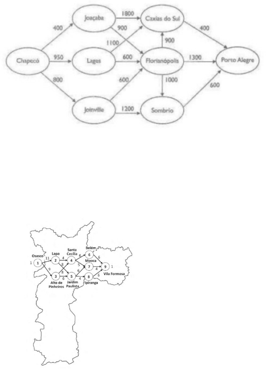 1) (Caminho mínimo) Considere que os números indicados em cada aresta significam o número de quilômetros necessários para um automóvel percorrer a estrada entre duas cidades indicadas pelos nós extremos das arestas observadas. Monte o modelo que determine a rota que um automóvel deve seguir para sair de Chapecó e chegar a Porto Alegre, percorrendo a menor quantidade de quilômetros possível. Resposta 2450 2) (CAMINHO MÍNIMO) Um fornecedor de alimentos localizado em Osasco entrega salgados e doces diariamente para uma padaria localizada na região da Vila For mosa, em São Paulo. Para isso, o motorista pode percorrer mais de um caminho, passando por diferentes bairros em São Paulo. A Figura apresenta os possíveis caminhos que o veículo pode percorrer, do nó de oferta (Osasco) para o nó de demanda (Vila For mosa), além das distâncias em quilômetros entre os nós ou bairros. Formule o problema do caminho mais curto estudado. (resposta: MinZ = 24) 3) [Problema de Caixeiro viajante] Um caixeiro viajante tem que percorrer um conjunto de cidades de tal modo que percorra todas as cidades sem passar duas vezes pela mesma cidade. Pretende-se minimizar a distância percorrida. Apresenta-se de seguida o mapa. Complete a tabela e calcule o caminho com a menor distância (R:32) A B C D E A - 7 6 10 7 B 7 - 7 10 10 C 6 7 - 5 9 D 10 10 5 - 6 E 7 10 9 6 4) [Problema de Caixeiro viajante] Um transportador tem que percorrer um conjunto de cidades de Santa Catarina de tal modo que realize todas sem passar duas vezes pela mesma Cidade. Pretende-se minimizar a distância percorrida. Segue a tabela com a distância entre as origens e os destinos (R: 1428) 0 Chapeco Concordia Cacador Lages Joinville Bal.Camboriu Brusque Florianopolis Tubarao Criciuma Chapeco 0 80 207 310 490 514 496 531 511 490 Concordia 80 0 154 231 437 435 416 451 431 417 Cacador 207 154 0 170 298 325 306 353 366 359 Lages 310 231 170 0 288 251 213 255 202 192 Joinville 490 437 298 288 0 94 115 180 297 347 Bal.Camboriu 514 435 325 251 94 0 41 85 202 252 Brusque 496 416 306 213 115 41 0 96 214 243 Florianopolis 531 451 353 255 180 85 96 0 139 189 Tubarao 511 431 366 202 297 202 214 139 0 50 Criciuma 490 417 359 192 347 252 243 189 50 0 image3.emf image1.png image2.png