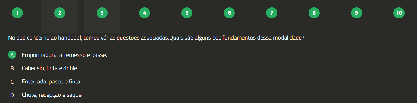 1 2 3 4 5 6 7 8 9 10 No que concerne ao handebol, temos várias questões associadas. Quais são alguns dos fundamentos dessa modalidade? A Empunhadura, arremesso e passe. B Cabeceio, finta e drible. Enterrada, passe e finta. D Chute, recepção e saque.