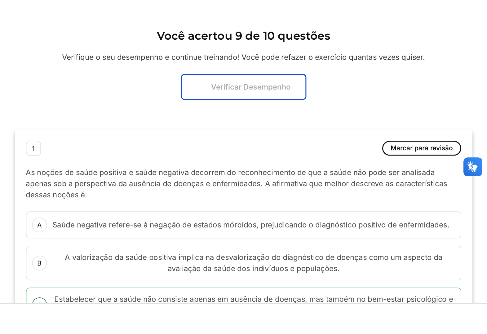 Você acertou 9 de 10 questões Verifique o seu desempenho e continue treinando! Você pode refazer o exercício quantas vezes quiser. Verificar Desempenho A B C 1 Marcar para revisão As noções de saúde positiva e saúde negativa decorrem do reconhecimento de que a saúde não pode ser analisada apenas sob a perspectiva da ausência de doenças e enfermidades. A afirmativa que melhor descreve as características dessas noções é: Saúde negativa refere-se à negação de estados mórbidos, prejudicando o diagnóstico positivo de enfermidades. A valorização da saúde positiva implica na desvalorização do diagnóstico de doenças como um aspecto da avaliação da saúde dos indivíduos e populações. Estabelecer que a saúde não consiste apenas em ausência de doenças, mas também no bem-estar psicológico e social, implica reconhecer que aspectos positivos devem ser considerados em sua avaliação. D E A B Ao declarar que um paciente tem saúde negativa e não saúde positiva, o médico quer dizer que os exames realizados foram falso-positivos e que é necessário tratamento. A aptidão física é um componente da saúde negativa, relacionado à prevenção de lesões e doenças crônico- degenerativas. Resposta correta Parabéns, você selecionou a alternativa correta. Confira o gabarito comentado! Gabarito Comentado A resposta correta: Estabelecer que a saúde não consiste apenas em ausência de doenças, mas também no bem-estar psicológico e social, implica reconhecer que aspectos positivos devem ser considerados em sua avaliação 2 Marcar para revisão Um estilo de vida ativo pode melhorar as funções física, mental e social da pessoa que envelhece. Nesse sentido, é correto afirmar que: Há uma relação estreita entre aptidão física, funcional e social dos idosos. Impactar positivamente em uma delas, contribui para a melhoria das demais, com influência em um processo de envelhecimento bem sucedido A capacidade de trabalho físico diminui com a idade, o que implica em evitar-se um aumento excessivo das B C D E atividades que os idosos realizam Os modos de vida sofrem pouca influência do entorno físico e social. Na verdade, ser ou não fisicamente ativo ao longo do envelhecimento reflete os valores individuais e uma opção pessoal Não há relação comprovada entre o aumento da aptidão física de idosos e uma melhor aptidão social. Tratam- se de conceitos distintos, que devem ser trabalhados de acordo com suas especificidades Estudos epidemiológicos sugerem que a prática regular de atividades físicas melhoram a aptidão física das pessoas idosas, mas têm pouco impacto nas taxas de morbidade e mortalidade dessa população Resposta correta Parabéns, você selecionou a alternativa correta. Confira o gabarito comentado! Gabarito Comentado A alternativa correta é a A, que afirma que há uma relação estreita entre a aptidão física, funcional e social dos idosos. Isso significa que melhorar uma dessas áreas pode ter um impacto positivo nas outras, contribuindo para um processo de envelhecimento mais bem-sucedido. Isso está alinhado com a ideia de que um estilo de vida ativo pode melhorar as funções física, mental e social da pessoa que envelhece. Portanto, promover a aptidão física, funcional e social pode ser uma estratégia eficaz para melhorar a qualidade de vida dos idosos. 3 Marcar para revisão A B C D E Quando as atividades físicas são feitas para aumentar a capacidade de realizar trabalho físico, devem revestir-se de características específicas. Quanto à sentença anterior, pode-se afirmar que: Exercícios físicos são concebidos para melhorar componentes da aptidão física relacionada às habilidades motoras, enquanto atividades físicas incrementam qualidades físicas da aptidão física relacionada à saúde. As características específicas significam que se deve levar em conta o impacto dos exercícios físicos sobre a independência funcional e efeito protetor de uma melhor aptidão física sobre o desenvolvimento de doenças. Como a aptidão física relacionada às habilidades motoras remete ao desempenho de tarefas específicas, é nesse sentido que se deve interpretar as características específicas dos exercícios físicos. Atividades físicas são extremamente inespecíficas, sem características próprias e são realizadas principalmente por diversão. Praticar exercícios físicos é algo muito mais sério. Quando prescrevemos exercícios físicos, lidamos com atividades físicas planejadas, sistematizadas, repetitivas e intencionais, com a finalidade de alcançar um objetivo específico. Resposta correta Parabéns, você selecionou a alternativa correta. Confira o gabarito comentado! Gabarito Comentado A alternativa correta é a E, que afirma que quando prescrevemos exercícios físicos, estamos lidando com atividades A B C D E , q q q p , físicas planejadas, sistematizadas, repetitivas e intencionais, com a finalidade de alcançar um objetivo específico. Isso significa que as atividades físicas são estruturadas com um propósito definido, seja para melhorar a saúde, a aptidão física ou a habilidade motora. Portanto, essas atividades não são aleatórias ou feitas apenas por diversão, mas sim, são planejadas e organizadas para atingir metas específicas. 4 Marcar para revisão Os termos atividade física e exercício físico são frequentemente aplicados como se fossem a mesma coisa. No entanto, isso é errado porque: Atividades físicas são movimentos corporais que gastam calorias, enquanto os exercícios físicos melhoram apenas a aptidão física. Exercícios físicos representam uma categoria mais ampla e detalhada que as atividades físicas. Apesar de os exercícios físicos serem também atividades físicas, diferenciam-se destas últimas por causa de seu caráter de intencionalidade e planejamento. Usar os termos como sinônimos é errado, porque a aptidão física não melhora em resposta a ativi