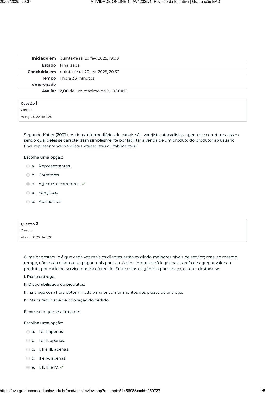 Iniciado em quinta-feira, 20 fev. 2025, 19:00 Estado Finalizada Concluída em quinta-feira, 20 fev. 2025, 20:37 Tempo empregado 1 hora 36 minutos Avaliar 2,00 de um máximo de 2,00(100%) Questão 1 Correto Atingiu 0,20 de 0,20 Questão 2 Correto Atingiu 0,20 de 0,20 Segundo Kotler (2007), os tipos intermediários de canais são: varejista, atacadistas, agentes e corretores, assim sendo qual deles se caracterizam simplesmente por facilitar a venda de um produto do produtor ao usuário final, representando varejistas, atacadistas ou fabricantes? Escolha uma opção: a. Representantes. b. Corretores. c. Agentes e corretores. ✓ d. Varejistas. e. Atacadistas. O maior obstáculo é que cada vez mais os clientes estão exigindo melhores níveis de serviço; mas, ao mesmo tempo, não estão dispostos a pagar mais por isso. Assim, imputa-se à logística a tarefa de agregar valor ao produto por meio do serviço por ela oferecido. Entre estas exigências por serviço, o autor destaca-se: I. Prazo entrega. II. Disponibilidade de produtos. III. Entrega com hora determinada e maior cumprimentos dos prazos de entrega. IV. Maior facilidade de colocação do pedido. É correto o que se afirma em: Escolha uma opção: a. I e II, apenas. b. I e III, apenas. c. I, II e III, apenas. d. II e IV, apenas. e. I, II, III e IV. ✓ 20/02/2025, 20:37 ATIVIDADE ONLINE 1 - AV12025/1: Revisão da tentativa | Graduação EAD https://ava.graduacaoead.unicv.edu.br/mod/quiz/review.php?attempt=5145698&cmid=250727 1/5 Questão 3 Correto Atingiu 0,20 de 0,20 Questão 4 Correto Atingiu 0,20 de 0,20 Considera-se como membros de um canal de distribuição o fabricante ou produtor que dá origem ao produto ou serviço que está sendo vendido, chamado intermediários, são classificados em: I. Atacadistas. II. Clientes de Empresa. III. Varejistas. IV. Consumidores individuais. V. Distribuidores. É correto o que se afirma em: Escolha uma opção: a. I, III e V, apenas. ✓ b. I, II e IV, apenas. c. IV e V, apenas. d. II e IV, apenas. e. I e II, apenas. Analise e assinale a alternativa correta através das afirmativas abaixo quais custos são reduzidos substancialmente aos fabricantes com a utilização de intermediários: I. Logísticos. II. Comerciais. III. Financeiros. IV. Serviços aos clientes. É correto o que se afirma em: Escolha uma opção: a. I e III, apenas. b. IV, apenas. c. I, II, III e IV. ✓ d. III e IV, apenas. e. I e II, apenas. 20/02/2025, 20:37 ATIVIDADE ONLINE 1 - AV12025/1: Revisão da tentativa | Graduação EAD https://ava.graduacaoead.unicv.edu.br/mod/quiz/review.php?attempt=5145698&cmid=250727 2/5 Questão 5 Correto Atingiu 0,20 de 0,20 Questão 6 Correto Atingiu 0,20 de 0,20 É importante mencionar uma figura também muito utilizada em meio a distribuição, é um contrato entre o franqueador (produtor ou prestador de serviço) e um franqueado (pessoa independente) que explora comercialmente uma marca, design, produto, serviço ou modelo de negócio e para isso paga uma taxa a empresa franqueadora, estamos falando do: I. Shopper. II. Franchising. III. Varegista. IV. Consumidor final. É correto o que se afirma em: Escolha uma opção: a. I, apenas. b. IV, apenas. c. II e IV, apenas. d. III, apenas. e. II, apenas. ✓ Segundo Kotler (2007, p. 319) as funções mais importantes da logística incluem: I. Armazenagem. II. Gerenciamento de estoque. III. Transporte. IV. Gerenciamento de informações de Logística. É correto o que se afirma em: Escolha uma opção: a. I, II e III, apenas. b. I e II, apenas. c. I e III, apenas. d. I, II, III e IV. ✓ e. I, III e IV, apenas. 20/02/2025, 20:37 ATIVIDADE ONLINE 1 - AV12025/1: Revisão da tentativa | Graduação EAD https://ava.graduacaoead.unicv.edu.br/mod/quiz/review.php?attempt=5145698&cmid=250727 3/5 Questão 7 Correto Atingiu 0,20 de 0,20 Questão 8 Correto Atingiu 0,20 de 0,20 De acordo com Kotler (2007) existem alguns tipos de intermediários que podem surgir com algumas alternativas de canais, dentre estes canais temos o responsável por descobrir distribuidores em diferentes regiões ou setores que comprarão e comercializarão a nova linha de produtos. Oferecer-lhes distribuição exclusiva, boa margem de lucro, treinamento para o produto e apoio promocional, este refere-se ao: I. Força de vendas da empresa. II. Vendedores externos. III. Representante de vendas do fabricante. IV. Distribuidores Industriais. V. Terceiros contratados. É correto o que se afirma em: Escolha uma opção: a. IV, apenas. ✓ b. I e III, apenas. c. I e II, apenas. d. I e IV, apenas. e. V, apenas. Com relação à parceria formada entre o Marketing e a Logística, avalie as asserções a seguir e a relação proposta entre elas. I. O Marketing e a Logística formam um elo importante para as relações entre as empresas e os clientes e promovem o aumento da satisfação do cliente em relação aos produtos e serviços. PORQUE II. Um bom serviço logístico, é imprescindível à fidelização e à satisfação dos clientes. Acerca dessas asserções, assinale a opção correta. Escolha uma opção: a. A asserção I é uma proposição verdadeira, e a II é uma proposição falsa. b. As asserções I e II são proposições verdadeiras, e a II é uma justificativa correta da I. ✓ c. A asserção I é uma proposição falsa, e a II é uma proposição verdadeira. d. As asserções I e II são proposições falsas, e a II é uma justificativa correta da I. e. As asserções I e II são proposições verdadeiras, mas a II não é uma justificativa correta da I. 20/02/2025, 20:37 ATIVIDADE ONLINE 1 - AV12025/1: Revisão da tentativa | Graduação EAD https://ava.graduacaoead.unicv.edu.br/mod/quiz/review.php?attempt=5145698&cmid=250727 4/5 Questão 9 Correto Atingiu 0,20 de 0,20 Questão 10 Correto Atingiu 0,20 de 0,20 Uma empresa fabricante pode vender os seus produtos diretamente aos consumidores finais, mas devido os desafios logísticos, armazenagem e até mesmo para evita