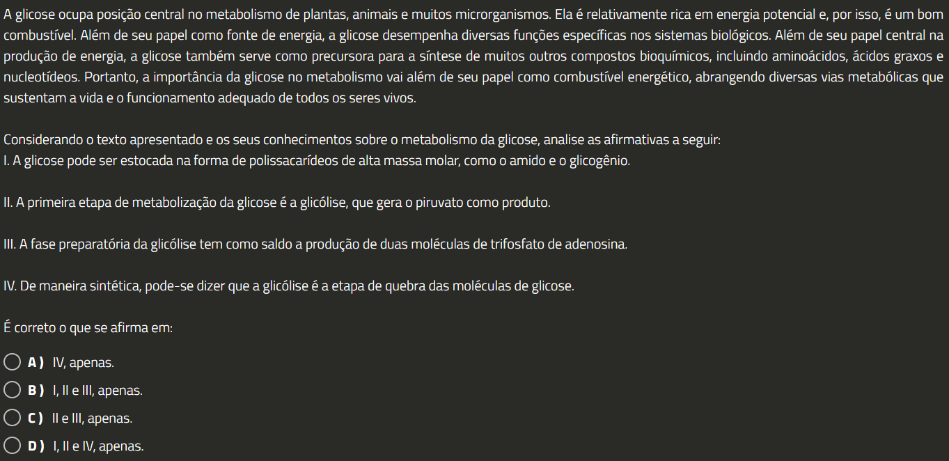A glicose ocupa posição central no metabolismo de plantas, animais e muitos microrganismos. Ela é relativamente rica em energia potencial e, por isso, é um bom específicas nos sistemas biológicos. Além de seu papel central na produção de energia, a glicose também serve como precursora para a síntese de muitos outros compostos bioquímicos, incluindo aminoácidos, ácidos graxos e nucleotídeos. Portanto, a importância da glicose no metabolismo vai além de seu papel como combustível energético, abrangendo diversas vias metabólicas que sustentam a vida e funcionamento adequado de todos os seres vivos. Considerando texto apresentado e os seus conhecimentos sobre metabolismo da glicose, analise as afirmativas a seguir: I. A glicose pode ser estocada na forma de polissacarídeos de alta massa molar, como amido e glicogênio. II. A primeira etapa de metabolização da glicose é a glicólise, que gera piruvato como produto. III. A fase preparatória da glicólise tem como saldo a produção de duas moléculas de trifosfato de adenosina. IV. De maneira sintética, pode-se dizer que a glicólise é a etapa de quebra das moléculas de glicose. É correto que se afirma em: A) IV, apenas. B) I, e III, apenas. C) II e III, apenas. ) I, e IV, apenas.