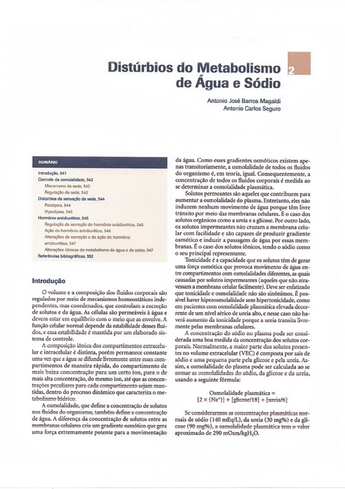Distúrbios do Metabolismo 2 de Água e Sódio Antonio José Barros Magaldi Antonio Carlos Seguro SUMÁRIO da água. Como esses gradientes osmóticos existem ape- nas transitoriamente, a osmolalidade de todos os fluidos 541 do organismo é, em teoria, igual. Consequentemente, a Controle da osmolalidade, 542 concentração de todos os fluidos corporais é medida ao Mecanismo da sede, 542 se determinar a osmolalidade plasmática. Regulação da sede, 542 Solutos permeantes são aqueles que contribuem para Distúrbios da sensação da sede, 544 aumentar a osmolalidade do plasma. Entretanto, eles não Polidipsia, 544 induzem nenhum movimento de água porque têm livre Hipodipsia, 545 trânsito por meio das membranas celulares. É o caso dos Hormônio 545 solutos orgânicos como a ureia e a glicose. Por outro lado, Regulação da secreção do hormônio 545 os solutos impermeantes não cruzam a membrana celu- Ação do 546 lar com facilidade e são capazes de produzir gradiente Alterações da secreção e da ação do hormônio osmótico e induzir a passagem de água por essas mem- 547 branas. o caso dos solutos tendo o sódio como Alterações clinicas metabolismo da e do 547 Referências 552 o seu principal representante. Tonicidade é a capacidade que os solutos têm de gerar uma força osmótica que provoca movimento de água en- tre compartimentos com osmolalidades diferentes, as quais Introdução causadas por impermeantes que não atra- vessam a membrana celular facilmente). Deve ser enfatizado o volume e a composição dos corporais são que tonicidade e não são É pos- regulados por meio de mecanismos inde- haver hiperosmolalidade sem hipertonicidade, como pendentes, mas coordenados, que controlam a excreção em pacientes com osmolalidade elevada decor- de solutos e da água. As células são permeáveis à água e rente de um nível sérico de ureia alto, e nesse caso não ha- devem estar em equilíbrio com o meio que as envolve. A verá aumento da tonicidade porque a ureia transita livre- função celular normal depende da estabilidade desses flui- mente pelas membranas celulares. dos, e essa estabilidade é mantida por um elaborado sis- A concentração do sódio no plasma pode ser consi- tema de controle. derada uma boa medida da concentração dos solutos cor- A composição dos compartimentos extracelu- Normalmente, a maior parte dos solutos presen- lar e intracelular é distinta, porém permanece constante tes no volume extracelular (VEC) é composta por sais de uma vez que água se difunde livremente entre esses com- sódio e uma pequena parte pela glicose e pela ureia. As- partimentos de maneira rápida, do compartimento de sim, a osmolalidade do plasma pode ser calculada ao se mais baixa concentração para um certo para o de somar as osmolalidades do sódio, da glicose e da ureia, mais alta concentração, do mesmo ion, até que as concen- usando a seguinte fórmula: trações peculiares para cada compartimento sejam man- tidas, dentro do processo dinâmico que caracteriza o me- Osmolalidade plasmática tabolismo + + A osmolalidade, que define a concentração de solutos nos fluidos do também define a concentração Se considerarmos as concentrações plasmáticas nor- de água. A diferença da concentração de solutos entre as mais de sódio (140 mEq/L), da ureia (30 mg%) e da gli- membranas celulares cria gradiente que gera (90 mg%), a plasmática tem valor uma força extremamente potente para a movimentação aproximado de 290542 CLÍNICA MÉDICA DOENÇAS RENAIS Na prática clínica, a osmolalidade plasmática deve ser re pela via renal e por vias extrarrenais. As perdas renais determinada por um e não pela fórmula aci- são basicamente controladas pela ação do hormônio anti- ma, para evitar que ocorram erros de interpretação, uma diurético, e as não renais são perdas incontroláveis. vez que outros solutos, como manitol, sorbitol, maltose, Esse balanço de água (i. as perdas e os ganhos ao etanol, metanol e etilenoglicol, deixariam de ser detecta- longo do dia) deve igualar-se exatamente. Um adulto per- dos. de para o meio externo aproximadamente 2,5 litros de Outra situação clínica em que o emprego da fórmu- água por dia, sendo a maior parte desse volume represen- la pode induzir a interpretação errônea são os casos de tada pela urina (1.500 mL). transpiração e a perspiração pseudo-hiponatremia. Isso pode ocorrer em situações em colaboram com cerca de 800 mL, e a perda de água pelas que a fase sólida do plasma está aumentada, como na hi- fezes alcança 200 mL. Uma pequena parte dessas perdas pertrigliceridemia grave e na paraproteinemia. o mielo- é compensada pela geração endógena de aproximadamente ma múltiplo é o principal exemplo do aumento das pa- 200 mL de água por meio do metabolismo. A reposição raproteínas no plasma. A explicação para os valores baixos dessas perdas diárias deve ser feita pela ingestão da mes- do Na+ plasmático decorre do método de dosagem em- ma quantidade (i. e., cerca de 2.500 mL de água). Para um pregado. Em muitos laboratórios, o sódio não é men- adulto normal, a maior parte dessa reposição é feita in- surado por eletrodo específico e sim pelo de gerindo água, sucos, refrigerantes ou outros líquidos para chama, que mede a concentração Então, a leitura contabilizar um total de mais ou menos 1.500 mL. o res- mostra valores baixos, mas esses não são reais, e por isso tante da necessidade hídrica diária é adquirido pela água esses casos são denominados pseudo-hiponatremia. contida nos alimentos, além daquela gerada endogena- A pressão osmótica de uma solução é definida como mente pelo metabolismo energético. Não devemos esque- a razão entre a massa total dos solutos e a massa cer que esses valores são médios, podendo haver grandes total dos solventes e se chama osmolalidade variações individuais. sendo expressa em mOsm/kg de H2O. Quando é de- finida pela raz