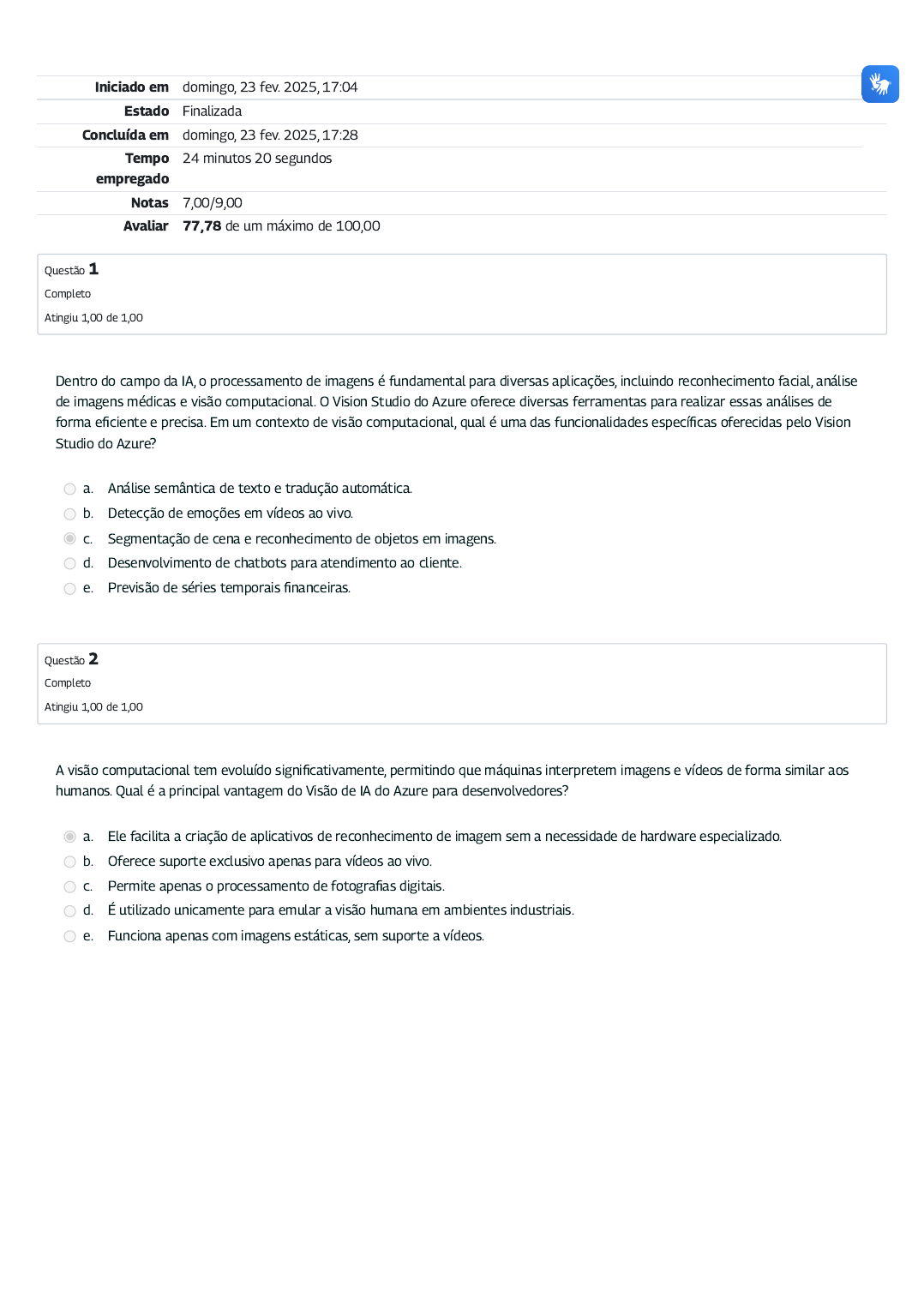 Iniciado em domingo, 23 fev. 2025, 17:04 Estado Finalizada Concluída em domingo, 23 fev. 2025, 17:28 Tempo empregado 24 minutos 20 segundos Notas 7,00/9,00 Avaliar 77,78 de um máximo de 100,00 Questão 1 Completo Atingiu 1,00 de 1,00 Questão 2 Completo Atingiu 1,00 de 1,00 Dentro do campo da IA, o processamento de imagens é fundamental para diversas aplicações, incluindo reconhecimento facial, análise de imagens médicas e visão computacional. O Vision Studio do Azure oferece diversas ferramentas para realizar essas análises de forma eficiente e precisa. Em um contexto de visão computacional, qual é uma das funcionalidades específicas oferecidas pelo Vision Studio do Azure? a. Análise semântica de texto e tradução automática. b. Detecção de emoções em vídeos ao vivo. c. Segmentação de cena e reconhecimento de objetos em imagens. d. Desenvolvimento de chatbots para atendimento ao cliente. e. Previsão de séries temporais financeiras. A visão computacional tem evoluído significativamente, permitindo que máquinas interpretem imagens e vídeos de forma similar aos humanos. Qual é a principal vantagem do Visão de IA do Azure para desenvolvedores? a. Ele facilita a criação de aplicativos de reconhecimento de imagem sem a necessidade de hardware especializado. b. Oferece suporte exclusivo apenas para vídeos ao vivo. c. Permite apenas o processamento de fotografias digitais. d. É utilizado unicamente para emular a visão humana em ambientes industriais. e. Funciona apenas com imagens estáticas, sem suporte a vídeos. Questão 3 Completo Atingiu 1,00 de 1,00 Questão 4 Completo Atingiu 0,00 de 1,00 Questão 5 Completo Atingiu 1,00 de 1,00 Com o avanço da tecnologia, o processamento de imagens tornou-se uma área crucial dentro da computação, permitindo desde simples edições até complexas análises de dados visuais. Do ponto de vista da ciência da computação, qual é a definição mais precisa de uma imagem? a. Uma estrutura de dados que armazena apenas cores em formato hexadecimal. b. Uma matriz bidimensional de pixels, onde cada pixel possui atributos como cor e intensidade de luz. c. Uma sequência de comandos que descreve a aparência visual de um objeto. d. Um array unidimensional de números inteiros que representem as intensidades de cor em escala de cinza. e. Um gráfico vetorial composto de fórmulas matemáticas para renderização. O serviço de Detecção Facial de IA do Azure permite a detecção e análise de rostos em imagens, sendo uma poderosa ferramenta no campo da Visão Computacional. Qual é a principal aplicação do serviço de Detecção Facial de IA do Azure? a. Gerenciamento de acesso em bares baseado em reconhecimento facial. b. Previsão meteorológica avançada. c. Monitoramento climático contínuo. d. Identificação e autenticação de usuários através de imagens. e. Análise e detecção de fraudes financeiras. A análise facial é uma das áreas mais fascinantes da inteligência artificial, com aplicação em diversas áreas da segurança até a personalização de serviços. Qual é a principal funcionalidade dos algoritmos de análise facial em IA? a. Identificar características faciais específicas em imagens ou vídeos. b. Modificar a aparência de rostos em tempo real. c. Realizar diagnósticos médicos com base em expressões faciais. d. Criar avatares virtuais a partir de rostos humanos. e. Gerar imagens faciais artificiais em base em rostos reais. Questão 6 Completo Atingiu 1,00 de 1,00 Questão 7 Completo Atingiu 1,00 de 1,00 Questão 8 Completo Atingiu 1,00 de 1,00 A detecção e reconhecimento facial têm diversas aplicações que abrangem segurança, mídia social, monitoramento, publicidade e validação de identidade. Qual é uma aplicação inovadora para o reconhecimento facial em automóveis mencionada no texto? a. Marcar automaticamente os amigos em fotos. b. Desbloquear dispositivos como smartphones. c. Monitorar o rosto do motorista para sinais de cansaço. d. Direcionar anúncios para um público-alvo demográfico apropriado. e. Identificar pessoas desaparecidas em câmeras públicas. A capacidade de leitura e processamento de textos por sistemas de IA envolve uma combinação de visão computacional e processamento de linguagem natural. Inicialmente desenvolvida para automatizar a classificação de correspondências postais, essa tecnologia evoluiu significativamente. Hoje, modelos avançados são capazes de detectar e ler textos impressos ou manuscritos em imagens, decodificando-os linha por linha e palavra por palavra. Como o OCR (Reconhecimento Óptico de Caracteres) contribuiu para a classificação automática de correspondências postais? a. Identificando e separando automaticamente as imagens das correspondências. b. Lendo e interpretando os CEPs nas correspondências para classificá-las. c. Reconhecendo a caligrafia dos remetentes e destinatários. d. Convertendo arquivos de imagem em texto para facilitar a leitura. e. Traduzindo os textos das correspondências para múltiplos idiomas. O serviço Visão de IA do Azure fornece uma ferramenta poderosa para extração de textos de imagens através de OCR (Reconhecimento Óptico de Caracteres). Esta tecnologia permite que textos legíveis por computador sejam extraídos de diversas fontes visuais, como imagens, PDFs e arquivos TIFF. Conforme o que foi estudado, escolha a alternativa que melhor descreve a função das coordenadas de caixa delimitadora na API de Leitura da Visão de IA do Azure. a. Identificar a cor predominante no texto extraído de uma imagem. b. Determinar a quantidade de ruído visual presente na imagem. c. Indicar a posição exata do texto na imagem, incluindo páginas, linhas e palavras. d. Definir o formato e o tipo do arquivo de imagem usado para OCR. e. Selecionar automaticamente o modelo de reconhecimento adequado para uma imagem. Questão 9 Completo Atingiu 0,00 de 1,00 Ao utilizar o Estúdio de Visão de IA do 