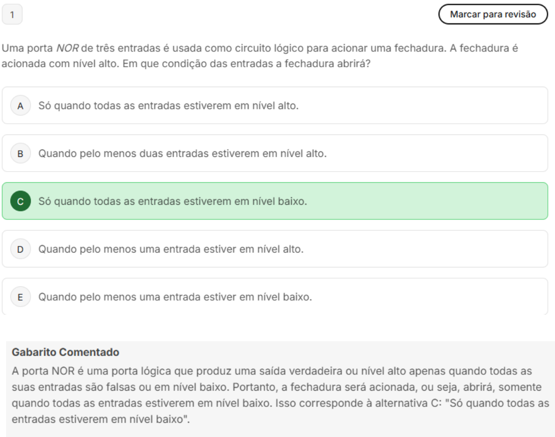 1 Marcar para revisão Uma porta NOR de três entradas é usada como circuito lógico para acionar uma fechadura. A fechadura é acionada com nível alto. Em que condição das entradas a fechadura abrirá? A Só quando todas as entradas estiverem em nível alto. B Quando pelo menos duas entradas estiverem em nível alto. C Só quando todas as entradas estiverem em nível baixo. D Quando pelo menos uma entrada estiver em nível alto. E Quando pelo menos uma entrada estiver em nível baixo. Gabarito Comentado A porta NOR é uma porta lógica que produz uma saída verdadeira ou nível alto apenas quando todas as suas entradas são falsas ou em nível baixo. Portanto, a fechadura será acionada, ou seja, abrirá, somente quando todas as entradas estiverem em nível baixo. Isso corresponde à alternativa C: "Só quando todas as entradas estiverem em nível baixo".2 Marcar para revisão desvio da variável controlada em relação ao ajustado é denominado: A Erro B Tempo morto C Atraso no processo D Falta de controle E Desnível Gabarito Comentado termo "erro" é usado para descrever desvio da variável controlada em relação ao valor ajustado. Isso ocorre quando a variável controlada não atinge o valor desejado ou ajustado, resultando em um "erro". Portanto, a alternativa correta é a letra A, "Erro".3 Marcar para revisão Você precisa especificar um módulo de entrada para um CLP que lerá a tensão nos terminais de um resistor de 20 ohms, no qual passa uma corrente contínua de até 10 amperes. Qual deve ser a capacidade de leitura da entrada desse módulo do CLP? A Pelo menos de 0 a 20 volts B Pelo menos de 0 a 5 volts C Pelo menos de 0 a 200 volts D Pelo menos de 0 a 127 volts E Pelo menos de 0 a 10 volts Gabarito Comentado A alternativa correta é a letra C, que indica que a capacidade de leitura da entrada do módulo do CLP deve ser de pelo menos 0 a 200 volts. Isso se deve ao fato de que, pela lei de Ohm, a tensão (V) é igual ao produto da resistência (R) pela corrente (I). Neste caso, temos uma resistência de 20 ohms e uma corrente de até 10 amperes, que resulta em uma tensão de até 200 volts. Portanto, o módulo de entrada do CLP deve ser capaz de ler uma tensão de até 200 volts.4 Marcar para revisão conjunto de tecnologias que resulta na operação de máquinas e sistemas sem intervenção humana significativa, atingindo um desempenho superior à operação manual é chamado de: A Instrumentação B Sistema de controle C Mecatrônica D Automação E Monitoração Gabarito Comentado termo que define conjunto de tecnologias que permite a operação de máquinas e sistemas sem a necessidade de intervenção humana significativa, proporcionando um desempenho superior ao da operação manual, é a "Automação". A automação envolve uso de sistemas de controle e tecnologias de informação para reduzir a necessidade de trabalho humano em produção de bens e serviços. Portanto, a alternativa correta é a letra D: Automação.5 Marcar para revisão Um controlador simplificado é, essencialmente, um: A Amplificador B Atuador C Sensor D Comparador E Registrador Gabarito Comentado Um controlador simplificado é, em sua essência, um comparador. Isso porque a função principal de um controlador é comparar valor atual de uma variável com valor desejado (referência) e, com base nessa comparação, gerar um sinal de controle que atuará no sistema para minimizar a diferença entre esses dois valores. Portanto, a alternativa correta é a letra D: Comparador.6 Marcar para revisão ) Não é um "elemento de controle final": A Transmissor de pressão B Motor elétrico C Elemento de aquecimento D Válvula de controle E Relé Gabarito Comentado "elemento de controle final" é a parte do sistema de controle que executa uma ação física para alterar processo com base no sinal de controle recebido. Isso inclui dispositivos como motores elétricos, elementos de aquecimento, válvulas de controle e relés. No entanto, um transmissor de pressão não é um "elemento de controle final". Ele é um dispositivo que mede a pressão e a converte em um sinal elétrico para ser lido por um instrumento de controle. Portanto, a alternativa correta é o transmissor de pressão.7 Marcar para revisão Qual é o consumo máximo de energia de um circuito alimentado por duas pilhas de 1,5 volts que consome, no máximo, 240 mA (10-3 amperes) de corrente? A 0,72 watts B 3,6 watts C 72 watts D 1,72 watts E 0,36 watts Gabarito Comentado consumo máximo de energia de um circuito é calculado pela multiplicação da tensão (em volts) pela corrente (em amperes). Neste caso, temos duas pilhas de 1,5 volts, totalizando 3 volts, e uma corrente máxima de 240 mA, ou 0,24 amperes. Ao multiplicar 3 volts por 0,24 amperes, obtemos 0,72 watts, que é consumo máximo de energia do circuito. Portanto, a alternativa correta é a A: 0,72 watts.8 Marcar para revisão Assinale a alternativa que apresenta um dispositivo de entrada para um CLP: A Motor B Lâmpada C Válvula D Solenoide E Termopar Gabarito Comentado termopar é um dispositivo de entrada para um CLP (Controlador Lógico Programável). Ele é um sensor de temperatura que gera uma tensão proporcional à diferença de temperatura entre dois pontos, sendo assim, é capaz de fornecer informações para CLP. As outras opções listadas (motor, lâmpada, válvula e solenoide) são, na verdade, dispositivos de saída, pois recebem informações do CLP para executar uma ação.9 Marcar para revisão Na planta para alterar a sequência de operação, CLP pode ser: A Apenas programado B Apenas reprogramado C Programado e reprogramado várias vezes D Reprogramado uma vez E Religado uma vez Gabarito Comentado Controlador Lógico Programável (CLP) é uma ferramenta extremamente versátil e fundamental em processos industriais. Ele pode ser programado inicialmente para realizar uma determinada sequência de operações. No entanto, se houver necessidade de alterar essa 