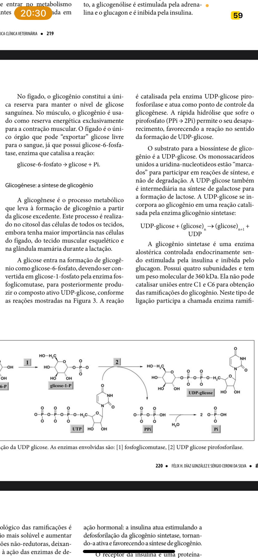 e entrar no metabolismo to, a glicogenólise é estimulada pela adrena- intes 20:30 ada em lina e o glucagon e é inibida pela insulina. 59 ICA CLÍNICA VETERINÁRIA 219 No fígado, o glicogênio constitui a é catalisada pela enzima UDP-glicose piro- ca reserva para manter o nível de glicose fosforilase e atua como ponto de controle da sanguínea. No músculo, o glicogênio é usa- glicogênese. A rápida hidrólise que sofre o do como reserva energética exclusivamente pirofosfato (PPi 2Pi) permite o seu desapa- para a contração muscular. fígado é o recimento, favorecendo a reação no sentido CO órgão que pode "exportar" glicose livre da formação de UDP-glicose. para o sangue, já que possui glicose-6-fosfa- substrato para a biossíntese de glico- tase, enzima que catalisa a reação: gênio é a UDP-glicose. Os monossacarídeos glicose-6-fosfato glicose + Pi. unidos a estão "marca- dos" para participar em reações de síntese, e não de degradação. A UDP-glicose também Glicogênese: a síntese de glicogênio é intermediária na síntese de galactose para A glicogênese é o processo metabólico a formação de lactose. A UDP-glicose se in- que leva à formação de glicogênio a partir corpora ao glicogênio em uma reação catali- da glicose excedente. Este processo é realiza- sada pela enzima glicogênio sintetase: do no citosol das células de todos os tecidos, UDP-glicose + (glicose) (glicose) + embora tenha maior importância nas células UDP do fígado, do tecido muscular esquelético e A glicogênio sintetase é uma enzima na glândula mamária durante a lactação. alostérica controlada endocrinamente sen- A glicose entra na formação de glicogê- do estimulada pela insulina e inibida pelo nio como glicose-6-fosfato, devendo ser con- glucagon. Possui quatro subunidades e tem vertida em glicose- -fosfato pela enzima fos- um peso molecular de 360 kDa. Ela não pode foglicomutase, para posteriormente produ- catalisar uniões entre C1 e C6 para obtenção zir o composto ativo UDP-glicose, conforme das ramificações do glicogênio. Neste tipo de as reações mostradas na Figura 3. A reação ligação participa a chamada enzima ramifi- NH 1 2 OH HO o P o HO H,C N o o OH HO OH HO o o o glicose-1-P o 6-P HO OH UDP-glicose HO OH NH N o o o o o o o OH 2 OH o o o H2O UTP HO OH PP Pi ção da UDP glicose. As enzimas envolvidas são: [1] fosfoglicomutase, [2] UDP glicose pirofosforilase. 220 FÉLIX SÉRGIO CERONI DA SILVA g ológico das ramificações é ação hormonal: a insulina atua estimulando a io mais solúvel e aumentar defosforilação da glicogênio sintetase, tornan- não-redutoras, deixan- ativa e favorecendo a síntese de glicogênio. à ação das enzimas de de- receptor da insulina e uma proteína-