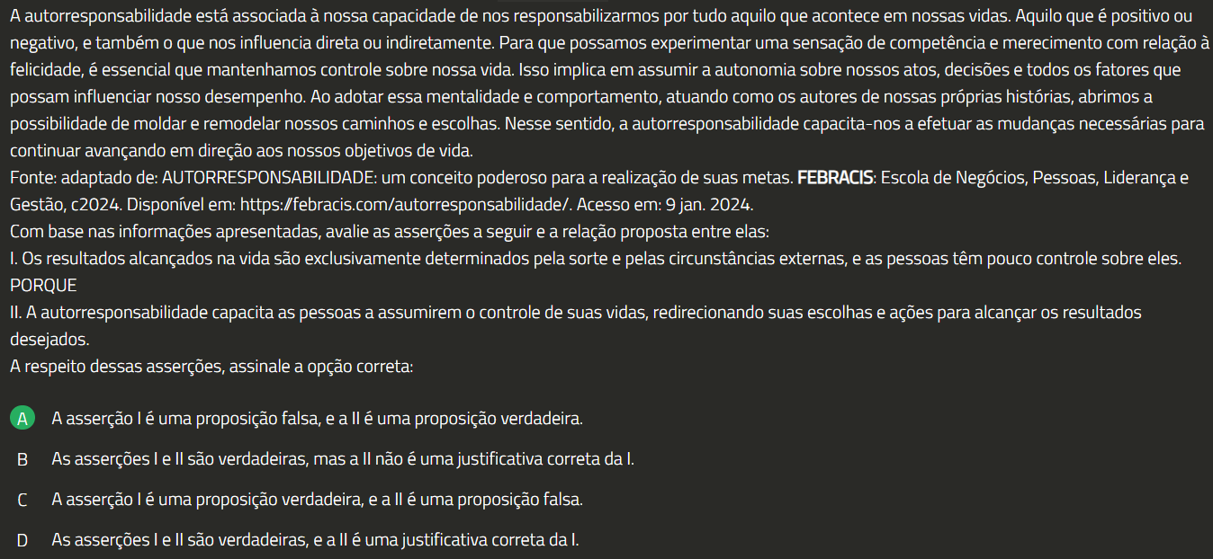 A autorresponsabilidade está associada à nossa capacidade de nos responsabilizarmos por tudo aquilo que acontece em nossas vidas. Aquilo que é positivo ou negativo, e também que nos influencia direta ou indiretamente. Para que possamos experimentar uma sensação de competência e merecimento com relação à felicidade, é essencial que mantenhamos controle sobre nossa vida. Isso implica em assumir a autonomia sobre nossos atos, decisões e todos os fatores que possam influenciar nosso desempenho. Ao adotar essa mentalidade e comportamento, atuando como os autores de nossas próprias histórias, abrimos a possibilidade de moldar e remodelar nossos caminhos e escolhas. Nesse sentido, a autorresponsabilidade capacita-nos a efetuar as mudanças necessárias para continuar avançando em direção aos nossos objetivos de vida. Fonte: adaptado de: AUTORRESPONSABILIDADE: um conceito poderoso para a realização de suas metas. FEBRACIS: Escola de Negócios, Pessoas, Liderança e Gestão, c2024. Disponível em: https://febracis.com/autorresponsabilidade/ Acesso em: 9 jan. 2024. Com base nas informações apresentadas, avalie as asserções a seguir e a relação proposta entre elas: I. Os resultados alcançados na vida são exclusivamente determinados pela sorte e pelas circunstâncias externas, e as pessoas têm pouco controle sobre eles. PORQUE II. A autorresponsabilidade capacita as pessoas a assumirem controle de suas vidas, redirecionando suas escolhas e ações para alcançar os resultados desejados. A respeito dessas asserções, assinale a opção correta: A A asserção I é uma proposição falsa, e a II é uma proposição verdadeira. B As asserções e II são verdadeiras, mas a II não é uma justificativa correta da I. C A asserção I é uma proposição verdadeira, e a II é uma proposição falsa. D As asserções I e II são verdadeiras, e a II é uma justificativa correta da I.