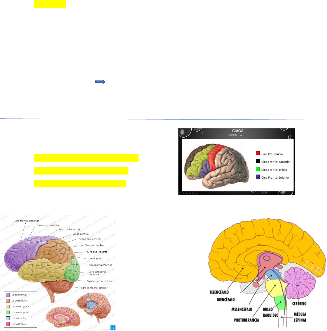 Neuroanatomia Livro netteler (telencéfalo) Aula Pratica 1 Pratica 1 (A contração e dilatação da pupila é relacionado ao nervo óptico) 3 Diagnósticos em uma avaliação · Diagnostico sindrômico · Topográfico = Raciocínio neurológico · Etiológico Síndromes neurológicas Giro: Gomos Sulco/Fissuras: Profundo/ saliencias Principal sulco do cérebro = Sulco central Sulco lateral destaca o lobo temporal (divisor da porção motora/sensitiva) Fissura longitudinal: Divide o cérebro em dois hemisférios, direito e esquerdo. Divisao do encéfalo TDMPB) CEREBRO, TRONCO ENCEFALICO E CEREBELO Fissura lateral (ou fissura de Sylvius): delimita o lobo temporal cerebral. Fissura central: Divide o cérebro em dois hemisférios motora e a área sensorial. Fissura parieto-occipital: Separa o lobo parietal e o lobo occipital, localizando-se na parte posterior do cérebro. Fissura calcarina: Localizada no lobo occipital, é importante para o processamento visual, marcando a separação da área visual primária. Fissura do cíngulo: Localizada ao redor do corpo caloso, está associada ao sistema límbico e está envolvida em funções emocionais e cognitivas. Fissura de tentório (ou tentorial): Separa o lobo temporal e o lobo occipital do cérebro da região do cerebelo. (Sulco lateral destaca o lobo temporal) Aula teórica 1 Estudo dos planos Planos: axial/sagital/coronal/transverso Telencéfalo O telencéfalo compreendo os dois hemisférios cerebrais e a lâmina terminas situada Na porção anterior do III ventrículo. Os dois hemisférios cerebrais são unidos larga faixa de fibras comissurais, o corpo caloso. Os hemisférios cerebrais possuem cavidades, os ventrículos laterais direito e esquerdo se comunicam com o terceiro ventrículo pelos forames interventriculares. Cada hemisfério possui três polos, frontal temporal occipital. Tem setores da linguagem que só está presente em um hemisfério. Encéfalo: É a parte do sistema nervoso central que está dentro do crânio. Inclui o cérebro, o cerebelo e o tronco encefálico (bulbo, ponte, diencefalo mesencéfalo). Em resumo, o encéfalo é todo o conjunto de órgãos dentro do crânio responsáveis pelas funções motoras, sensoriais e cognitivas. TELENCEFALO É apenas uma das partes do encéfalo. Está localizado na parte superior do encéfalo e é responsável por funções como o pensamento, emoções, memória, percepção sensorial, e controle motor voluntário. O cérebro é dividido em dois hemisférios (esquerdo e direito) e várias áreas especializadas. OBS: Retina: da retina sai o nervo OPTICO parte de suas fibras vao para o lodo occipital sem se cruzar, parte delas cruzam e é denominada quiasma optico. Tronco encefálico é composto de mesencéfalo ponte e bulbo O telencéfalo é dividido pela: Fissura longitudinal e é unida pelo corpo caloso. O corpo caloso é uma grande estrutura de fibras nervosas que conecta os dois hemisférios cerebrais, permitindo a comunicação entre eles. Ele é composto principalmente por axônios (prolongamentos das células nervosas) que transmitem informações de um hemisfério para o outro. Maior comissura do sistema nervoso central. Funções de cada lobo do telencéfalo Homúnculo de penfild Meninges possuem três camadas: Dura mater, arachnoid, pia mater Dura-máter: É a camada mais externa e espessa das meninges, composta por tecido conjuntivo denso e fibroso. Ela proporciona uma proteção mecânica robusta ao sistema nervoso central. Aracnoide: A aracnoide é uma camada fina e avascular que fica entre a dura-máter e a pia-máter. Ela é caracterizada por uma rede de fibras que lhe conferem uma estrutura semelhante a uma teia de aranha. Entre a aracnoide e a pia-máter existe o espaço subaracnoideo, que contém o líquido cefalorraquidiano (LCR), que tem a função de amortecer o cérebro e a medula espinhal. Pia-máter: A pia-máter é a camada mais interna das meninges, constituída por um tecido muito fino e vascularizado que adere diretamente à superfície do cérebro e da medula espinhal. Ela acompanha todos os sulcos e giros do cérebro, formando um envoltório que contém os vasos sanguíneos responsáveis pela irrigação cerebral. Glândulas: Pituitária/ hipófise Uma lesão no quiasma optico resulta em uma perda de visão periférica. Um tumor na região hipófise pode influenciar na visão periférica. A sensibilidade para pelo tálamo. Síndrome pós concussão O sulco calcarino é responsável pela visão da área primaria Área primaria motora * Aula primaria da audição * Pares cranianos 1- Olfatório Aula teórica 2 Capitulo telencéfalo netter Amaurose: Perda da visão Lobo frontal: Area primaria motora (Sulco pre central) Giros: Superior médio inferior Area de brocar: Hemisferio esquerdo responsável pela linguagem expressão, olhar conjugado Função Controle do movimento, atenção, concentração, inibição (Maturidade), Memoria de curto prazo, frontal Lobo pariental: Área primária sensitiva (Sulco Pos central) Função: Localização espacial, leitura, recepção e pensamento sensorial. Lobo temporal A área primaria da audição está localizada no giro trasverso do lobo tempotral Decodifica o sinal aferente, a compreensão da linguagem. Lobo mais epileptogenico Fissura calcarina: Area primaria da visão. Responsável pelo processamento da visão Principal função: processamento visual Lobo insular: Funcoes, Processamento, interações amororas, dor Estudar segundo netter.. image6.jpeg image7.png image8.png image9.png image1.jpeg image2.jpeg image3.png image4.png image5.png