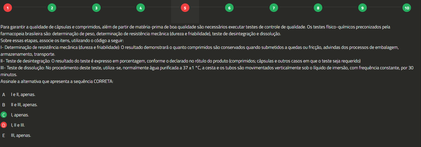 1 2 3 4 5 6 7 8 9 10 Para garantir a qualidade de cápsulas e comprimidos, além de partir de matéria-prima de boa qualidade são necessários executar testes de controle de qualidade. Os testes físico-químicos preconizados pela farmacopeia brasileira são: determinação de peso, determinação de resistência mecânica (dureza e friabilidade), teste de desintegração e dissolução. Sobre essas etapas, associe os itens, utilizando código a seguir: I- Determinação de resistência mecânica (dureza e friabilidade): resultado demonstrará quanto comprimidos são conservados quando submetidos a quedas ou fricção, advindas dos processos de embalagem, armazenamento, transporte. II- Teste de resultado do teste é expresso em porcentagem, conforme declarado no rótulo do produto (comprimidos; cápsulas e outros casos em que teste seja requerido) III- Teste de dissolução: No procedimento deste teste, utiliza-se, normalmente água purificada a 37 °C, a cesta e os tubos são movimentados verticalmente sob líquido de imersão, com frequência constante, por 30 minutos. Assinale a alternativa que apresenta a CORRETA: A I e II, apenas. B II e III, apenas. I, apenas. D I, II e III. E III, apenas.