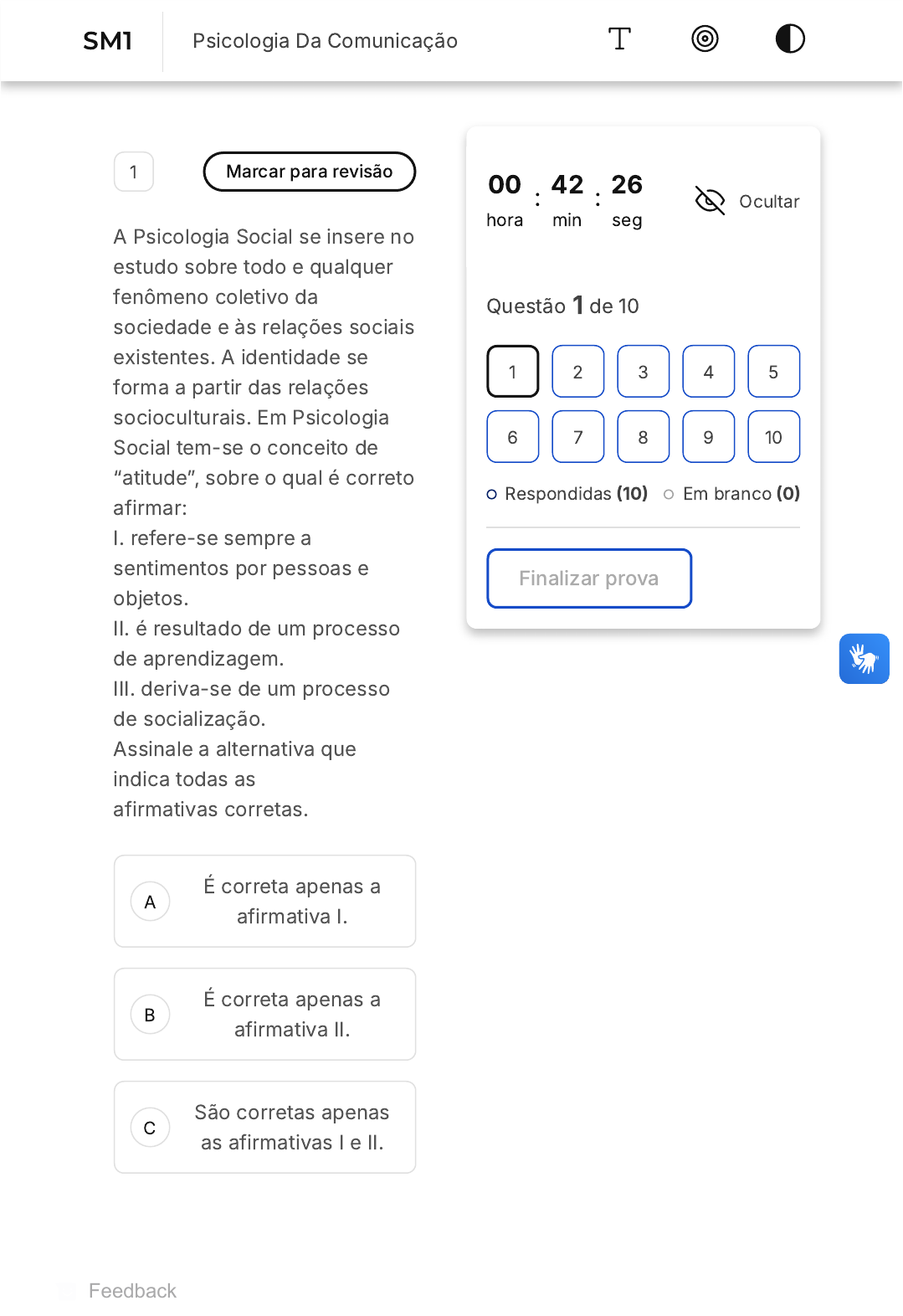 A B C 1 Marcar para revisão A Psicologia Social se insere no estudo sobre todo e qualquer fenômeno coletivo da sociedade e às relações sociais existentes. A identidade se forma a partir das relações socioculturais. Em Psicologia Social tem-se o conceito de “atitude”, sobre o qual é correto afirmar: I. refere-se sempre a sentimentos por pessoas e objetos. II. é resultado de um processo de aprendizagem. III. deriva-se de um processo de socialização. Assinale a alternativa que indica todas as afirmativas corretas. É correta apenas a afirmativa I. É correta apenas a afirmativa II. São corretas apenas as afirmativas I e II. 00 hora : 42 min : 26 seg Ocultar Questão 1 de 10 Respondidas (10) Em branco (0) Finalizar prova 1 2 3 4 5 6 7 8 9 10 SM1 Psicologia Da Comunicação Feedback D E A B C D E São corretas apenas as afirmativas II e III. São corretas apenas as afirmativas I e III. 2 Marcar para revisão Manifestam-se em palavras, sentimentos e condutas e se institucionalizam; portanto, podem e devem ser analisadas a partir da compreensão das estruturas e dos comportamentos sociais. Na Psicologia Social, são denominadas por: hábitos parentais. normas pessoais. representações sociais. políticas públicas. grupos sociais. A B C 3 Marcar para revisão A Psicologia Social é o estudo científico do comportamento humano em situações sociais, incluindo interações com outras pessoas ou expectativas dessas interações, bem como os processos mentais resultantes dessas interações. Em síntese, a partir das contribuições da Psicologia Social, pode-se conceber a noção de consciência social com: a crença de que, apesar de termos determinadas inclinações, a neutralidade deve pautar nosso senso moral. um modo de se colocar diante dos fenômenos sociais, ciente de que somos impermeáveis aos valores dominantes de determinado período histórico. a percepção de que uma sociedade é construída a partir de relações entre os indivíduos e as instituições. D E A B C a aposta ética de que cada sujeito é capaz de transformar a realidade a partir de sua própria essência. a consciência individual da própria condição histórica é suficiente para formar a consciência necessária para transformar a sociedade. 4 Marcar para revisão Compartilhamento de valores, crenças, papéis desempenhados nos grupos de que o indivíduo participa, bem como o meio ambiente e a localização geográfica, tendo em vista seu contexto cultural. Essa definição se refere a qual conceito? Biotipo. Conhecimento. Comunidade cultural. D E A B Personalidade. Consciência coletiva. 5 Marcar para revisão Um grupo de referência é aquele no qual o indivíduo é motivado a manter relações e que exerce forte papel normativo em seu comportamento. Considerando o grupo família, analise as informações abaixo e assinale a alternativa CORRETA. I. É dispensável para a análise da relação entre a construção do sujeito e o meio sociocultural. II. Se constitui como a primeira instituição com a qual os indivíduos mantêm contato e estabelecem relações. III. É responsável pela educação e socialização de seus membros. É CORRETO o que está afirmado em: apenas as alternativas I e II estão corretas. apenas a alternativa I está correta. C D E A B C D E apenas as alternativas II e III estão corretas. apenas a alternativa II está correta. apenas a alternativa III está correta. 6 Marcar para revisão A percepção social está entre os principais conceitos da Psicologia Social, que ao estudar a interação social, aponta que a percepção do outro é uma forma de comunicação que depende da atribuição de significado à situação: futura. comparada. vivida. escolhida. imaginada. A B 7 Marcar para revisão O estudo dos processos grupais e a influência social que exercem são temas de longa história de pesquisas em psicologia social. De maneira geral, um grupo consiste em três ou mais pessoas que interagem e são interdependentes, no sentido de que suas necessidades e objetivos se influenciam mutuamente. Além disso, os grupos aos quais pertencemos variam de tamanho, de poucos a milhares de membros. Essas características levam aos estudos de outros processos como pensamento, decisão e polarização grupais. Sobre a polarização grupal, assinale a afirmativa correta. Tomada de decisão com base em todas as inclinações individuais dos membros de um grupo. Tendência de os grupos tomarem decisões mais extremas que as inclinações iniciais de seus membros. C D E Ação benéfica para um indivíduo escolhida pela maioria de um grupo mesmo com efeitos prejudiciais sobre todos. Pensamento que mantém a coesão do grupo, visto que a solidariedade é mais importante que considerar os fatos de forma realista. Forma de comunicação entre lados opostos, geralmente em conflito, de modo que as ofertas e as contraofertas são feitas e a solução é alcançada apenas com consenso total. 8 Marcar para revisão É frequente observar o sofrimento decorrente da discriminação, manifestado em palavras, sentimentos e comportamentos. Essa discriminação, muitas vezes institucionalizada, reflete estruturas sociais e padrões de comportamento que moldam as A B C D E representações sociais dos indivíduos, influenciando sua percepção de si mesmos e de seu ambiente. No atendimento a pessoas em situação de vulnerabilidade social é comum a identificação de sofrimento decorrente de discriminação, que se refere a: um prejulgamento sobre o caráter ou identidade de alguém. uma marca ou imagem que define uma identidade social. uma ação ou omissão em função de processos de estigmatização. uma ideia e atributo negativo dirigida ao que não se conhece. uma inclusão do objeto desconhecido em uma categoria social. 9 Marcar para revisão A teoria das Representações Sociais é uma forma A B C D E sociológica de psicologia social, originada na Europa com Serge Moscovici. As representa