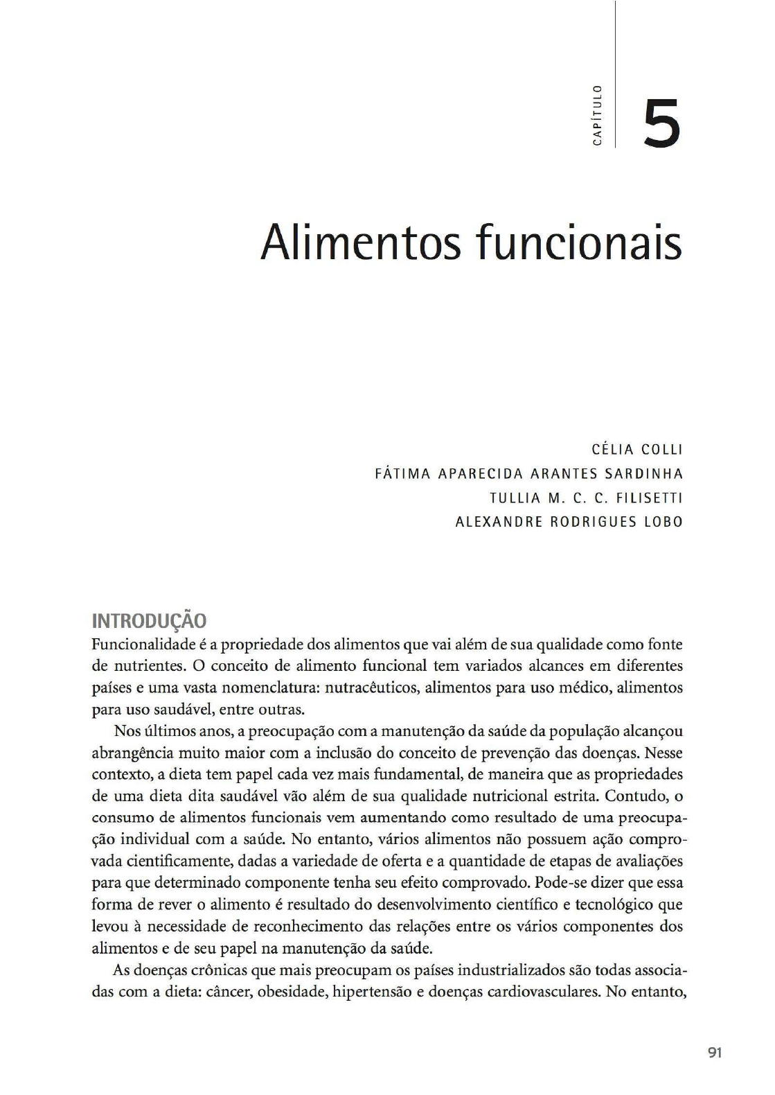 5 Alimentos funcionais CÉLIA COLLI FÁTIMA APARECIDA ARANTES SARDINHA TULLIA M. C. FILISETTI ALEXANDRE RODRIGUES LOBO INTRODUÇÃO Funcionalidade é a propriedade dos alimentos que vai além de sua qualidade como fonte de nutrientes. conceito de alimento funcional tem variados alcances em diferentes países e uma vasta nomenclatura: nutracêuticos, alimentos para uso médico, alimentos para uso saudável, entre outras. Nos últimos anos, a preocupação com a manutenção da saúde da população alcançou abrangência muito maior com a inclusão do conceito de prevenção das doenças. Nesse contexto, a dieta tem papel cada vez mais fundamental, de maneira que as propriedades de uma dieta dita saudável vão além de sua qualidade nutricional Contudo, o consumo de alimentos funcionais vem aumentando como resultado de uma preocupa- ção individual com a saúde. No entanto, vários alimentos não possuem ação compro- vada cientificamente, dadas a variedade de oferta e a quantidade de etapas de avaliações para que determinado componente tenha seu efeito comprovado. Pode-se dizer que essa forma de rever o alimento é resultado do desenvolvimento científico e tecnológico que levou à necessidade de reconhecimento das relações entre os vários componentes dos alimentos e de seu papel na manutenção da saúde. As doenças crônicas que mais preocupam os países industrializados são todas associa- das com a dieta: câncer, obesidade, hipertensão e doenças cardiovasculares. No entanto, 9192 dada a complexidade dessas citadas inter-relações entre os componentes dos alimentos, traçar uma relação de causa e efeito inequívoca e definitiva é praticamente impossível. NO Assim, para este capítulo, optou-se por abordar alguns alimentos funcionais ou ingre- dientes funcionais que têm sua atividade razoavelmente A literatura a respeito de tais alimentos é vasta e heterogênea (Tabela 5.1), sendo necessário, antes de mais nada, identificar em que estágio se encontra o conhecimento de determinado item para que o profissional da saúde possa pensar em utilizá-lo em sua prática diária. DE TABELA 5.1 EXEMPLOS DE ALIMENTOS FUNCIONAIS Nutrientes Fontes Funções Ácidos graxos poli- Peixes, algas marinhas, Intervenção na coagulação do sangue -insaturados óleos (soja, girassol, oliva) Controle de processos inflamatórios ômega-3 e ômega-6 Alicina Alho Redução do colesterol (sulfeto de dialina) Função hipotensora Função fibrinolítica e anticoagulante Prebióticos Almeirão, tupinambo, yacón, Manutenção da saúde intestinal cebola, alho, banana Melhoria da biodisponibilidade de minerais Probióticos Bebidas lácteas com lactoba- Aumento da resistência a infecções cilos (leites fermentados), Impedimento da colonização por bactérias bifidobactérias (iogurtes) patogênicas Redução do colesterol Fibra alimentar Cereais (aveia, pão), As fibras dos cereais previnem doenças (amido) verduras (repolho, cardiovasculares couve-de-bruxelas), As verduras protegem contra câncer de leguminosas (feijão, vagem, cólon e de reto lentilha) 0 amido presente em cereais e leguminosas previne câncer de cólon e reduz 0 colesterol Fitoestrogênios, Leguminosas (feijão e soja), Redução do estrogênio, atuando na pre- 5 isoflavonas e cereais venção do câncer de mama lignanas Flavonoides Vinho tinto, Antioxidantes uva Inibição da formação de ateromas Licopeno Proteção contra tumores de pulmão, toranja vermelha de próstata e de estômago Vitaminas A, C e E, Frutas (caqui, mamão, laranja, Antioxidantes betacaroteno, limão, acerola), hortaliças selênio e (beterraba, espinafre, cenou- zinco ra, tomate, brócolis, repolho), ovos, cereais Fonte: Arabbi, 1999.93 A definição de alimento funcional adotada neste capítulo é a da legislação brasileira, que considera alegação de propriedade funcional aquela relativa ao papel metabólico ou fisiológico que o nutriente ou não nutriente tem no crescimento, desenvolvimento, manutenção e outras funções normais do organismo e alega- ção de propriedade de saúde aquela que sugere, afirma ou implica a existência de relação entre alimento ou ingrediente com doença ou condição relacionada à saúde (Resolução n. 18, de 30 de abril de 1999). A legislação japonesa, por exemplo, reconhece como promotores da saúde os seguintes compostos: fibra da dieta (ou fibra alimentar FA), colinas, bactérias acidoláticas, minerais e ácidos graxos poli-insaturados, prevendo a inclusão de outros itens, como os oligossaca- rídeos, peptídeos e proteínas, isoprenoides e vitaminas. Os alimentos funcionais correspon- dem a 5 a 7% do mercado mundial de alimentos. Há uma demanda excessiva e, paralela- mente, uma dificuldade da efetiva comprovação de resultados do consumo desses alimentos. Brasil, por sua vez, é rico em produtos naturais e alimentos ainda inexplorados. Assim, cabe aos profissionais de saúde, a difícil tarefa de, por um lado, dirigir pesquisas que possam comprovar a eficácia desses novos produtos, e por outro, mais premente, orientar uma legislação que garanta à população os benefícios e a proteção referentes a possíveis riscos de sua utilização. As indagações que existem até hoje se relacionam com o benefício real que pode advir da inclusão de alimentos funcionais na dieta das populações, com a possibilidade de indução de hábitos alimentares inadequados ou de uma sensação equivocada de garan- tias quanto à saúde geral. FIBRA ALIMENTAR, PREBIÓTICOS E PROBIÓTICOS Fibra alimentar A definição exata de fibra alimentar (FA), ou fibra da dieta (FD), bem como os métodos utilizados para sua avaliação, não foi ainda muito bem estabelecida, apesar dos inúmeros debates em torno desse tema. Isto se deve, sobretudo, ao fato de que FA pode ser definida tanto pelos seus atributos fisiológicos quanto por sua composição química. 5 A FA é uma classe de compostos de origem vegetal, const