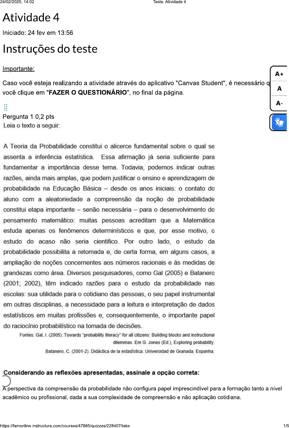 24/02/2025, 14:02 Teste: Atividade 4 Atividade 4 Iniciado: 24 fev em 13:56 Instruções do teste Importante: A+ Caso você esteja realizando a atividade através do aplicativo "Canvas Student", é necessário q A você clique em "FAZER no final da página. A- Pergunta 1 0,2 pts Leia o texto a seguir: A Teoria da Probabilidade constitui o alicerce fundamental sobre o qual se assenta a inferência estatística. Essa afirmação já seria suficiente para fundamentar a importância desse Todavia, podemos indicar outras razões, ainda mais amplas, que podem justificar o ensino e aprendizagem de probabilidade na Educação Básica - desde os anos iniciais: o contato do aluno com a aleatoriedade a compreensão da noção de probabilidade constitui etapa importante senão necessária para desenvolvimento do pensamento matemático: muitas pessoas acreditam que a Matemática estuda apenas os fenômenos determinísticos e que, por esse motivo, o estudo do acaso não seria cientifico. Por outro lado, o estudo da probabilidade possibilita a retomada e, de certa forma, em alguns casos, a ampliação de noções concernentes aos números racionais e às medidas de grandezas como área. Diversos pesquisadores, como Gal (2005) e Batanero (2001; 2002), têm indicado razões para o estudo da probabilidade nas escolas: sua utilidade para cotidiano das pessoas, o seu papel instrumental em outras disciplinas, a necessidade para a leitura e interpretação de dados estatísticos em muitas profissões e, consequentemente, o importante papel do raciocínio probabilístico na tomada de decisões. Fontes: Gal, I. (2005). Towards "probability for all citizens: Building blocks and instructional Em G. Jones (Ed.), Exploring probability. Batanero, C. (2001-2). Didáctica de la Universidad de Espanha. Considerando as reflexões apresentadas, assinale a opção correta: A perspectiva da compreensão da probabilidade não configura papel imprescindível para a formação tanto a nível acadêmico ou profissional, dada a sua complexidade de compreensão e não aplicação cotidiana. https://famonline.instructure.com/courses/47885/quizzes/228407/take 1/524/02/2025, 14:02 Teste: Atividade 4 E possível, por exemplo, calcular a probabilidade de que um ponto selecionado ao acaso a partir de uma região se localize numa determinada numa outra sub-região. A probabilidade de um evento A é a o produto entre o número de resultados (ou casos) favoráveis (à ocorrência de A) e o número de resultados possíveis. A+ Em todos os problemas de probabilidade há um conjunto de eventos possíveis que conhecemos, mas não sabemos quais desses eventos vão acontecer ou quando um evento particular acontecerá ou que ordem os A eventos irão acontecer. A- Probabilidade é um ramo da Matemática que tem por intuito estudar experimentos ou fenômenos certos e determinar exatamente as chances de ocorrência. Pergunta 2 0,2 pts Leia os textos a seguir: Texto I: Intervalo de confiança sempre é calculado selecionando-se primeiramente, o nível de confiança. Trata-se de uma medida do grau de confiabilidade com relação ao intervalo de confiança. Desse modo, para um intervalo de confiança de implica que 95% das amostras que inclui ou outro parâmetro qualquer, que esteja sendo estimado, e que apenas 5% de todas as amostras dariam um intervalo Fonte: J. L. Probabildade e estatística para engenharia e ciências/Jay L. Devore. São Paulo, SP: Cengage, 2018. Texto II: Se considerarmos uma amostra, por exemplo, com digitadores treinados para o exercício de suas funções foram selecionados e a altura preferida do teclado foi determinada para cada digitador A altura preferida média resultante da amostra foi = 80 cm. Suponha que a altura preferida tenha distribuição normal com = 2 cm e a altura média preferida pela população de todos os digitadores, dada o IC = Considerando a reflexão acima, avalie as afirmações abaixo: I. Um grau de confiança de 95% equivale a II. Consultado a tabela normal a probabilidade encontrada na cauda, temos que para 0,070 a área rejeitada será de 1,96. III. Podemos estar altamente confiantes, no IC de 95% que, É correto o que se afirma em: https://famonline.instructure.com/courses/47885/quizzes/228407/take 2/524/02/2025, 14:02 Teste: Atividade 4 apenas. III, apenas. e III, apenas. A+ III, apenas. A II, apenas. A- Pergunta 3 0,2 pts Leia os textos a seguir: Um engenheiro desconfiado de um processo de produção de bancadas para laboratório, que deveria ter uma produção com amostra padrão de 0,85 m, resolve investigar e verificar se essas amostras se encontram dentro do especificado. Assim, uma amostra de 8 valores foi coletada e indicou uma média de 0,87 m e desvio padrão de 0,010. Sabendo que os dados seguem a distribuição normal, teste a hipótese do engenheiro usando um nível de significância a = Considerando as reflexões apresentadas, assinale a opção correta. Ao nível de 5% de significância, concluí-se que o valor de referência sobre as alturas das bancadas, encontra-se abaixo dos valores de rejeição, logo, as produções estão fora das medidas especificadas. Ao nível de 5% de significância, concluí-se que o valor de referência sobre as alturas das bancadas, encontra-se entre os valores de rejeição, logo, as produções estão dentro das medidas especificadas. Ao nível de 5% de significância, nada pode concluir sobre as bancadas que estão sendo produzidas, e portanto, devem ser descartadas. Ao nível de 5% de significância, concluí-se que as bancadas que estão sendo produzidas devem ter altura que atende ao especificado, isto é, igual a 0,85 m. https://famonline.instructure.com/courses/47885/quizzes/228407/take 3/524/02/2025, 14:02 Teste: Atividade 4 Ao nível de 5% de significância, concluí-se que as bancadas que estão sendo produzidas devem ter altura diferente do especificado, maiores que 0,85 m. Pergunta pts Leia o texto a seguir: A+ A A população brasileira 