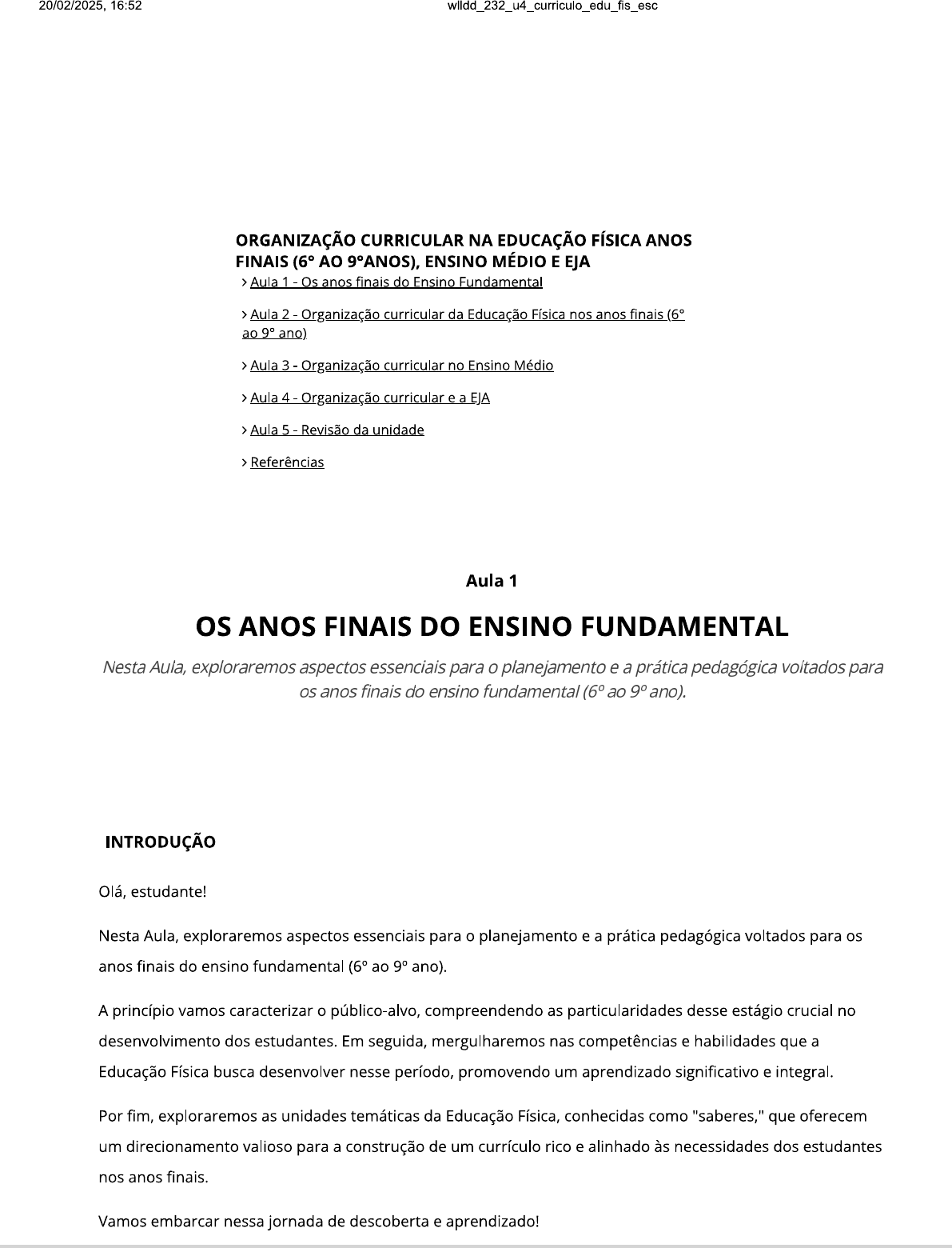 20/02/2025, 16:52 ORGANIZAÇÃO CURRICULAR NA EDUCAÇÃO FÍSICA ANOS FINAIS (6° AO 9°ANOS), ENSINO MÉDIO E EJA > Aula 1 Os anos finais do Ensino Fundamental > Aula 2 Organização curricular da Educação Física nos anos finais (6° ao 9° ano) > Aula 3 - Organização curricular no Ensino Médio > Aula 4 - Organização curricular e a EJA > Aula 5 - Revisão da unidade > Referências Aula 1 os ANOS FINAIS DO ENSINO FUNDAMENTAL Nesta Aula, exploraremos aspectos essenciais para o planejamento e a prática pedagógica voltados para os anos finais do ensino fundamental (6° ao 9° INTRODUÇÃO Olá, estudante! Nesta Aula, exploraremos aspectos essenciais para o planejamento e a prática pedagógica voltados para os anos finais do ensino fundamental (6° ao 9° ano). A princípio vamos caracterizar o público-alvo, compreendendo as particularidades desse estágio crucial no desenvolvimento dos estudantes. Em seguida, mergulharemos nas competências e habilidades que a Educação Física busca desenvolver nesse período, promovendo um aprendizado significativo e integral. Por fim, exploraremos as unidades temáticas da Educação Física, conhecidas como "saberes," que oferecem um direcionamento valioso para a construção de um currículo rico e alinhado às necessidades dos estudantes nos anos finais. Vamos embarcar nessa jornada de descoberta e aprendizado!20/02/2025, 16:52 CARACTERIZANDO E DEFININDO o ENSINO FUNDAMENTAL ANOS FINAIS A Educação Física desempenha um papel fundamental no desenvolvimento dos estudantes, especialmente nos anos finais do ensino fundamental (6° ao 9° ano). Nesse período, os alunos estão na transição da infância para a adolescência (11 a 14 anos em média), o que implica em mudanças físicas, emocionais e sociais significativas. Por isso, a Educação Física se apresenta como uma disciplina importante na promoção do desenvolvimento integral dos alunos. Os anos finais do Ensino Fundamental representam uma fase crítica no processo de formação dos jovens. De acordo com Piaget (1972), essa faixa etária é caracterizada pela operação formal, na qual os alunos desenvolvem a capacidade de raciocínio abstrato e pensamento lógico. Além disso, Aniszewski (1963) destaca que nesse período os adolescentes enfrentam o desafio de formar sua identidade e buscar autonomia. Segundo Darido e Rangel (2005), essa disciplina deve ser planejada levando em consideração as características individuais dos alunos, promovendo não apenas o desenvolvimento físico, mas também emocional e social. Através da prática esportiva e da atividade física, os estudantes podem desenvolver habilidades como a cooperação, o trabalho em equipe e a autoconfiança, contribuindo para a formação integral do indivíduo. A Base Nacional Comum Curricular (BNCC) desdobrou a Educação Infantil em seis eixos estruturantes, que também correspondem aos direitos das crianças: conviver, brincar, participar, explorar, expressar e conhecer- se. Adicionalmente, o documento estabelece cinco campos de experiência para a organização dos conteúdos nessa etapa educacional: "o eu, o outro e o nós"; "corpo, gestos e movimentos"; "traços, sons, cores e formas"; "escuta, fala, pensamento e imaginação"; e "espaços, tempos, quantidades, relações e transformações" (BRASIL, 2016). A BNCC orienta que esses conceitos sejam incorporados como parte da proposta curricular, levando em consideração o contexto familiar, cultural e social em que a criança está inserida. Além de promover aspectos lúdicos nas atividades de brincadeira, essas vivências desempenham um papel crucial no desenvolvimento da linguagem corporal da criança, contribuindo assim para o seu desenvolvimento integral, que envolve capacidades cognitivas, afetivas e sociais. A BNCC define competências como conjuntos de conhecimentos, habilidades, atitudes e valores a serem desenvolvidos pelos alunos. No contexto da Educação Física, essas competências envolvem a capacidade de se movimentar, compreender e analisar práticas corporais e esportivas, e adotar comportamentos saudáveis (BRASIL, 2016). As habilidades, por sua vez, estão relacionadas às práticas corporais e esportivas. A BNCC destaca habilidades como a compreensão das regras e estratégias de jogos, o desenvolvimento de técnicas esportivas, a expressão corporal e a participação ativa em atividades físicas (BRASIL, 2016).20/02/2025, 16:52 Dentro destes temas, os alunos desenvolvem saberes que vão além do domínio técnico. Eles aprendem sobre a história e a cultura das práticas corporais, a importância da ética e do respeito nas atividades esportivas, a relação entre movimento e saúde, e a expressão artística por meio da dança e da ginástica. O currículo de Educação Física, alinhado à BNCC, visa promover o desenvolvimento integral dos alunos. Através das competências, habilidades e saberes desenvolvidos nas unidades temáticas, os estudantes adquirem conhecimentos e experiências que transcendem o contexto da sala de aula, contribuindo para sua formação como cidadãos ativos e saudáveis. documento também destaca como sendo oito elementos dos saberes para o processo de ensino aprendizado: experimentação, uso e apropriação, reflexão sobre a ação, construção de valores, análise, compreensão e protagonismo comunitário. No geral, esses elementos são explorados com o objetivo de promover a valorização e facilitar a experiência das atividades corporais. Além disso, eles incentivam a reflexão crítica sobre essas atividades e sobre os valores potenciais e as condutas éticas que podem ser desenvolvidos por meio delas. Por fim, enfatizam a importância do conhecimento proveniente das práticas corporais, da ação e da gama de valores que podem ser incorporados a essas experiências.20/02/2025, 16:52 o CURRÍCULO DE ENSINO DE EDUCAÇÃO FÍSICA ESCOLAR: SABERES E CONTEÚDOS No ensino de Educação Física para os