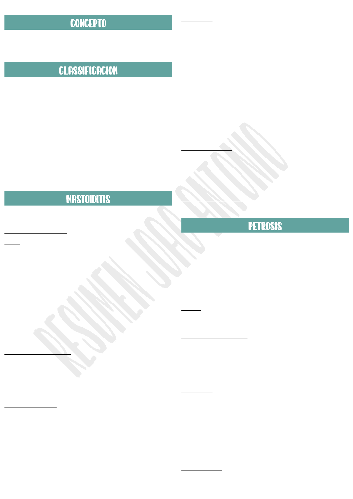 COMPLICACIONES OTOLOGICAS Son molestias en el oído que puede levar a pérdida de audición, autofonía (el paciente oye de manera amplificada su voz), acúfenos, otalgia, mareo, vértigo y sensación de plenitud del conducto auditivo externo. INTRATEMPORALES MASTOIDITIS 31 % PARALISIS FACIAL 28% PETROSIS 25% LABERINTITIS SUPURADA 14% ENDOCRANEALES ABSCESOS EXTRADURAL, SUBDURAL Y ENCEFALICO TROMBOFLEBITIS DEL SENO SIGMOIDEO MENINGITIS HIDROCEFALIA OTITICA Es un proceso infeccioso localizado a nivel de la apófisis mastoidea, que compromete el mucoperiostio y el hueso subyacente. Existen dos formas clínicas: Aguda: Compromiso del mucoperiostio y hueso mastoideo, generalmente 15 dias después de la aparición de una otitis media aguda. ETIOLOGÍA: Los agentes bacterianos causales son: Estreptococo, Neumococo, Estafilococo y el Haemophilus nfluenzae. Por sobreinfección puede aparecer una flora mixta ANATOMIA PATOLOGICA: Puede presentarse en tres formas: La reabsorción lacunar El flemón transóseo La necrosante MANIFESTACIONES CLINICAS: Otalgia continua de tipo inflamatorio, se acentúan con la actividad y al acostarse. Fiebre, Decaimiento general Otorrea mucopurulenta EXAMEN SEMIOLOGICO Tumefacción timpánica Descenso de la pared posterosuperior del conducto auditivo externo Borramiento del surco retroauricular con desplazamiento hacia delante del pabellón Otorrea purulenta, pulsátil Hipoacusia conductiva. DIAGNOSTICO: Se realiza por los signos y síntomas y el examen semiológico. La radiología confirma y localiza el proceso La incidencia de Schuller La incidencia de Stenvers Es de suma utilidad la TC en cortes axiales y coronales DIAGNOSTICO DIFERENCIAL Los más frecuentes son: - Absceso subperiostico en los estadios iniciales - Pericondritis u otohematoma del pabellon - Granuloma eosinofilo - Rabdomiosarcoma TRATAMIENTO MEDICO - El paciente debe ser internado - Se drena el oído medio - Ceftriaxona EV 1g c/12hs hasta mejoría completa clínica (promedio una semana). TRATAMIENTO QUIRÚRGICO - Mastoidectomía total Infección de la porción petrosa del hueso temporal. Puede llegar a la duramadre comprometiendo al nervio motor ocular externo y al nervio trigémino, apareciendo el Sindrome de Gradenigo, que consiste en: Neuralgia del V par Paresia o parálisis del VI par otorrea persistente Etiología: Gérmenes más frecuentes: Estreptococo, neumococo y haemophilus influenzae. MANIFESTACIONES CLINICAS Dolores orbitarios y retro orbitarios Fiebre Mal estado general Otorrea persistente DIAGNOSTICO Se debe sospechar siempre que aparezca dolor temporal o retroorbitario. Radiología: incidencias de Schuller, Stenvers La TC define con mas exactitud las zonas de destrucción y la vía de propagación. DIAGNOSTICO DIFERENCIAL Mastoiditis COMPLICACIONES: Meningitis, Absceso extradural, Laberintitis TRATAMIENTO: Antibioticoterapia Ampicilina. Se asocia, dada la cantidad de cepas de Haemophilus resistentes, cloranfenicol hasta 100mg/kg/día por vía endovenosa en los niños y 3 g en el adulto. Tratamiento alternativo: Cefalosporinas Tratamiento quirúrgico: si los síntomas persisten. Mastoidectomía radical. Proceso inflamatorio de las estructuras membranosas del oído interno ETIOLOGIA: Los gérmenes serán los de la infección ótica primaria causante PATOGENIA LAS VÍAS DE INFECCIÓN SON: Timpanógena: Es la más común. Hematógena: Vía de elección de la lúes y las septicemias. Meningógena: En el trascurso de una meningitis FORMAS CLINICAS LABERINTITIS SEROSA: Inflamación serosa, reversible, por penetración de microorganismos o toxinas. Sintomatología: vértigo moderado, con náuseas y vómitos que pueden aumentar con los cambios de posición. Hay hipoacusia sensorioneural. LABERINTITIS SUPURADA: Infección severa que penetra en el laberinto. Sintomatología: Cuadro clínico grave, comienza con vértigo violento, náuseas y vómitos, con pérdida auditiva profunda y acufenos intensos. Nistagmo espontáneo contralateral. Todas las formas de laberintitis son indoloras. LABERINTITIS NECROSANTE: Se produce como consecuencia de las otitis medias agudas del mismo nombre. Sintomatología: Similar a la forma anterior. COMPLICACIONES: Meningitis, absceso extradural y absceso de cerebelo. DIAGNOSTICO Se efectúa por la anamnesis y el cuadro clínico. La otoscopía puede revelar patología de oído medio. La radiología en la laberintitis aguda es negativa, se positiviza cuando son reactivaciones de procesos crónicos. Diagnóstico diferencial entre los distintos tipos de laberintitis se hace por intensidad y forma de aparición de los síntomas vestibulares y cocleares DIAGNOSTICO DIFERENCIAL: Entre una laberintitis y una complicación otógena de fosa posterior (absceso extradural, absceso de cerebelo). TRATAMIENTO Laberintitis serosa: Ampicilina 200mg/kg/día, en 4 tomas o Amoxicilina a 100mg/kg/día en 3 tomas. Se agrega paracentesis amplia. Se indicarán además corticoides e inhibidores del vértigo. Laberintitis supurada y necrosante. Se aplican ampicilina y cloranfenicol, por vía parenteral IV. Cefalosporinas de 3ra generación. Si la laberintitis supurada está asociada a una infección aguda de oído medio, esta indicada la paracentesis. Abordaje quirúrgico si persisten signos y síntomas. Cuando la laberintitis supurada fue producida por una otitis media colesteatomatosa, además de la solución quirúrgica de su afección causal, la laberintectomía El VII par tiene tres porciones: Laberíntica, timpánica, mastoidea. Y es en la porción timpánica donde es mas frecuentemente afectado por la otitis. Se produce por dos mecanismos principales - Compresión directa sobre la vaina - Neuritis toxica En la otitis media aguda el importante seria el segundo Pueden ser clasificadas en: 1. Centrales - Nucleares - Supranucleares 2. Periféricas o infranucleares Etiología: Consecuencia de variadas noxas que actúan directamente sobre el tronco nervioso. Las más frecuentes son: Idiopática