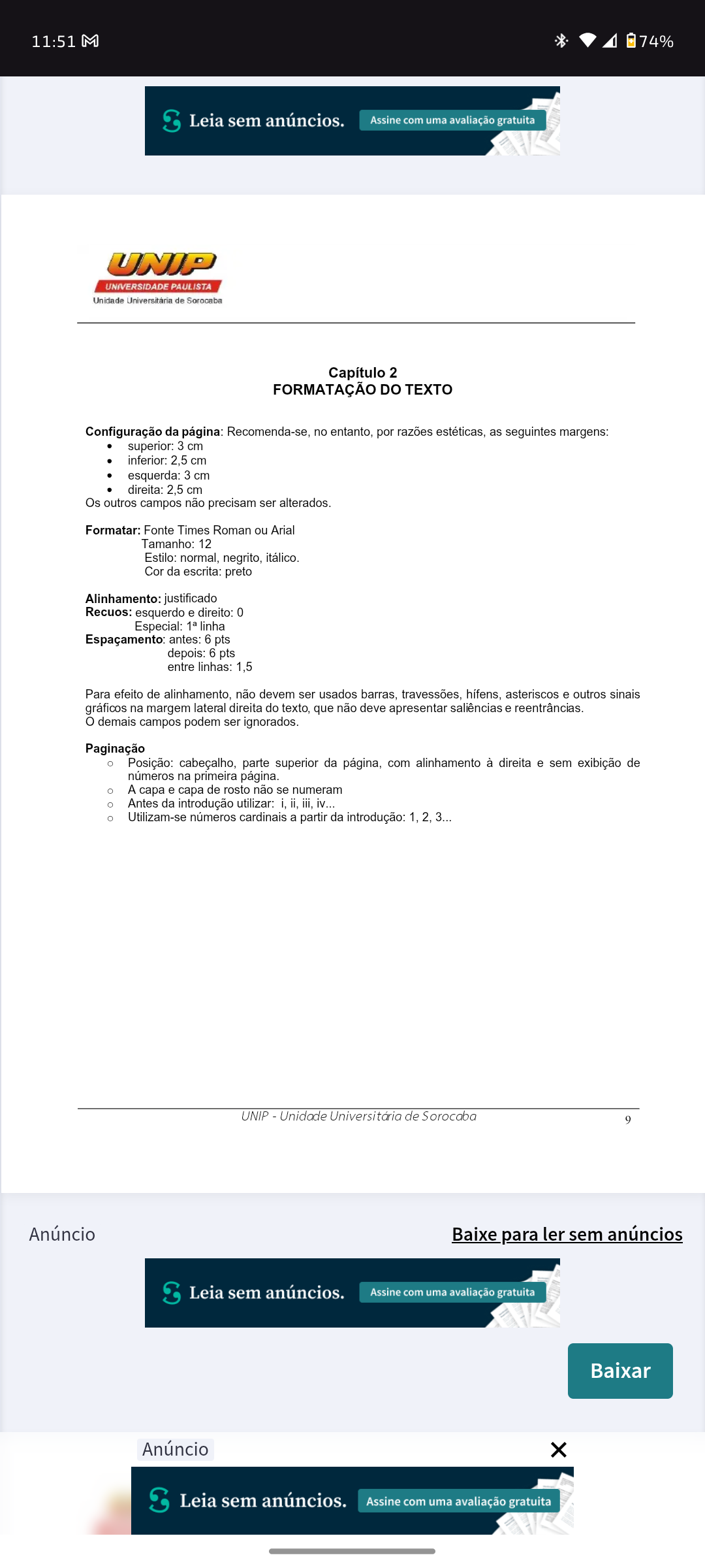 11:51 M 74% Leia sem anúncios. Assine com uma avaliação gratuita UNIP UNIVERSIDADE PAULISTA Unidade Universitária de Sorocaba Capítulo 2 FORMATAÇÃO DO TEXTO Configuração da página: Recomenda-se, no entanto, por razões estéticas, as seguintes margens: superior: 3 cm inferior: 2,5 cm esquerda: 3 cm direita: 2,5 cm Os outros campos não precisam ser alterados. Formatar: Fonte Times Roman ou Arial Tamanho: 12 Estilo: normal, negrito, itálico. Cor da escrita: preto Alinhamento: justificado Recuos: esquerdo e direito: 0 Especial: linha Espaçamento: antes: 6 pts depois: 6 pts entre linhas: 1,5 Para efeito de alinhamento, não devem ser usados barras, travessões, asteriscos e outros sinais gráficos na margem lateral direita do texto, que não deve apresentar saliências e demais campos podem ser ignorados. Paginação Posição: cabeçalho, parte superior da página, com alinhamento à direita e sem exibição de números na primeira página. A capa e capa de rosto não se numeram Antes da introdução utilizar: i, ii, iii, iv Utilizam-se números cardinais a partir da introdução: 1, 2. 3. UNIP - Unidade Universitária de Sorocaba 9 Anúncio Baixe para ler sem anúncios Leia sem anúncios. Assine com uma avaliação gratuita Baixar Anúncio X S Leia sem anúncios. Assine com uma avaliação gratuita