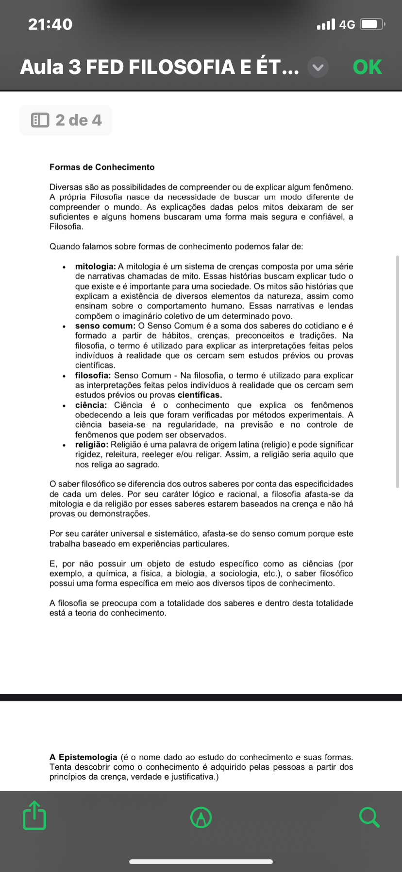 21:40 4G Aula 3 FED FILOSOFIA E ÉT OK : 2 de 4 Formas de Conhecimento Diversas são as possibilidades de compreender ou de explicar algum fenômeno. A própria nasce da necessidade de buscar um modo diferente de compreender o mundo. As explicações dadas pelos mitos deixaram de ser suficientes e alguns homens buscaram uma forma mais segura e confiável, a Filosofia. Quando falamos sobre formas de conhecimento podemos falar de: mitologia: A mitologia é um sistema de crenças composta por uma série de narrativas chamadas de mito. Essas histórias buscam explicar tudo o que existe e é importante para uma sociedade. Os mitos são histórias que explicam a existência de diversos elementos da natureza, assim como ensinam sobre o comportamento humano. Essas narrativas e lendas compõem o imaginário coletivo de um determinado senso comum: Senso Comum é a soma dos saberes do cotidiano e é formado a partir de hábitos, crenças, preconceitos e tradições. Na filosofia, termo é utilizado para explicar as interpretações feitas pelos indivíduos à realidade que os cercam sem estudos prévios ou provas filosofia: Senso Comum Na o termo é utilizado para explicar as interpretações feitas pelos indivíduos à realidade que os cercam sem estudos prévios ou provas ciência: Ciência é o conhecimento que explica os fenômenos obedecendo a leis que foram verificadas por métodos experimentais. A ciência na regularidade, na previsão e no controle de fenômenos que podem ser observados. religião: Religião é uma palavra de origem latina (religio) e pode significar rigidez, releitura, reeleger e/ou religar. Assim, a religião seria aquilo que nos religa ao sagrado. saber filosófico se diferencia dos outros saberes por conta das especificidades de cada um deles. Por seu caráter lógico e racional, a filosofia afasta-se da mitologia e da religião por esses saberes estarem baseados na crença e não há provas ou demonstrações. Por seu caráter universal e afasta-se do senso comum porque este trabalha baseado em experiências particulares. E, por não possuir um objeto de estudo específico como as ciências (por exemplo, a química, a física, a biologia, a sociologia, etc.), o saber filosófico possui uma forma específica em meio aos diversos tipos de conhecimento. A filosofia se preocupa com a totalidade dos saberes e dentro desta totalidade está a teoria do conhecimento. A Epistemologia (é o nome dado ao estudo do conhecimento e suas formas. Tenta descobrir como o conhecimento é adquirido pelas pessoas a partir dos princípios da crença, verdade e justificativa.)