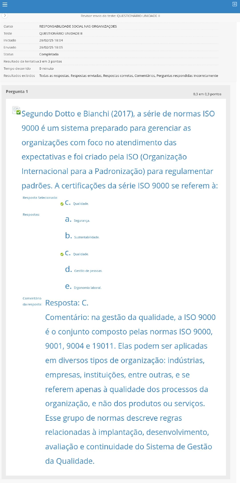 > Revisar envio do teste: QUESTIONÁRIO UNIDADE Curso RESPONSABILIDADE SOCIAL NAS Teste QUESTIONÁRIO UNIDADE II Iniciado Enviado 26/02/25 18:05 Status Completada Resultado da tentativa 3 em 3 pontos Tempo decorrido minuto Resultados exibidos Todas as respostas, Respostas enviadas, Respostas corretas, Comentários, Perguntas respondidas incorretamente Pergunta 1 0,3 em 0,3 pontos Segundo Dotto e Bianchi (2017), a série de normas ISO 9000 é um sistema preparado para gerenciar as organizações com foco no atendimento das expectativas e foi criado pela ISO (Organização Internacional para a Padronização) para regulamentar padrões. A certificações da série ISO 9000 se referem à: Resposta Selecionada: C. Qualidade. Respostas: a. Segurança. b. C. d. Gestão de e. Ergonomia laboral. Comentário da resposta: Resposta: C. Comentário: na gestão da qualidade, a ISO 9000 é o conjunto composto pelas normas ISO 9000, 9001, 9004 e 19011. Elas podem ser aplicadas em diversos tipos de organização: indústrias, empresas, instituições, entre outras, e se referem apenas à qualidade dos processos da organização, e não dos produtos ou serviços. Esse grupo de normas descreve regras relacionadas à implantação, desenvolvimento, avaliação e continuidade do Sistema de Gestão da Qualidade.> Revisar envio do teste: QUESTIONÁRIO UNIDADE Pergunta 2 0,3 em 0,3 pontos A responsabilidade social nas organizações não deve ser uma prática que vise apenas certificações, construção de imagem positiva ou valorização das ações nas bolsas de valores. A responsabilidade social deve ser uma prática institucional, enraizada nas práticas organizações, que visam recuperação e construção de uma sociedade melhor para todos. A Associação Brasileira de Normas Técnicas (ABNT, s.d.) define certificação como "[...] um processo no qual uma entidade independente parte) avalia se determinado produto atende às normas técnicas. Esta avaliação se baseia em auditorias no processo produtivo, na coleta e em ensaios de amostras". Sobre essas certificações, analise as afirmações a seguir: I. Essas certificações não são normativas, ou seja, não são obrigatórias. II. Muitas empresas fazem o pleito dessas certificações a fim de comprovar suas práticas socialmente responsáveis. III. Divididas em categorias de certificações ambientais, sociais, saúde e segurança, esse reconhecimento é feito pelo Programa Brasileiro de Certificação em Responsabilidade Social (PBCRS). Das afirmações acima são corretas: Resposta Selecionada: e. Respostas: a. Apenas b. Apenas II. C. Apenas III.> Revisar envio do teste: QUESTIONÁRIO UNIDADE Pergunta 3 0,3 em 0,3 pontos Esta norma é o primeiro padrão global que pode ser implementado em qualquer país. Também é multisetorial, diferentemente de alguns outros padrões que foram desenhados para serem aplicados apenas para um setor Nesta norma está prevista a regularização da jornada de trabalho que limita as horas ao que é estipulado pelas convenções da Organização Internacional do Trabalho (OIT). Mesmo aplicando as leis e os acordos coletivos locais, a jornada de trabalho não pode passar de 48 semanais, acrescida de um máximo de 12 horas-extras por semana. O trecho acima refere-se a qual norma da responsabilidade social? Resposta Selecionada: d. Social Accountability 8000 (SA8000). Respostas: a. Global Reporting Initiative (GRI). b. AccountAbility 1000 (AA1000). C. Ethics Compliance Standard 2000 (ECS2000). d. Social Accountability 8000 (SA8000). e. Marine Stewardship Council (MSC). Comentário da resposta: Resposta: D. Comentário: a norma SA8000 (Social Accountability 8000) da Social Accontability International (SAI) é um padrão de responsabilidade social e prestação de contas com foco na verificação da cadeia produtiva da inexistência de trabalho infantil, trabalho escravo e ações d K natórias. Foi criada em 1997 por um conselno consultivo convocado> Revisar envio do teste: QUESTIONÁRIO UNIDADE Pergunta 4 0,3 em 0,3 pontos Sobre a expressão "Greenwashing", é incorreto afirmar: Resposta Selecionada: d. A divulgação de informações falsas sobre certificações ou selos ambientais não podem ser caracterizadas como Respostas: a. É uma expressão em cujo significado seria algo como lavagem verde. b. A divulgação de informações sobre a de uso, por exemplo, do DDT (diclorodifeniltricloroetano ou do CFC (clorofluercarboneto), por parte de uma organização, em seus produtos ou processos não pode ser considerada um greenwashing, se realmente a empresa parou de C. Designa práticas desleais das organizações que divulgam informações falsas sobre, por exemplo, o impacto ambiental de suas d. A divulgação de informações falsas sobre certificações ou selos ambientais não podem ser caracterizadas como e. o termo pode ser considerado uma estratégia de marketing enganosa presente em muitos produtos e serviços. Comentário da resposta: Resposta: D. Comentário: a expressão greenwashing significa "maquiagem verde" ou "lavagem verde". Nesses casos, as marcas criam uma falsa aparência de sustentabilidade, sem necessariamente aplicá-la na prática. Em geral, a estratégia é utilizar termos vagos e sem embasamento, que levam o consumidor a acreditar que ao comprar um produto "ecológico" está contribuindo para a sustentabilidade a e animal.Revisar envio do teste: QUESTIONÁRIO UNIDADE Pergunta 5 0,3 em 0,3 pontos As práticas de Responsabilidade Social ganharam um forte aliado no início dos anos 1990 no Brasil: os incentivos fiscais para motivar empresas a investirem em responsabilidade social. A primeira lei de incentivo brasileira, o Programa Nacional de Apoio à Cultura (Pronac), é de 1991, e marca uma nova era para a responsabilidade social nas organizações. Sobre os incentivos fiscais, analise as alternativas a seguir e assinale a única correta. Resposta Selecionada: C. Para direcionamento do imposto dev