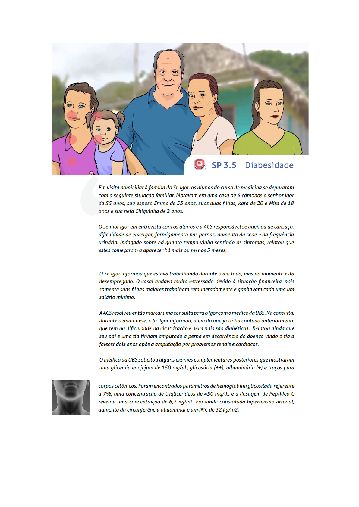Problemas: -Diabete -Pressão alta -Cansaço -Estresse -Dificuldade de enxergar -Não possui alimentação saudável -Formigamento nas pernas -Risco de problemas cardiovascular -Aumento da sede -Aumento da frequência urinária -Exames muito elevados -Obesidade grau 1 -Dificuldade financeira -Dificuldade na cicatrização Hipóteses: -Os sintomas podem ser por conta da diabete -Os exames alterados podem estar associados com o estilo de vida -A dificuldade financeira pode ser por ele estar desempregado -A situação econômica dele impede de ter um estilo de vida adequado -Ele pode ter problema renal por conta da diabete -Os problemas que ele tem pode estar relacionado com a genética Questões de aprendizagem 1- Diabetes A) Qual a definição dos tipos 1 e 2 Diabetes Mellitus (DM) é uma síndrome metabólica de origem múltipla, decorrente da falta de insulina e/ou da incapacidade de a insulina exercer adequadamente seus efeitos. A insulina é produzida pelo pâncreas e é responsável pela manutenção do metabolismo da glicose e a falta desse hormônio provoca déficit na metabolização da glicose e, consequentemente, diabetes. Caracteriza-se por altas taxas de açúcar no sangue (hiperglicemia) de forma permanente. Tipos: – Tipo 1: causada pela destruição das células produtoras de insulina, em decorrência de defeito do sistema imunológico em que os anticorpos atacam as células que produzem a insulina. Sabe-se que, geralmente, é uma doença crônica não transmissível, hereditária, que concentra entre 5% e 10% do total de diabéticos no Brasil. Ele se manifesta mais frequentemente em adultos, mas crianças também podem apresentar. O diabetes tipo 1 aparece geralmente na infância ou adolescência, mas pode ser diagnosticado em adultos também. Pessoas com parentes próximos que têm ou tiveram a doença devem fazer exames regularmente para acompanhar a glicose no sangue. O tratamento exige o uso diário de insulina e/ou outros medicamentos para controlar a glicose no sangue. A causa do diabetes tipo 1 ainda é desconhecida e a melhor forma de preveni-la é com práticas de vida saudáveis (alimentação, atividades físicas e evitando álcool, tabaco e outras drogas). – Tipo 2: resulta da resistência à insulina e de deficiência na secreção de insulina. A causa do diabetes tipo 2 está diretamente relacionado ao sobrepeso, sedentarismo, triglicerídeos elevados, hipertensão e hábitos alimentares inadequados. Por isso, é essencial manter acompanhamento médico para tratar, também, dessas outras doenças, que podem aparecer junto com o diabetes. Cerca de 90% dos pacientes diabéticos no Brasil têm esse tipo. – Diabetes Gestacional: é a diminuição da tolerância à glicose, diagnosticada pela primeira vez na gestação, podendo ou não persistir após o parto. Sua causa exata ainda não é conhecida. – Outros tipos: são decorrentes de defeitos genéticos associados com outras doenças ou com o uso de medicamentos. Podem ser: defeitos genéticos da função da célula beta; defeitos genéticos na ação da insulina; doenças do pâncreas exócrino (pancreatite, neoplasia, hemocromatose, fibrose cística, etc.); induzidos por drogas ou produtos químicos (diuréticos, corticóides, betabloqueadores, contraceptivos, etc.). – Diabetes Latente Autoimune do Adulto (LADA): atinge basicamente os adultos e representa um agravamento do diabetes tipo 2. Caracteriza-se, basicamente, no desenvolvimento de um processo autoimune do organismo, que começa a atacar as células do pâncreas. – Pré-diabetes: é quando os níveis de glicose no sangue estão mais altos do que o normal, mas ainda não estão elevados o suficiente para caracterizar um Diabetes Tipo 1 ou Tipo 2. É um sinal de alerta do corpo, que normalmente aparece em obesos, hipertensos e/ou pessoas com alterações nos lipídios. Esse alerta do corpo é importante por ser a única etapa do diabetes que ainda pode ser revertida, prevenindo a evolução da doença e o aparecimento de complicações, incluindo o infarto. No entanto, 50% dos pacientes que têm o diagnóstico de pré-diabetes, mesmo com as devidas orientações médicas, desenvolvem a doença. A mudança de hábito alimentar e a prática de exercícios são os principais fatores de sucesso para o controle. Uma pessoa é classificada como pré-diabética ao medir a sua glicemia em jejum e atingir entre 100 e 125 mg/dl. Referência: https://bvsms.saude.gov.br/diabetes/#:~:text=Tipos%3A,defici%C3%AAncia%20na %20secre%C3%A7%C3%A3o%20de%20insulina. B) Perfil epidemiológico Perfil predominante do sexo feminino (72,0%), idade média de 65 anos, ensino fundamental incompleto (72,5%), raça branca (91,0%), casados (57,2%), aposentados/pensionistas (66,7%), renda mensal familiar de até um salário. Fonte: https://seer.uftm.edu.br/revistaeletronica/index.php/enfer/article/view/3581 De acordo com a Sociedade Brasileira de Diabetes, existem atualmente, no Brasil, mais de 13 milhões de pessoas vivendo com a doença, o que representa 6,9% da população nacional. C) Quadro clínico 1- Poliúria (excesso de urina) Quando o nível de glicose no sangue fica muito alto (acima de 180mg/dl) Se diz que o Linear de Reabsorção Renal é ultrapassado. ➥ O sangue é filtrado nos rins- E a Glicose é filtrada junto com a urina- Mas o Rim reabsorve ela para não perder ela na urina (porque a natureza se comporta assim, porque glicose é fonte de energia e não deve ser desperdiçada, porem os rins não sabem que ela está em excesso)- Assim, quando há hiperglicemia, o rim consegue absorver parte dela, e a outra parte fica na urina (Glicosúria) - E a Glicose é osmoticamente ativa, ou seja, ela puxa agua- Então, o que acontece é que agua é puxada para junto da urina pela glicose- Fazendo assim, o paciente diabético eliminar alta quantidade de agua na urina por causa da hiperglicemia, e junto a agua na urina e outros compostos, está a glicose. https://bvsms.s