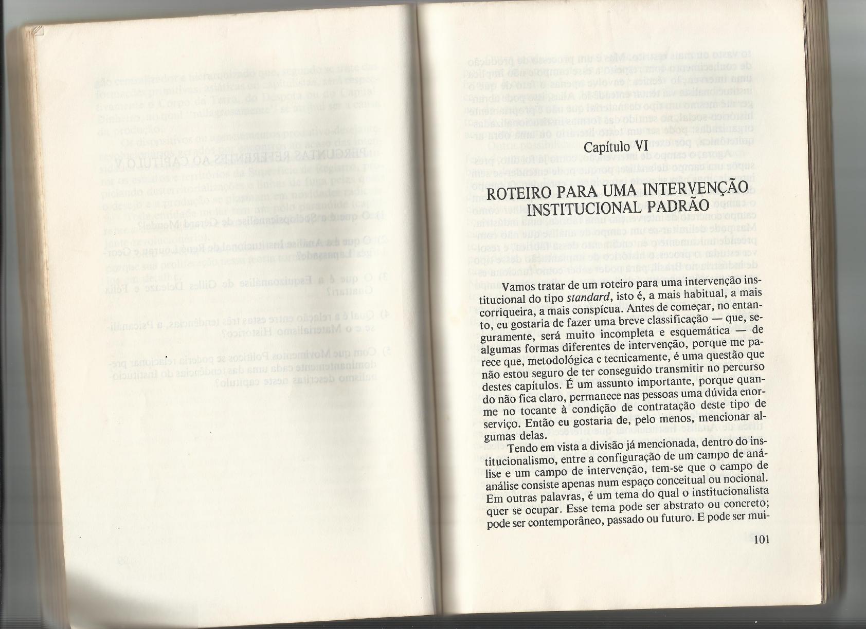Capítulo VI ROTEIRO PARA UMA INTERVENÇÃO INSTITUCIONAL PADRÃO Vamos tratar de um roteiro para uma intervenção ins- titucional do tipo standard, isto é, a mais habitual, a mais corriqueira, a mais Antes de começar, no entan- to, eu gostaria de fazer uma breve classificação - que, se- guramente, será muito incompleta e esquemática - de algumas formas diferentes de intervenção, porque me pa- rece que, metodológica e tecnicamente, é uma questão que não estou seguro de ter conseguido transmitir no percurso destes capítulos. É um assunto importante, porque quan- do não fica claro, permanece nas pessoas uma dúvida enor- me no tocante à condição de contratação deste tipo de serviço. Então eu gostaria de, pelo menos, mencionar al- gumas delas. Tendo em vista a divisão já mencionada, dentro do ins- titucionalismo, entre a configuração de um campo de aná- lise e um campo de intervenção, tem-se que o campo de análise consiste apenas num espaço conceitual ou nocional. Em outras palavras, é um tema do qual o institucionalista quer se ocupar. Esse tema pode ser abstrato ou concreto; pode ser contemporâneo, passado ou futuro. E pode ser mui- 101to vasto ou mais restrito. Mas é um processo de produção Outra modalidade possível de prestação deste serviço de conhecimento com respeito a esse campo e não implica pode ser feita por parte de uma equipe que integra, que é uma intervenção técnica; envolve apenas o fato de que o interna à organização na qual se vai intervir. É o famoso institucionalista vai tentar entendê-lo. Aliás, isso pode abran- caso, por exemplo, do departamento de Recursos Huma- ger até mesmo um tipo de material que não é propriamente nos de uma empresa, que tem de fazer uma intervenção den- histórico-social, no sentido das formas institucionalizadas- tro de sua empresa mesma, ou um departamento de organizadas: pode ser um texto literário ou uma obra ar- acompanhamento institucional de uma universidade. quitetônica, por exemplo. Outra possibilidade é a de uma prestação de serviços Agora, o campo de intervenção, como já foi dito, pres- feita de uma maneira parecida com esta anterior, que aca- supõe um campo de análise, porque pode entender-se sem bamos de expor, mas menos caracterizada burocrática e pro- intervir, mas não se pode intervir sem entender. O campo fissionalmente. Por exemplo, é o caso de um Sindicato ou de análise pode não coincidir, em termos empíricos, com de um Partido político que, nos seus quadros, tem institu- o campo de intervenção. Ou seja, pode-se escolher como cionalistas que são militantes formais. Então esse Sindica- campo concreto de intervenção uma fábrica, uma indústria. to ou esse Partido político pede a seus militantes institu- Mas pode delimitar-se um campo de análise que não com- cionalistas uma intervenção em um setor, em um segmen- preende unicamente o entendimento dessa fábrica, e resol- to, em uma frente, em um espaço da vida e da atividade ver estudar o processo histórico de implantação desse tipo partidária, trabalho esse que pode ser ou não pago, con- de indústria no Brasil, para poder saber como funciona es- tanto que seja considerado como parte da vida militante. sa organização concreta, fabril, que se escolheu como campo Mas, em todo caso, é um acordo muito definido, pois se de intervenção. trata de uma oferta e uma solicitação formais, em que se Partindo, pois, dessa discriminação entre campos de reconhece no militante institucionalista um saber "especí- análise e campo de intervenção, digamos que as modalida- e ele é procurado nesta condição. des de intervenção podem ser variadas. Uma modalidade Existe uma quarta possibilidade, que é aquela pela qual de intervenção que é aquela a que nos vamos referir de um institucionalista que não se caracteriza como tal e não forma predominante quando repassarmos este roteiro stan- oferece seus serviços como tal, se infiltra em uma organi- dard, tradicional, é um serviço que é oferecido desde posi- zação à qual ele pode pertencer organicamente ou não, e ções mais ou menos clássicas, convencionais, habituais, o faz sob um rótulo, na condição de qualquer outra coisa dentro do panorama social. É o que se dá com o serviço que faça parte dos papéis formais existentes nessa organi- oferecido na condição de profissional liberal ou autônomo, zação, mas que não seja o de institucionalista. É o caso, na condição de sociedade científica uma sociedade cien- por exemplo, de um morador numa associação de bairro, tífica de Análise Institucional que oferece trabalhos, por em que ninguém sabe que seja institucionalista, ninguém exemplo; é o exercício que é oferecido por um estabeleci- está informado de que ele oferece serviços de instituciona- mento de prestação de serviços privados, um instituto de lista, mas que, dentro de seu papel de morador, opera co- Análise Institucional que pode ser uma sociedade anônima mo institucionalista, sem explicitar essa condição. de responsabilidade limitada ou uma microempresa; é o que Existe uma última possibilidade, dentro deste espectro pode ser oferecido por um departamento especial de uma esquemático, pobre, limitado, que consiste numa variação Faculdade, um departamento de Análise Institucional nu- dessa última possibilidade. Uma variação que parece a me- ma universidade. nos comprometida e, sem dúvida, é a mais difícil de todas: 102 103é a daquele que pratica o institucionalismo na convivência e, em muitas ocasiões, embora não em todas, à condição cotidiana. Ou seja: é aquele que nem oferece serviços co- de técnico se acrescenta a de funcionário ou de burocrata. mo institucionalista, nem é solicitado como tal, nem se Felizmente ou não, o institucionalismo não é assim; não infiltra sob outra condição não formal, mas simplesmente é isso o que ele propõe, apesar de que, em algumas oca- 