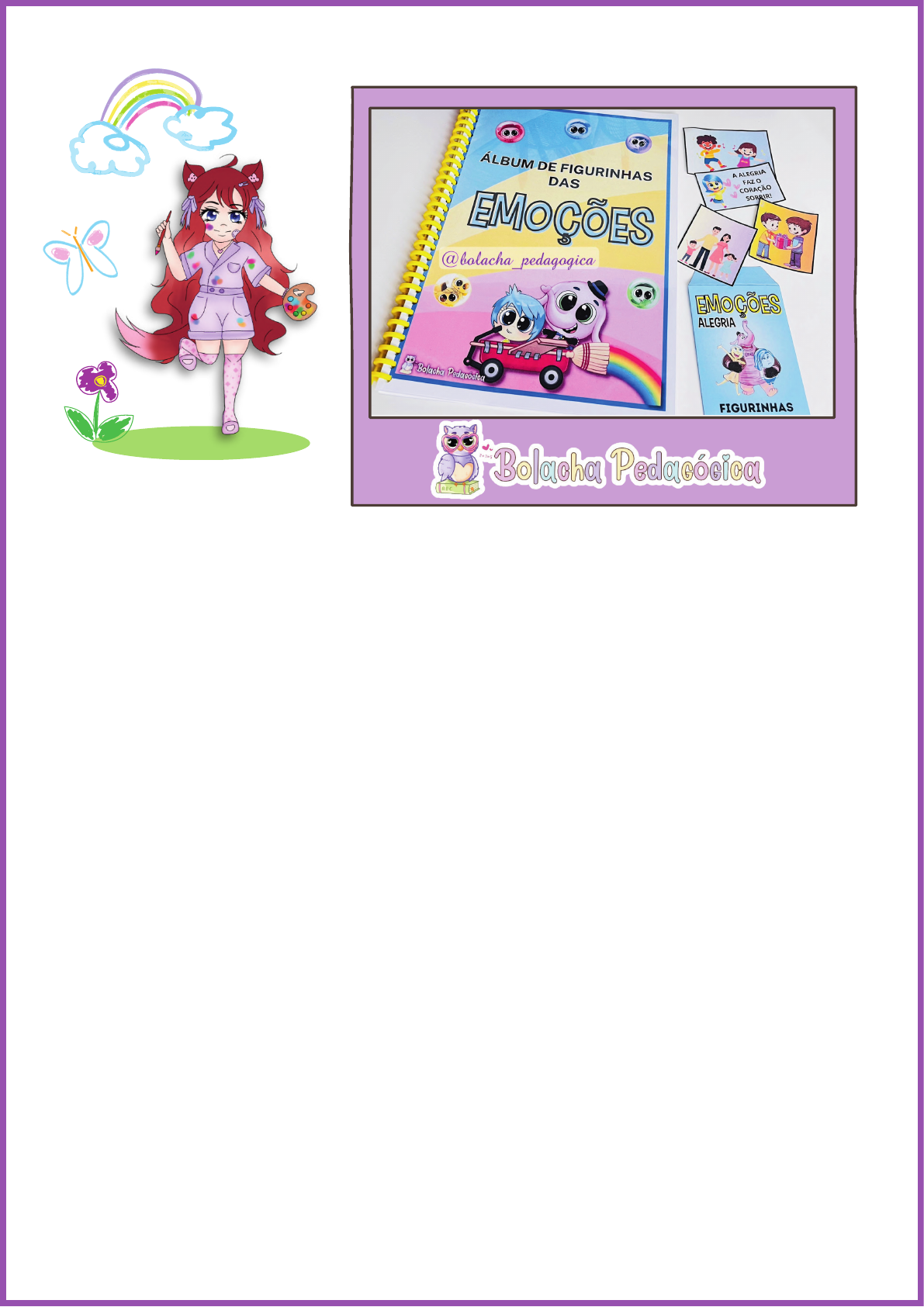 www.bolachapedagogica.com @bolacha_pedagogica Álbum de figurinhas das Emoções Material para trabalhar as emoções, um lindo álbum de figurinhas inspirado em Divertidamente 2. Para montar, imprimi todas as folhas em A4 comum, encadernei, nessa hora aproveitei para colocar a capa de encadernação, usei transparente. As figurinhas estão todas enumeradas, e divididas por tema. Tem um envelope para cada tema. Uma dica, monte primeiro os envelopes, depois vai recortando as figurinhas e guardando-as em seus envelopes corretos, assim não corre o risco de misturar. Material pode ser usado com alunos, filhos e até dar de presente. É muito lindo!! ÁLBUM DE FIGURINHASÁLBUM DE FIGURINHAS EMOÇÕESEMOÇÕES DASDAS Arquivo GRATUITO, proibido a Venda EMOÇÕESEMOÇÕES BEM-VINDO AO ÁLBUM DE FIGURINHAS DAS EMOÇÕES COM PERSONAGENS INSPIRADOS NO FILME "DIVERTIDAMENTE"! AQUI, VOCÊ VAI APRENDER SOBRE ALEGRIA, TRISTEZA, MEDO, RAIVA E OUTRAS EMOÇÕES DE FORMA DIVERTIDA E EDUCATIVA. CADA FIGURINHA TRAZ INFORMAÇÕES E DICAS SOBRE COMO LIDAR COM ESSAS EMOÇÕES. VAMOS COLECIONAR, EXPLORAR E ENTENDER MELHOR NOSSOS SENTIMENTOS COM A AJUDA DE NOSSOS AMIGOS DO FILME. PRONTO PARA COMEÇAR ESSA AVENTURA EMOCIONAL? VAMOS LÁ! ESTE ÁLBUM PERTENCE À: ALEGRIAALEGRIA ALEGRIA É QUANDO VOCÊ SE SENTE FELIZ E ANIMADO! DANÇE E CANTE SUAS MÚSICAS FAVORITAS PARA SENTIR MAIS ALEGRIA. COMPARTILHAR MOMENTOS FELIZES COM AMIGOS E FAMÍLIA AUMENTA A ALEGRIA. LEMBRAR DE COISAS BOAS QUE ACONTECERAM PODE TRAZER A ALEGRIA DE VOLTA. 1 2 3 4 @bolacha_pedagogica TRISTEZATRISTEZA TRISTEZA É QUANDO VOCÊ SE SENTE TRISTE E PARA BAIXO. CHORAR PODE AJUDAR A LIBERAR A TRISTEZA E SENTIR-SE MELHOR. FALAR COM UM AMIGO OU ADULTO SOBRE O QUE TE DEIXA TRISTE PODE AJUDAR. ÀS VEZES, DESENHAR OU ESCREVER SOBRE SEUS SENTIMENTOS PODE ALIVIAR A TRISTEZA. 1 2 3 4 @bolacha_pedagogica RAIVARAIVA 1 2 3 4 RAIVA É QUANDO VOCÊ SE SENTE BRAVO E FRUSTRADO. CONTAR ATÉ DEZ PODE AJUDAR A CONTROLAR A RAIVA. BATER PALMAS OU AMASSAR PAPEL PODE ALIVIAR A RAIVA. FALAR SOBRE O QUE TE DEIXA COM RAIVA PODE AJUDAR A ENTENDER E RESOLVER O PROBLEMA. @bolacha_pedagogica MEDOMEDO 1 2 3 4 MEDO É QUANDO VOCÊ SE SENTE ASSUSTADO OU PREOCUPADO. CONVERSAR COM ALGUÉM DE CONFIANÇA PODE AJUDAR A ENFRENTAR O MEDO. RESPIRAR FUNDO E DEVAGAR PODE ACALMAR O MEDO. LEMBRAR-SE DE QUE ESTÁ SEGURO PODE AJUDAR A DIMINUIR O MEDO. @bolacha_pedagogica NOJONOJO 1 2 3 4 NOJO É QUANDO VOCÊ SE SENTE ENOJADO OU DESGOSTOSO. LEMBRAR QUE É NORMAL NÃO GOSTAR DE ALGUMAS COISAS AJUDA A LIDAR COM O NOJO. TENTAR NOVAS COISAS AOS POUCOS PODE AJUDAR A SUPERAR O NOJO. DIZER EDUCADAMENTE QUE NÃO GOSTA DE ALGO É UMA BOA FORMA DE EXPRESSAR O NOJO. @bolacha_pedagogica ANSIEDADEANSIEDADE 1 2 3 4 ANSIEDADE É QUANDO VOCÊ SE SENTE MUITO PREOCUPADO OU NERVOSO. RESPIRAR FUNDO E DEVAGAR PODE AJUDAR A ACALMAR A ANSIEDADE. CONVERSAR COM ALGUÉM SOBRE SUAS PREOCUPAÇÕES PODE ALIVIAR A ANSIEDADE. LEMBRAR-SE DE QUE É NORMAL SENTIR ANSIEDADE ÀS VEZES AJUDA A LIDAR MELHOR COM ELA. @bolacha_pedagogica VERGONHAVERGONHA 1 2 3 4 VERGONHA É QUANDO VOCÊ SE SENTE DESCONFORTÁVEL OU EMBARAÇADO. LEMBRAR QUE TODOS COMETEM ERROS PODE AJUDAR A DIMINUIR A VERGONHA. FALAR COM ALGUÉM DE CONFIANÇA SOBRE COMO SE SENTE PODE ALIVIAR A VERGONHA. LEMBRE-SE, VOCÊ NÃO ESTÁ SOZINHO – TODOS SENTEM VERGONHA ÀS VEZES. @ bo la ch a_ pe da go gi ca INVEJAINVEJA 1 23 4 INVEJA É QUANDO VOCÊ DESEJA TER ALGO QUE OUTRA PESSOA TEM. FOCAR NAS COISAS BOAS QUE VOCÊ TEM PODE AJUDAR A SUPERAR A INVEJA. USAR A INVEJA COMO MOTIVAÇÃO PARA MELHORAR PODE SER POSITIVO. AGRADECER PELO QUE VOCÊ TEM AJUDA A DIMINUIR A INVEJA. @ bo la ch a_ pe da go gi ca TÉDIOTÉDIO 1 2 3 4 TÉDIO É QUANDO VOCÊ SE SENTE DESINTERESSADO E SEM NADA PARA FAZER. USAR A IMAGINAÇÃO PODE TRANSFORMAR O TÉDIO EM DIVERSÃO. TENTAR UMA NOVA ATIVIDADE PODE ACABAR COM O TÉDIO RAPIDAMENTE. APROVEITAR O TÉDIO PARA DESCANSAR E PENSAR PODE SER ÚTIL. @bolacha_pedagogica ALÉM DESSAS, TEM MUITAS OUTRAS EMOÇÕESALÉM DESSAS, TEM MUITAS OUTRAS EMOÇÕES RESILIÊNCIARESILIÊNCIA PAIXÃOPAIXÃO FRUSTRAÇÃOFRUSTRAÇÃO TRANQUILIDADETRANQUILIDADE ORGULHOORGULHO CONFIANÇACONFIANÇA ESPERANÇAESPERANÇACURIOSIDADECURIOSIDADE GRATIDÃOGRATIDÃO 1 2 3 4 5 6 7 8 9 @ bo la ch a_ pe da go gi ca ? ? ? COMO VOCÊ SE SENTE QUANDO...COMO VOCÊ SE SENTE QUANDO... ESTÁ NO PRIMEIRO DIA DE AULA BRINCA COM AMIGOS NO PARQUE PERDE UM JOGO @bolacha_pedagogica ? ? ? COMO VOCÊ SE SENTE QUANDO...COMO VOCÊ SE SENTE QUANDO... RECEBE UM PRESENTE AJUDA ALGUÉM ASSISTE A UM FILME ASSUSTADOR @bolacha_pedagogica ? ? ? COMO VOCÊ SE SENTE QUANDO...COMO VOCÊ SE SENTE QUANDO... ESTÁ SEM NADA PRA FAZER VISITA UM LUGAR NOVO LEMBRA DE UMA FESTA DE ANIVERSÁRIO @bolacha_pedagogica ? ? ? COMO VOCÊ SE SENTE QUANDO...COMO VOCÊ SE SENTE QUANDO... RECEBE UM ELOGIO BRIGA COM UM AMIGO RECEBE UMA CARTA OU DESENHO DE UM AMIGO @bolacha_pedagogica ? ? ? COMO VOCÊ SE SENTE QUANDO...COMO VOCÊ SE SENTE QUANDO... DIZ "EU TE AMO" PARA ALGUÉM QUERIDO SENTE-SE SOZINHO DURANTE O RECREIO RECEBE UMA NOTA RUIM NA ESCOLA @bolacha_pedagogica ? ? ? COMO VOCÊ SE SENTE QUANDO...COMO VOCÊ SE SENTE QUANDO... QUEBRA ALGO IMPORTANTE SEM QUERER BRINCA CARINHOSAMENTE COM UM IRMÃO OU IRMÃ EMPRESTA UM BRINQUEDO @bolacha_pedagogica ? ? ? COMO VOCÊ SE SENTE QUANDO...COMO VOCÊ SE SENTE QUANDO... SERVEM ALGO PARA COMER QUE NÃO GOSTA O COLEGA PEGA ALGO SEM PEDIR TEM UM ALMOÇO EM FAMÍLIA @bolacha_pedagogica ? ? ? COMO VOCÊ SE SENTE QUANDO...COMO VOCÊ SE SENTE QUANDO... ABRAÇA ALGUÉM QUE AMA ALGUÉM TE DÁ UMA BRONCA UM COLEGA TE XINGA @bolacha_pedagogica ? ? ? COMO VOCÊ SE SENTE QUANDO...COMO VOCÊ SE SENTE QUANDO... UM AMIGO GANHA ALGO E VOCÊ NÃO TEM UM PESADELO FAZ UM DESENHO QUE GOSTA MUITO @bolacha_pedagogica A ALEGRIA FAZ O CORAÇÃO SORRIR! Alegria Tristeza A TRISTEZA FAZ PARTE, MAS LOGO PASSA. 1 3 2 4 1 3 4 2 A RAIVA É COMO UMA TEMPESTADE QUE LOGO SE ACALMA. A RAIVA É COMO UMA TEMPESTADE QUE LOGO SE 