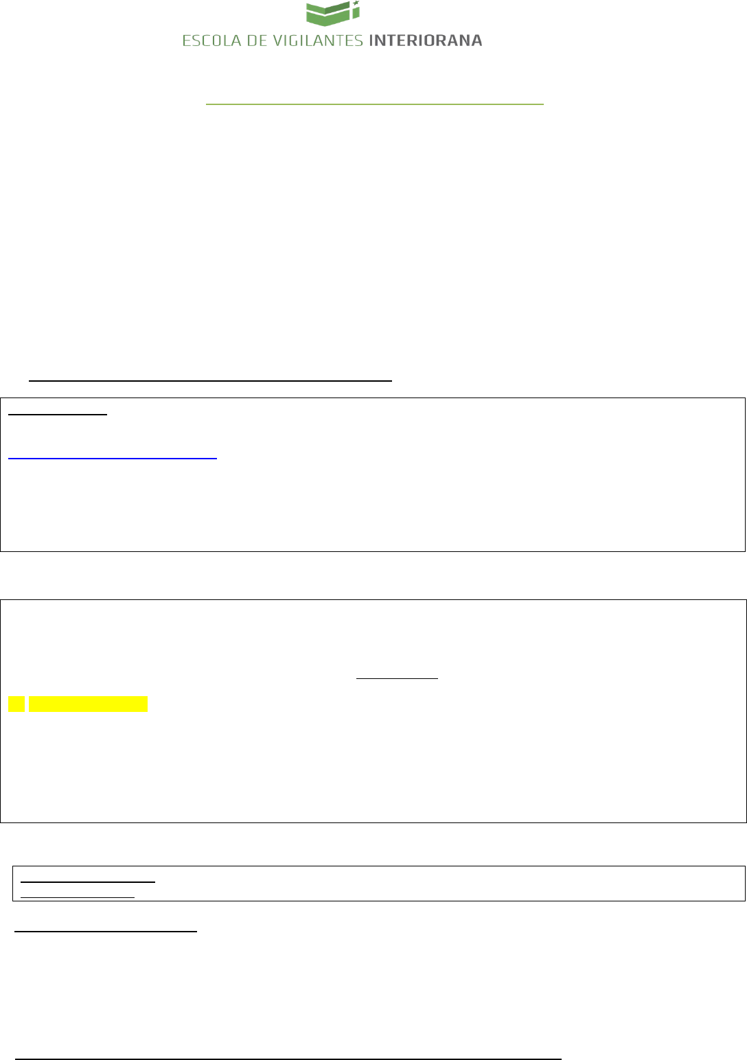 DOCUMENTAÇÃO PARA O CURSO DE FORMAÇÃO ►Cópia da Carteira de Identidade (atualizada, máximo 10 anos de expedição) ou CNH (dentro da validade); ►Cópia do documento de situação militar em dia (certificado de reservista com os carimbos atualizados, ou dispensa, ou declaração da junta militar – somente para homens); Acima de 45 anos, dispensado do documento do quartel. ►Cópia do histórico Escolar (comprovando no MINIMO 5º ano do Ensino Fundamental); ►Cópia do comprovante de residência completo (luz, água, telefone, internet.) Se não estiver no nome do aluno, precisa declaração do proprietário (não precisa autenticar) ►Certidão judicial criminal negativa (fórum) (www1.tjrs.jus.br) ►Certidão criminal da justiça federal (www.trf4.jus.br) ►Certidão quitação da Justiça Eleitoral (www.tse.gov.br) ►Certidão criminal da Justiça Eleitoral (www.tse.gov.br) ►Certidão criminal militar federal (www.stm.gov.br) ►Certidão criminal militar estadual (www.tjm.rs.gov.br) *As certidões (em PDF) podem ser retiradas na escola ao valor de R$20,00 todas ( ou R$ 4,00 unitário) ( não poderá ter nenhuma restrições/pendência em nenhum dos órgãos citados) ***Atestado Médico, Psicológico e apostila fornecidos pela escola. IMPORTANTE: A documentação completa deve ser digitalizada na copiadora (scanner) e encaminhada para a escola no e-mail atendimento@escolainteriorana.com.br , no formato PDF, até 05 dias antes ao início do curso. A documentação deverá estar completa no primeiro dia de curso para que o aluno possa frequentar as aulas. Caso contrário, a aluno será automaticamente transferido para a próxima turma. No primeiro dia de aula, será tirada uma foto digital para o sistema da Polícia Federal (GESP). Foto essa que, posteriormente, será utilizada na Carteira Nacional de Vigilante. OBSERVAÇÕES IMPORTANTES: LEIA TODOS OS ITENS ATENTAMENTE. * IDADE MINIMA 21 ANOS COMPLETOS * No caso de desistência ou reprovação do curso, após este ter iniciado, a escola se reserva o direito de cobrar o valor das despesas já efetuadas pelo aluno., além da multa especificada em contrato. * Os alunos deverão ter freqüência de 90% da carga horária de cada disciplina para aprovação e nota mínima 6,0 (seis). * Horário de aula das 08:00h ás 12:00h Tarde: 13:30h ás 17:30h de segunda a sexta. Sábado aula somente pela parte manhã. No primeiro dia de aula, começará as 09:00hs.(maiores informações consultar na secretaria da escola). * Trazer caderno, caneta, roupas adequadas para prática de Educação Física e Defesa Pessoal e repelente. * Os alunos alojados precisam trazer roupa de cama, travesseiro, cobertor e cadeado( 25mm). * Pacote de alojamento disponibilizado somente para dias de curso. Caso o aluno precise permanecer na escola, há o custo adicional de R$ 30,00 por final de semana para o alojamento. * Telefone p/ Transporte da rodoviária até escola (054) 99985-5013 com André (DATSCH Transportes – acerto diretamente com o motorista). PARCELAMENTO SOMENTE CARTÕES VISA / MASTER / BANRICOMPRAS / VERDECARD/ ELO NÃO ACEITAMOS CHEQUES SOMENTE O CURSO A vista R$ 2.100,00 ou entrada(dinheiro ou pix) de R$390,00 + 5x de 390,00 no cartão = R$2.340,00 CURSO COM ALOJAMENTO A vista R$ 2.300,00 ou entrada(dinheiro ou pix) de R$415,00 + 5x de 415,00 no cartão = R$2.490,00 CONTA PARA DEPOSITO DOS VALORES DE CURSO em nome da ESCOLA INTERIORANA BANCO DO BRASIL Agencia 0092-2 CONTA 23.538-5 BANRISUL Agencia 0917 – Conta 20.054.381.06 PIX = Celular 54 984154190 ou CNPJ 92007749/0001-89 Refeitório terceirizado: 54 91120821 Informações sobre alimentação com Taís End: Av Cel jarbas Quadros da Silva, nº 2800 – Bairro São Cristóvão II - Passo Fundo - RS CEP 99.064-440 Fone: 0xx54-3313.1999 – 98415-4190 (whats) http://www.tse.gov.br/ http://www.tse.gov.br/ http://www.stm.gov.br/ http://www.tjm.rs.gov.br/ mailto:atendimento@escolainteriorana.com.br C A D A S T R O – CURSO DE FORMAÇÃO DATA DO CURSO:___________________________ NOME COMPLETO: _____________________________________________ IDADE:_________________ DATA DE NASCIMENTO______/_______/________ CIDADE ONDE NASCEU_______________________________ FILIAÇÃO:(Pai/mãe) ________________________________________________________________________________ CPF:_____________________________________ RG _________________________________________ TÍTULO DE ELEITOR: _______________________________________ ENDEREÇO: RUA__________________________________________________________________________N-º______ BAIRRO:______________________________________________________CIDADE: _________________________ CEP:__________________ TEL.C/DDD__________________________TEL RESIDENCIAL ___________________________ E-MAIL _____________________________________________________________ ____________________ ( ) NÃO HORARIO DE CHEGADA NA ESCOLA ALOJAMENTO ( ) SIM FORMA DE PAGAMENTO: _________________________________________________________________________________________________________ CONTRATO: ( ) ATENÇÃO: AS INSCRIÇÕES DEVERÃO SER EFETUADAS COM ANTECEDÊNCIA – VAGAS LIMITADAS - SOMENTE SERÁ EFETIVADA A MATRICULA MEDIANTE O CADASTRO OBRIGATORIAMENTE COM TODOS OS CAMPOS PREENCHIDOS E COMPROVANTE DE PAGAMENTO ENCAMINHADOS VIA E-MAIL : atendimento@escolainteriorana.com.br e APÓS O RECEBIMENTO DA DOCUMENTAÇÃO TAMBÉM DIGITALIZADA NO E-MAIL E ENCAMINHADA PARA A ESCOLA ATÉ 05 DIAS ANTES DO INÍCIO DO CURSO. mailto:atendimento@escolainteriorana.com.br