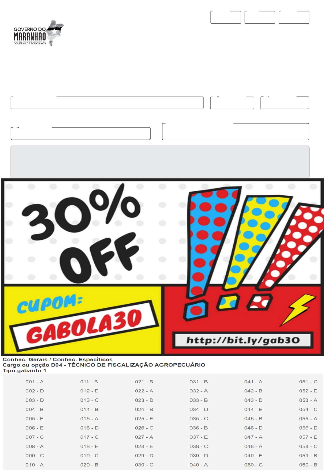 N do CadernooN de Inscriçãoo ASSINATURA DO CANDIDATO N do Documentoo Nome do Candidato Quando autorizado pelo fiscal de sala, transcreva a frase ao lado, com sua caligrafia usual, no espaço apropriado na Folha de Respostas. INSTRUÇÕES Abril/2018 Colégio Sala Ordem Concurso Público para provimento de vagas nos cargos de Técnico de Fiscalização Agropecuário SECRETARIA DE ESTADO DA GESTÃO, PATRIMÔNIO E ASSISTÊNCIA DOS SERVIDORES SEGEP AGÊNCIA ESTADUAL DE DEFESA AGROPECUÁRIA DO MARANHÃO AGED � � PROVA Conhecimentos Gerais Conhecimentos Específicos Conquistas começam com a decisão de tentar o primeiro passo. - Verifique se este caderno: - Corresponde a sua opção de cargo. - Contém 60 questões, numeradas de 1 a 60. Caso contrário, solicite imediatamente ao fiscal da sala a substituição do caderno. Não serão aceitas reclamações posteriores. - Para cada questão existe apenas UMAresposta certa. - Leia cuidadosamente cada uma das questões e escolha a resposta certa. - Essa resposta deve ser marcada na FOLHADE RESPOSTAS que você recebeu. - Procurar, na FOLHADE RESPOSTAS, o número da questão que você está respondendo. - Verificar no caderno de prova qual a letra (A,B,C,D,E) da resposta que você escolheu. - Marcar essa letra na FOLHADE RESPOSTAS, conforme o exemplo: - Marque as respostas com caneta esferográfica de material transparente de tinta preta ou azul. Não será permitida a utilização de lápis, lapiseira, marca texto ou borracha durante a realização da prova. - Marque apenas uma letra para cada questão. Será anulada a questão em que mais de uma letra estiver assinalada. - Responda a todas as questões. - Não será permitida nenhuma espécie de consulta ou comunicação entre os candidatos, nem a utilização de livros, códigos, manuais, impressos ou quaisquer anotações. - Aduração da prova é de 3 (três) horas para responder a todas as questões objetivas e preencher a Folha de Respostas. - Ao término da prova, chame o fiscal da sala e devolva todo o material recebido. - É proibida a divulgação ou impressão parcial ou total da presente prova. Direitos Reservados. VOCÊ DEVE ATENÇÃO A C D E Caderno de Prova ’D04’, Tipo 001 MODELO 0000000000000000 TIPO−001 00001 0001 0001 http://bit.ly/gab30 2 AGEDM-Conhec.Gerais2 CONHECIMENTOS GERAIS Língua Portuguesa Atenção: Considere o texto abaixo para responder às questões de números 1 a 6. Na cerimônia de entrega do Prêmio Melhores do Agronegócio 2017, o presidente da Embrapa, Maurício Lopes, disse que a chegada e a difusão de novas tecnologias vão revolucionar o futuro do campo brasileiro. Ele anunciou que a Embrapa Gado de Corte está lançando um cabresto com sensores para ser colocado no boi. A ferramenta é capaz de transmitir para o computador alguns sinais, como a temperatura do corpo, por exemplo, possibilitando ao pecuarista atuar com antecedência sobre problemas da boiada. “É uma das últimas palavras em tecnologia.” O presidente da Embrapa disse, ainda, que a agricultura de precisão será determinante para o futuro do agronegócio. Em resposta a uma provocação do jornalista Bruno Blecher, Maurício Lopes disse acreditar que a carne do futuro poderá mesmo ser produzida em laboratório. Há dez anos, um simples bifinho custava US$ 120 mil. Hoje, ele sai por US$ 5 mil, afirma. “Resta saber se alguém vai querer comer.” (Adaptado de: NASCIMENTO, Sebastião. Novas tecnologias vão definir o futuro do agro, diz presidente da Embrapa. Disponível em: http://revistagloborural.globo.com) 1. O texto tem o claro propósito de (A) registrar comentários feitos pelo presidente da Embrapa por ocasião de sua presença em um evento, o que se constata pelo emprego recorrente de disse. (B) defender que a Embrapa Gado de Corte deve ser premiada por desenvolver um cabresto com sensores, descrito pelo autor como uma das últimas palavras em tecnologia. (C) mostrar como a Embrapa estimulará a agricultura de precisão, o que se explicita na afirmação a chegada e a difusão de novas tecnologias vão revolucionar o futuro do campo brasileiro. (D) mensurar os benefícios do consumo da carne produzida em laboratório para a saúde das pessoas no futuro, como se faz patente ao longo do último parágrafo. (E) criticar a pouca utilidade prática da tecnologia desenvolvida no Brasil, como se nota na descrição do produto da Embrapa, no segundo parágrafo. 2. No 2 o parágrafo, as formas verbais anunciou e está lançando combinam-se para enfatizar que o cabresto com sensores (A) já tem tradição no mercado. (B) ainda não deixou de ser um projeto. (C) foi bem avaliado pelo consumidor. (D) deve ser visto como uma novidade. (E) não tem autorização para ser vendido. 3. A partir da leitura do 4 o parágrafo, conclui-se que Maurício Lopes (A) considera que o principal problema a ser enfrentado pela carne produzida em laboratório no futuro será seu alto custo. (B) hesita em opinar sobre a carne do futuro por duvidar que a carne produzida em laboratório se torne acessível. (C) tem convicção de que a carne produzida em laboratório será bem aceita por parte do mercado consumidor. (D) foi incitado a emitir sua opinião sobre a possibilidade de a carne do futuro ser produzida em laboratório. (E) suscitou a discussão acerca da carne do futuro porque é um entusiasta da carne produzida em laboratório. 4. Uma frase escrita em conformidade com as informações do texto e com a norma-padrão da língua é: (A) Os custos da produção de carne em laboratório alterarão-se de maneira consideravel nesses últimos dez anos. (B) Os sinais captados pelos sensores do cabresto oferecem ao pecuarista informações relevantes sobre o estado da boiada. (C) Os avanços na produção de carne em laboratório, são crucial na medida que esta será a alimentação do futuro. (D) Não há dúvida que a agricultura de precisão carece de estimulo, considerando de que o futuro do agrone