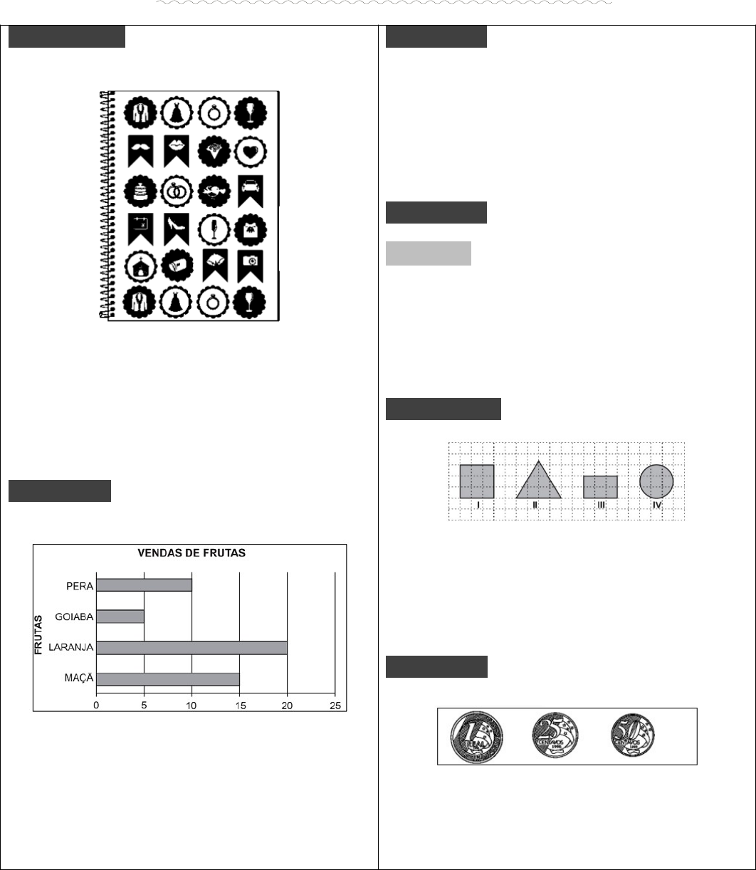 Cabeçalho da escola Aluno(a): ______________________________________________________________ 2º ano ___ Professora: ______________________________________________Data: ______/_______/2024 SONDAGEM / SIMULADO = MATEMÁTICA QUESTÃO 1 (CAED) OBSERVE ABAIXO AS FIGURINHAS QUE LÍVIA COLOU NA CAPA DE SEU CADERNO. QUANTAS FIGURINHAS, AO TODO, LÍVIA COLOU NA CAPA DE SEU CADERNO? A) 25. B) 24. C) 6. D) 4. QUESTÃO 2 (CAED) O GRÁFICO ABAIXO APRESENTA A QUANTIDADE DE FRUTAS QUE JOÃO VENDEU NA FEIRA EM UM DIA DE TRABALHO. DE ACORDO COM ESSE GRÁFICO, QUAL FOI A FRUTA MENOS VENDIDA? A) GOIABA. B) LARANJA. C) MAÇÃ. D) PERA. QUESTÃO 3 (CAED) VEJA OS NÚMEROS ABAIXO. 112 – 122 – 132 – 142 MARQUE UM X NO ÚLTIMO NÚMERO DO QUADRO. A) 112. B) 122. C) 132. D) 142. QUESTÃO 4 (CAED) RESOLVA A CONTA ABAIXO. 98 + 76 = QUAL O RESULTADO DESSA CONTA? A) 22. B) 124. C) 147. D) 174. QUESTÃO 5 (CAED) OBSERVE AS FIGURAS GEOMÉTRICAS ABAIXO. QUAL DESSAS FIGURAS É UM QUADRADO? A) I. B) II. C) III. D) IV. QUESTÃO 6 (CAED) VEJA AS MOEDAS ABAIXO. QUAL O VALOR DESSAS MOEDAS? A) 76 CENTAVOS. B) 1 REAL E 50 CENTAVOS. C) 1 REAL E 65 CENTAVOS. D) 1 REAL E 75 CENTAVOS. QUESTÃO 7 (CAED) OBSERVE OS NÚMEROS NO QUADRO ABAIXO. 80 - 65 – 39 - 26 QUAL DOS NÚMEROS ACIMA É O MENOR? A) 26. B) 39. C) 65. D) 80. QUESTÃO 8 A ESCOLA ONDE ALICE ESTUDA DIVULGOU UMA PESQUISA SOBRE AS FANTASIAS PREFERIDAS DAS CRIANÇAS EM PERÍODO DE CARNAVAL. DE ACORDO COM ESSE GRÁFICO, A FANTASIA DE DE OBTEVE QUANTOS VOTOS? A) 10 B) 15 C) 20 D) 25 QUESTÃO 9 (CAED) OBSERVE A LARANJA NO DESENHO ABAIXO. A FORMA DESSA LARANJA SE ASSEMELHA A QUAL SÓLIDO GEOMÉTRICO? QUESTÃO 10 (CAED) A TABELA ABAIXO APRESENTA AS ATIVIDADES QUE LARISSA FAZ NOS DIAS DE SEMANA APÓS A ESCOLA. DE ACORDO COM ESSA TABELA, QUAL É A ATIVIDADE QUE LARISSA FAZ ÀS SEGUNDAS-FEIRAS APÓS A ESCOLA? A) INGLÊS. B) NATAÇÃO. C) TEATRO. D) VÔLEI. QUESTÃO 11 (CAED) ALICE FEZ UMA VIAGEM QUE DUROU 2 SEMANAS. QUANTOS DIAS DUROU ESSA VIAGEM DE ALICE? A) 2 B) 7 C) 10 D) 14. QUESTÃO 12 (CAED) OBSERVE ABAIXO A DECOMPOSIÇÃO DE UM NÚMERO. 2 DEZENAS E 7 UNIDADES ESSA É A DECOMPOSIÇÃO DO NÚMERO A) 27 B) 72 C) 207 D) 270 QUESTÃO 13 (CAED) QUAL DAS FORMAS GEOMÉTRICAS ABAIXO REPRESENTA UM CÍRCULO? QUESTÃO 14 (CAED) OBSERVE ABAIXO AS CRIANÇAS NA SALA DE AULA. QUAL É A CRIANÇA QUE ESTÁ ENTRE PEDRO E MATEUS? A) JÉSSICA. B) JOÃO. C) LAURA. D) MARCOS. QUESTÃO 15 (CAED) OBSERVE NO RELÓGIO ABAIXO O HORÁRIO QUE TEREZA SAIU DE CASA PARA PASSEAR. DE ACORDO COM ESSE RELÓGIO, EM QUAL HORÁRIO TEREZA SAIU DE CASA PARA PASSEAR? A) 1 HORA E 20 MINUTOS. B) 2 HORAS E 1 MINUTO. C) 12 HORAS. D) 15 HORAS. QUESTÃO 16 (CAED) OBSERVE A SEQUÊNCIA NUMÉRICA ABAIXO. 16 – 26 – ___ – 46 – 56 ELA COMEÇOU NO 16 E TERMINOU NO 56. QUAL É O NÚMERO QUE COMPLETA ESSA SEQUÊNCIA NUMÉRICA? A) 27. B) 31. C) 36. D) 45. QUESTÃO 17 (CAED) RESOLVA A OPERAÇÃO ABAIXO. QUAL É O RESULTADO DESSA OPERAÇÃO? A) 10. B) 12. C) 22. D) 92. QUESTÃO 18 (CAED) OBSERVE ABAIXO A QUANTIA QUE JEFERSON GASTOU NA MERCEARIA. QUAL FOI A QUANTIA QUE JEFERSON GASTOU NA MERCEARIA? A) 5 REAIS. B) 10 REAIS. C) 12 REAIS. D) 15 REAIS. QUESTÃO 19 (CAED) EM UMA PARTIDA DE BASQUETE, SAMUEL FEZ 16 PONTOS E LUCAS FEZ 9 PONTOS. QUANTOS PONTOS LUCAS FEZ A MENOS QUE SAMUEL NESSA PARTIDA DE BASQUETE? A) 7. B) 8. C) 16. D) 25. QUESTÃO 20 (CAED) O GRÁFICO ABAIXO MOSTRA O RESULTADO DE UMA PESQUISA SOBRE O TIPO DE CALÇADO ESCOLHIDO PELAS PROFESSORAS DE UMA ESCOLA. DE ACORDO COM ESSE GRÁFICO, QUAL É O CALÇADO MENOS ESCOLHIDO PELAS PROFESSORAS DESSA ESCOLA? image4.png image5.png image6.png image7.png image8.png image9.png image10.png image11.png image12.png image13.png image14.png image15.png image16.png image1.png image2.png image3.png