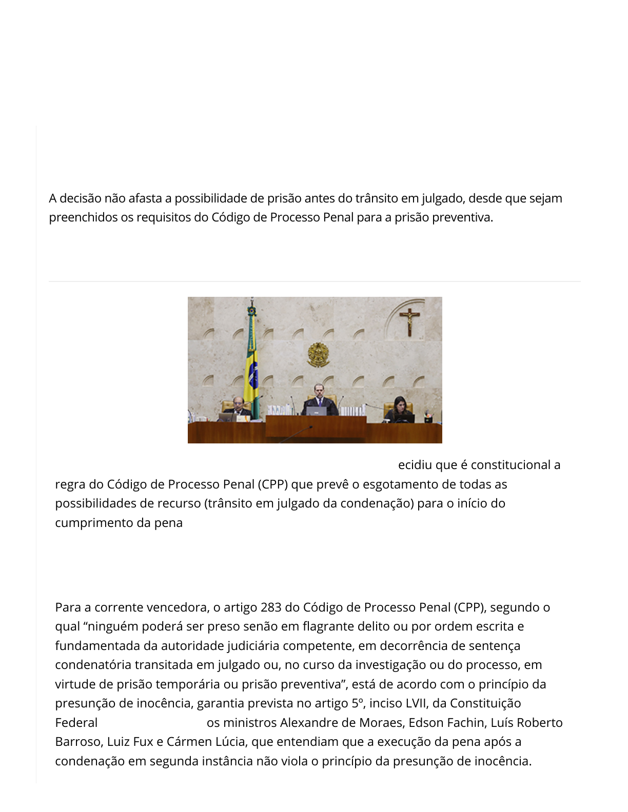 28/04/2020 Supremo Tribunal Federal portal.stf.jus.br/noticias/verNoticiaDetalhe.asp?idConteudo=429359&ori=1 1/4 STF decide que cumprimento da pena deve começar após esgotamento de recursos A decisão não afasta a possibilidade de prisão antes do trânsito em julgado, desde que sejam preenchidos os requisitos do Código de Processo Penal para a prisão preventiva. 07/11/2019 22h32 - Atualizado há Por maioria, o Plenário do Supremo Tribunal Federal (STF) decidiu que é constitucional a regra do Código de Processo Penal (CPP) que prevê o esgotamento de todas as possibilidades de recurso (trânsito em julgado da condenação) para o início do cumprimento da pena. Nesta quinta-feira (7), a Corte concluiu o julgamento das Ações Declaratórias de Constitucionalidade (ADC) 43, 44 e 54, que foram julgadas procedentes. Votaram a favor desse entendimento os ministros Marco Aurélio (relator), Rosa Weber, Ricardo Lewandowski, Gilmar Mendes, Celso de Mello e Dias To�oli, presidente do STF. Para a corrente vencedora, o artigo 283 do Código de Processo Penal (CPP), segundo o qual “ninguém poderá ser preso senão em �agrante delito ou por ordem escrita e fundamentada da autoridade judiciária competente, em decorrência de sentença condenatória transitada em julgado ou, no curso da investigação ou do processo, em virtude de prisão temporária ou prisão preventiva”, está de acordo com o princípio da presunção de inocência, garantia prevista no artigo 5º, inciso LVII, da Constituição Federal. Ficaram vencidos os ministros Alexandre de Moraes, Edson Fachin, Luís Roberto Barroso, Luiz Fux e Cármen Lúcia, que entendiam que a execução da pena após a condenação em segunda instância não viola o princípio da presunção de inocência. d d d d b l 28/04/2020 Supremo Tribunal Federal portal.stf.jus.br/noticias/verNoticiaDetalhe.asp?idConteudo=429359&ori=1 2/4 A decisão não veda a prisão antes do esgotamento dos recursos, mas estabelece a necessidade de que a situação do réu seja individualizada, com a demonstração da existência dos requisitos para a prisão preventiva previstos no artigo 312 do CPP – para a garantia da ordem pública e econômica, por conveniência da instrução criminal ou para assegurar a aplicação da lei penal. O julgamento das ADCs foi iniciado em 17/10 (http://portal.stf.jus.br/noticias/verNoticiaDetalhe.asp?idConteudo=427195&ori=1) com a leitura do relatório do ministro Marco Aurélio e retomado em 23/10, com as manifestações das partes (http://portal.stf.jus.br/noticias/verNoticiaDetalhe.asp? idConteudo=427779&ori=1), o voto do relator (http://portal.stf.jus.br/noticias/verNoticiaDetalhe.asp?idConteudo=427785&ori=1) e os votos dos ministros Alexandre de Moraes, Edson Fachin e Luís Roberto Barroso (http://portal.stf.jus.br/noticias/verNoticiaDetalhe.asp?idConteudo=427866&ori=1). Na sessão de 24/10 (http://portal.stf.jus.br/noticias/verNoticiaDetalhe.asp? idConteudo=428003&ori=1), o julgamento prosseguiu com os votos dos ministros Rosa Weber, Luiz Fux e Ricardo Lewandowski. Na sessão de hoje, proferiram seus votos a ministra Cármen Lúcia e os ministros Gilmar Mendes, Celso de Mello e Dias To�oli. Ministra Cármen Lúcia A ministra aderiu à divergência aberta na sessão de 23/10 pelo ministro Alexandre de Moraes, ao a�rmar que a possibilidade da execução da pena com o encerramento do julgamento nas instâncias ordinárias não atinge o princípio da presunção de inocência. Segundo ela, o inciso LVII do artigo 5º da Constituição Federal deve ser interpretado em harmonia com os demais dispositivos constitucionais que tratam da prisão, como os incisos LIV (devido processo legal) e LXI (prisão em �agrante delito ou por ordem escrita). A e�cácia do direito penal, na compreensão da ministra, se dá em razão da certeza do cumprimento das penas. Sem essa certeza, “o que impera é a crença da impunidade”. A e�cácia do sistema criminal, no entanto, deve resguardar “a imprescindibilidade do devido processo legal e a insuperável observância do princípio do contraditório e das garantias da defesa”. Ministro Gilmar Mendes Em voto pela constitucionalidade do artigo 283 do CPP, o ministro Gilmar Mendes a�rmou que, após a decisão do STF, em 2016, que passou a autorizar a execução da pena antes do trânsito em julgado, os tribunais passaram a entender que o procedimento seria automático e obrigatório. Segundo o ministro, a decretação automática da prisão sem que haja a devida especi�cação e individualização do caso concreto é uma distorção do que foi julgado pelo STF. http://portal.stf.jus.br/noticias/verNoticiaDetalhe.asp?idConteudo=427195&ori=1 http://portal.stf.jus.br/noticias/verNoticiaDetalhe.asp?idConteudo=427779&ori=1 http://portal.stf.jus.br/noticias/verNoticiaDetalhe.asp?idConteudo=427785&ori=1 http://portal.stf.jus.br/noticias/verNoticiaDetalhe.asp?idConteudo=427866&ori=1 http://portal.stf.jus.br/noticias/verNoticiaDetalhe.asp?idConteudo=428003&ori=1 28/04/2020 Supremo Tribunal Federal portal.stf.jus.br/noticias/verNoticiaDetalhe.asp?idConteudo=429359&ori=1 3/4 j g p Para Mendes, a execução antecipada da pena sem a demonstração dos requisitos para a prisão viola o princípio constitucional da não culpabilidade. Ele salientou que, nos últimos anos, o Congresso Nacional aprovou alterações no CPP com o objetivo de adequar seu texto aos princípios da Constituição de 1988, entre eles o da presunção de inocência. Ministro Celso de Mello Ao acompanhar o relator, o ministro a�rmou que nenhum juiz do STF discorda da necessidade de repudiar e reprimir todas as modalidades de crime praticadas por agentes públicos e empresários delinquentes. Por isso, considera infundada a interpretação de que a defesa do princípio da presunção de inocência pode obstruir as atividades investigatórias e persecutórias do Estado. Segundo ele, a repressão a crimes não pode desr