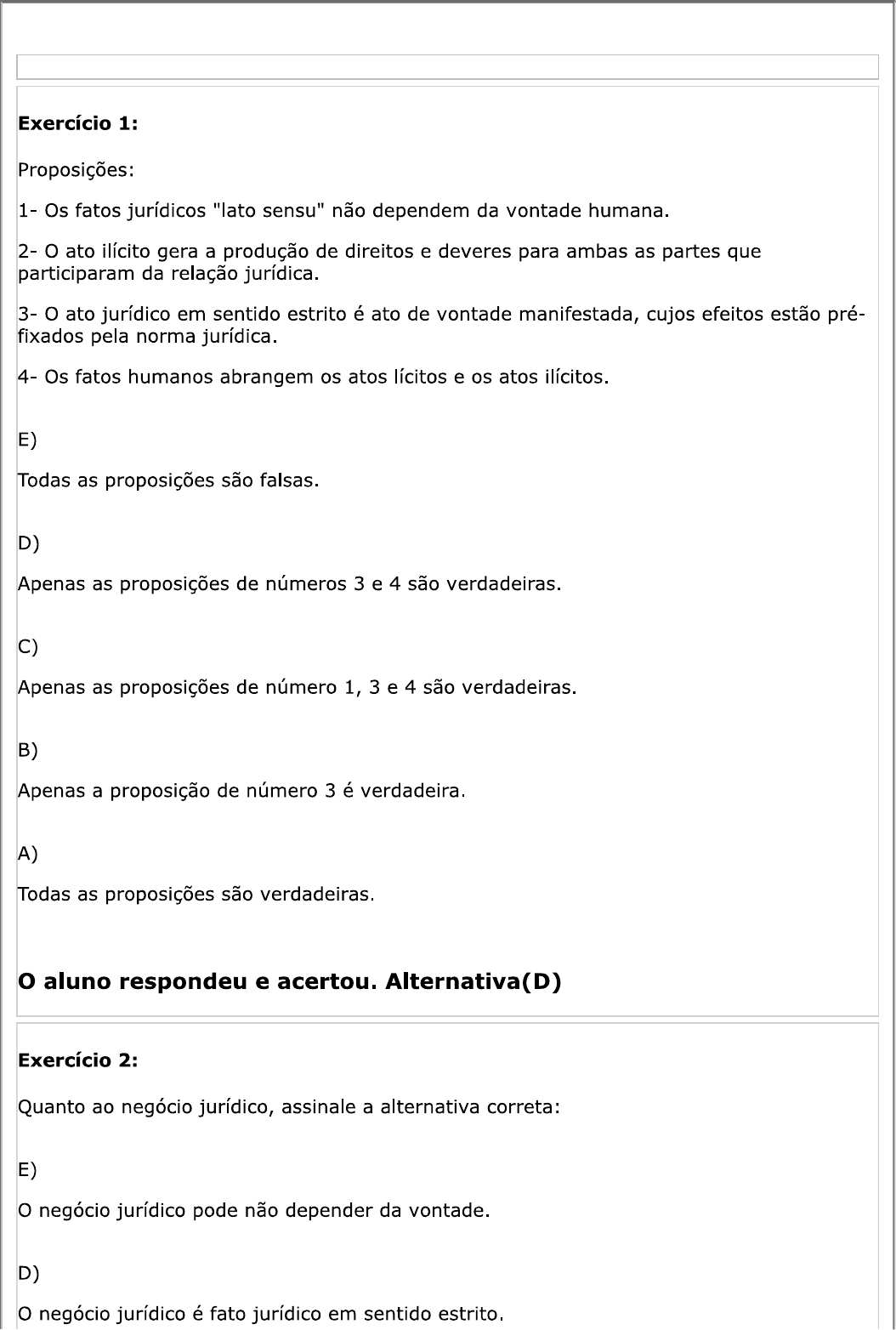 Exercício 1: Proposições: 1- Os fatos jurídicos "lato sensu" não dependem da vontade humana. 2- o ato ilícito gera a produção de direitos e deveres para ambas as partes que participaram da relação jurídica. 3- O ato jurídico em sentido estrito é ato de vontade manifestada, cujos efeitos estão pré- fixados pela norma jurídica. 4- Os fatos humanos abrangem os atos lícitos e os atos ilícitos. E) Todas as proposições são falsas. D) Apenas as proposições de números 3 e 4 são verdadeiras. C) Apenas as proposições de número 1, 3 e 4 são verdadeiras. B) Apenas a proposição de número 3 é verdadeira. A) Todas as proposições são verdadeiras. o aluno respondeu e acertou. Alternativa(D) Exercício 2: Quanto ao negócio jurídico, assinale a alternativa correta: E) O negócio jurídico pode não depender da vontade. D) O negócio jurídico é fato jurídico em sentido estrito.C) negócio jurídico é uma declaração da vontade destinada à produção de efeitos desejados pelas partes. B) O negócio jurídico é imposto pela lei e destina-se à produção de efeitos desejados pelas partes. A) negócio jurídico é uma declaração destinada à produção de efeitos impostos pela lei. aluno respondeu e acertou. Alternativa(C) Exercício 3: Os fatos jurídicos em sentido estrito: E) Todas as alternativas estão corretas. D) São atos ilícitos. C) São classificados em ordinários e extraordinários. B) São fatos naturais que dependem da vontade humana. A) São atos involuntários que constituem na violação de um preceito normativo. aluno respondeu e acertou. Alternativa(C) Exercício 4: Os fatos humanos são:E) Somente os contratos. D) Os atos jurídicos e os atos ilícitos. C) Os negócios jurídicos e os atos unilaterais. B) Os atos jurídicos e os negócios jurídicos. A) Os atos meramente lícitos, os negócios jurídicos e os atos ilícitos. o aluno respondeu e acertou. Alternativa(A) Exercício 5: A morte, o reconhecimento de um filho e o testamento são respectivamente: E) Ato lícito e contratos. D) Fato jurídico em sentido estrito ordinário, ato meramente lícito e negócio jurídico. C) Fato jurídico em sentido estrito extraordinário, negócio jurídico e ato meramente jurídico. B) Fato jurídico em sentido estrito extraordinário, ato jurídico em sentido estrito e negócio jurídico. A) Ato meramente jurídico, negócio jurídico e fato jurídico em sentido estrito extraordinário.o aluno respondeu e acertou. Alternativa(D) Exercício 6: Assinale a alternativa incorreta: E) Os pais são representantes por força de lei. D) Na representação, o representante pratica ato ou negócio jurídico em nome do representado. C) Os poderes de representação são conferidos pela lei ou pelo interessado. B) Todos os atos jurídicos podem ser praticados por intermédio da representação. A) Na representação, o representado se obriga por meio de ato praticado pelo representante. o aluno respondeu e acertou. Alternativa(B) Exercício 7: Analise as proposições a seguir e marque a única alternativa que contempla as afirmações CORRETAS: I - - fato jurídico em sentido estrito corresponde a todo acontecimento natural para o qual não concorra a atuação humana, podendo ser classificado como ordinário (fato da natureza de ocorrência comum) ou extraordinário (aquele inesperado, imprevisível). - ato jurídico em sentido estrito constitui simples manifestação de vontade, sem conteúdo negocial, que determina a produção de efeitos legalmente previstos. Não obstante despidos de conteúdo negocial, aplicam-se ao ato jurídico em sentido estrito, no que couber, as mesmas disposições estabelecidas no Código Civil em vigor para o negócio jurídico. III - Atos meramente lícitos, negócios jurídicos e ato-fato jurídico são expressões sinônimas. IV Fato jurídico em sentido amplo é todo acontecimento da vida que o ordenamentojurídico considera relevante no campo do direito. V - Ato jurídico em sentido estrito tem como exemplos manifestações de vontade cujos efeitos estão predeterminados em lei, tais como a tradição, o reconhecimento de filho, a ocupação, a constituição do devedor em mora. E) Estão corretas apenas as afirmações I, III e V. D) Está correta apenas a afirmação II. C) Estão corretas apenas as afirmações e IV. B) Estão corretas apenas as afirmações II, IV e V. A) Está correta apenas a afirmação III. aluno respondeu e acertou. Alternativa (B) Exercício 8: Assinale a alternativa que corresponda somente a fatos jurídicos em sentido estrito ordinários. E) terremoto, tempestade, inundação. D) nascimento, decurso de tempo, terremoto. C) maioridade, morte, nascimento. B) morte, terremoto, enchente.A) inundação, morte, maioridade. o aluno respondeu e acertou. Exercício 9: Sobre a representação prevista no Código Civil, responda: I. É anulável o negócio jurídico que o representante celebrar consigo mesmo, salvo se expressamente permitido por lei ou pelo representado. II. Caso o representante substabeleça seus poderes, poderá celebrar negócios com o substabelecido sem que esteja sujeito a anulação e independentemente de permissão expressa da lei ou do representado. III. O negócio concluído pelo representante em conflito de interesses com o representado é anulável, independentemente do conhecimento de quem celebrou o negócio com o representante. Assinale a alternativa correta: E) Todas as assertivas são falsas. D) Apenas a assertiva III é verdadeira. C) Apenas a assertiva I é verdadeira. B) Apenas as assertivas e III são verdadeiras. A) Todas as assertivas são verdadeiras.o aluno respondeu e acertou. Alternativa(C) Exercício 10: Uma enchente é considerada: E) nenhuma das anteriores. D) fato antijurídico. C) fato jurídico natural. B) um ato A) um negócio jurídico. o aluno respondeu e acertou. Alternativa(C) Exercício 11: Um contrato de venda e compra de um imóvel é classificado como: E