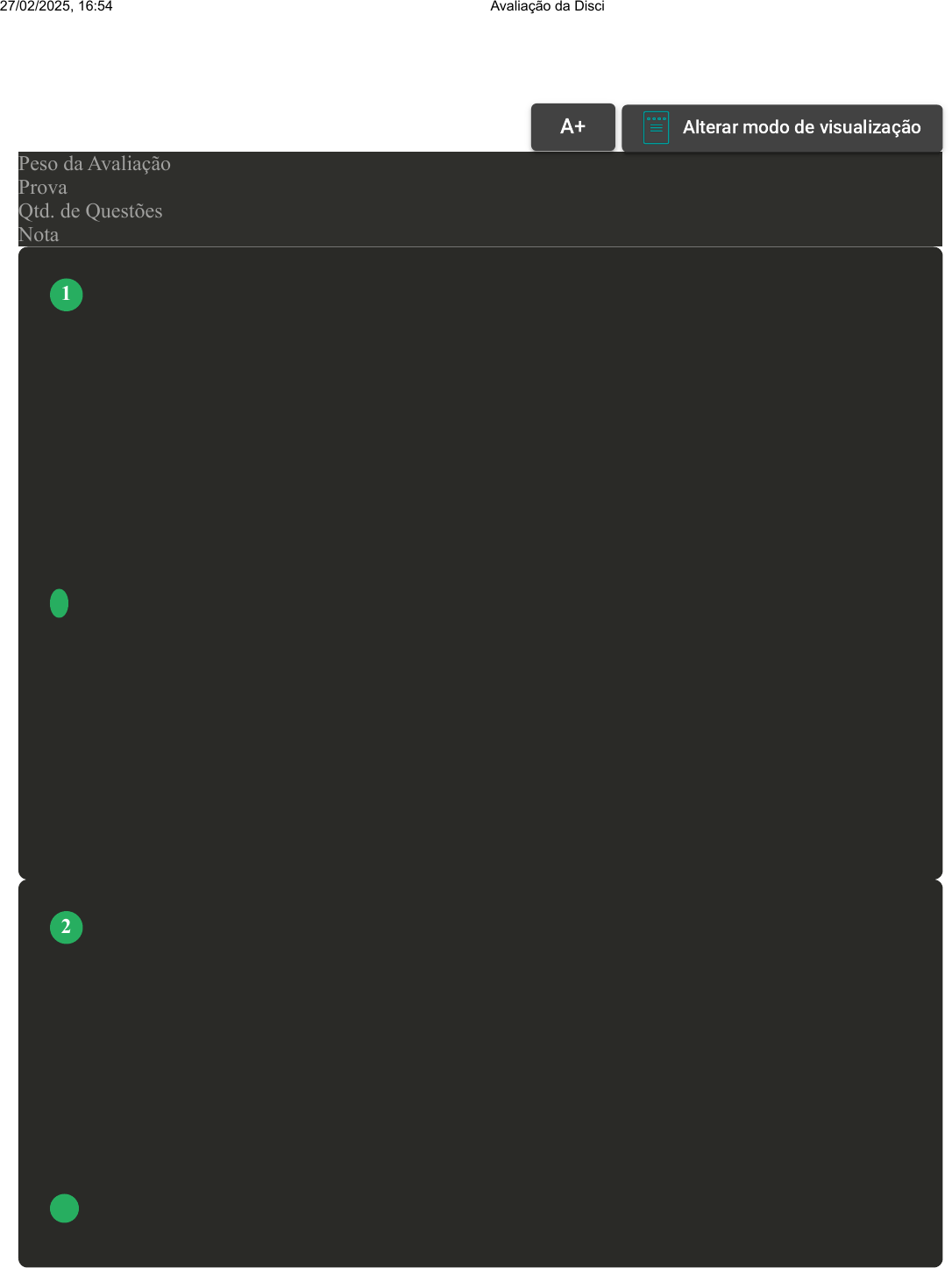 Prova Impressa GABARITO | Avaliação da Disciplina (Cod.:678057) Peso da Avaliação 10,00 Prova 93975131 Qtd. de Questões 20 Nota 10,00 Por sua complexidade, a área de gestão de pessoas possui vários processos que possibilitam melhor cuidado com os colaboradores das empresas. A área de gestão de pessoas trata de diversas áreas que envolvem as pessoas, inclusive o departamento que trata de questões mais burocráticas e cumprimento da legislação vigente (Guimarães, 2020). O Departamento de Pessoal e Legislação tem por objetivo efetivar todos os registros legais e necessários para a ocorrência da relação de emprego entre empregado e empregador, mediante um contrato de trabalho e aplicação das Leis trabalhistas. Sobre as funções desse departamento, assinale a alternativa CORRETA: FONTE: GUIMARÃES, B. Gestão de Pessoas: o que é, processos, objetivos e pilares. 2020. Disponível em: https://www.gupy.io/blog/gestao-de- pessoas. A Admissões e desligamentos, cálculos legais, encargos sociais, aplicação de normas disciplinares, controle do banco de horas e controle absenteísmo. B Admissões, promoções, transferências, treinamento, distribuição dos benefícios, controle do banco de horas e elaboração da eleição da CIPA. C Demissões e desligamentos, entrevistas de seleção e realocação de postos de trabalho, treinamento dos novos colaboradores, distribuição dos benefícios, controle do banco de horas e absenteísmo. D Elaboração e execução do planejamento estratégico de empregados necessários, para atender a demanda do mercado de mão de obra. Falar claramente, verdadeiramente e de forma transparente é uma das tarefas mais importantes do líder. O verdadeiro líder sabe disso e dedica parte do seu tempo para conversar com a equipe. Essas são características da competência de liderança chamada: A Reconhecimento. B Motivação. C Feedback. D Comunicação. VOLTAR A+ Alterar modo de visualização 1 2 27/02/2025, 16:54 Avaliação da Disciplina about:blank 1/10 Desenvolver as pessoas é uma das tarefas mais importantes para as organizacionais hoje, a fim de enfrentar este cenário altamente volátil e competitivo, sendo uma das tarefas mais críticas para o gestor de pessoas. O perfil da população mudou e os profissionais possuem outros anseios e cabe à organização buscar um certo equilíbrio para manter e atrair recursos humanos interessantes. As empresas precisam contar com colaboradores capacitados para atuar em momentos de tensão e isso, por sua vez, exige um time preparado e alinhado com os objetivos organizacionais, passa pela reinvenção dos trabalhadores e processos internos. Sobre a ferramenta que contribui para o desenvolvimento das pessoas, assinale a alternativa CORRETA: A Treinamento. B Mobilização vertical. C Avaliação de desempenho. D Promoção. A Gestão de Pessoas é de vital importância para a organização, pois é considerada uma área multivariada e formada por processos que possuem atividades específicas, como o departamento pessoal e voltadas à administração do capital humano nas organizações. Dentre os setores que compõe a área de Gestão de Pessoas, o Departamento Pessoal exerce atuação específica e fundamental na administração das pessoas na organização. Com base no exposto, analise as afirmativas a seguir: I- O setor de Departamento Pessoal é um dos mais antigos de Gestão de Pessoas e assume grande responsabilidade ao ser o departamento responsável pela aplicabilidade das leis e das normas organizacionais. II- Compete ao Departamento Pessoal cumprir com as obrigações trabalhistas, previdenciárias, sindicais e governamentais. III- O Departamento Pessoal deve realizar rotinas legais de acordo com as leis trabalhistas vigentes, com o propósito de assegurar e evitar que a empresa sofra possíveis reclamações trabalhistas. IV- É de responsabilidade do Departamento Pessoal a seleção, a contratação, o desligamento e o treinamento dos colaboradores que compõem a organização. Assinale a alternativa CORRETA: A As afirmativas I e IV estão corretas. B Somente a afirmativa III está correta. C As afirmativas I, II e III estão corretas. 3 4 27/02/2025, 16:54 Avaliação da Disciplina about:blank 2/10 D Somente a afirmativa I está correta. ”O digital não é especialidade nem objeto de ações de marketing. Quando referíamos à mobile marketing, marketing de busca, marketing em redes sociais, marketing de relacionamento, estamos nos referindo a todas as ações estratégicas dessas modalidades enfocadas na especificidade mobile, search, social media, relacionamento.“ Sobre como o marketing digital implementado dentro de uma empresa deve ser visto, assinale a alternativa CORRETA: FONTE: GABRIEL, Martha. Marketing na era digital. São Paulo: Novatec Editora, 2010. A A ferramenta mais eficaz para qualquer objetivo planejado pela empresa e por isso a de maior investimento. B Um conhecimento específico da área de Tecnologia de Informação e que pode apenas ter auxílio do departamento de Marketing. C Uma estratégia agregada ao plano de marketing, que deve considerar todos os conceitos tradicionais como segmentação, posicionamento, relacionamento, entre outros. D Um canal de comunicação com o consumidor igual aos demais, como telefone e e-mail, mas sem custo para atender as mensagens. Ao longo dos anos surgiram diferentes teorias da liderança, todas com o objetivo de entender, analisar e definir melhor como essa dinâmica funciona e quais circunstâncias levam uma pessoa a se tornar um verdadeiro líder. Dito isso, relacione as teorias da liderança com suas respectivas características: I – Teoria dos traços da personalidade. II – Teoria contingencial ou situacional. III – Teoria do caminho-meta. ( ) Determinada condição faz surgir o líder necessário e conveniente. ( ) O caráter e a personalidade distinguem o líder do não-líder. ( ) O comportamento do líder é a 