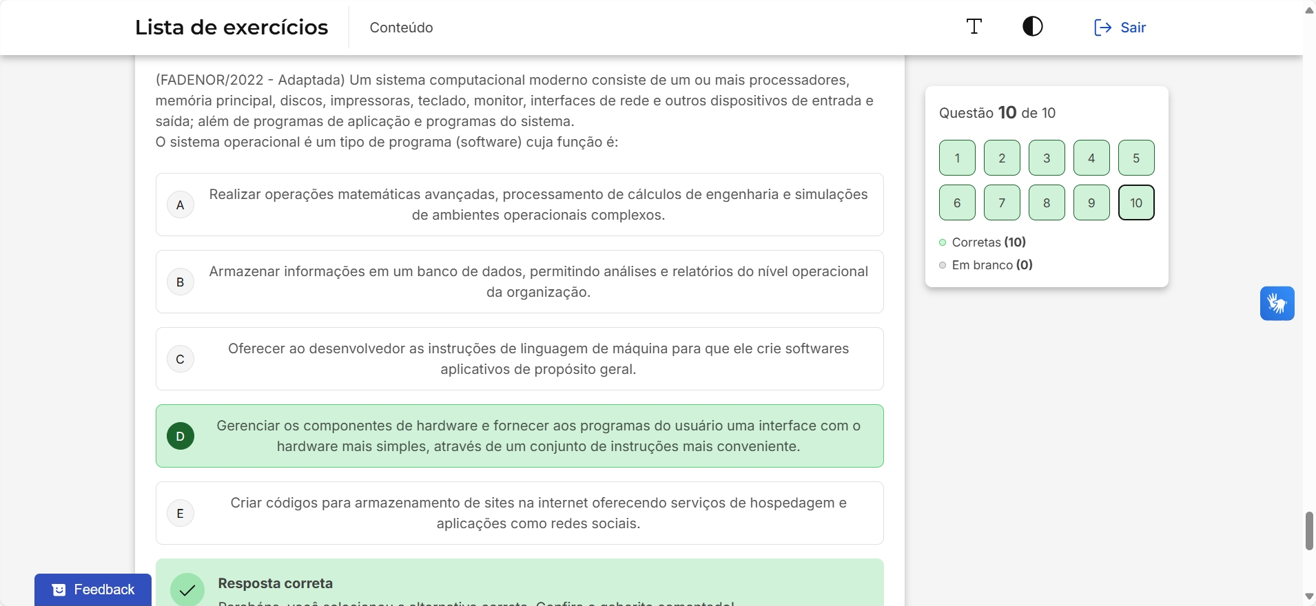 Lista de exercícios Conteúdo T Sair (FADENOR/2022 - Adaptada) Um sistema computacional moderno consiste de um ou mais processadores, memória principal, discos, impressoras, teclado, monitor, interfaces de rede e outros dispositivos de entrada e Questão 10 de 10 saída; além de programas de aplicação e programas do sistema. sistema operacional é um tipo de programa (software) cuja função é: 1 2 3 4 5 Realizar operações matemáticas avançadas, processamento de cálculos de engenharia e simulações A 6 7 8 9 10 de ambientes operacionais complexos. Corretas (10) Armazenar informações em um banco de dados, permitindo análises e relatórios do nível operacional Em branco (0) B da organização. Oferecer ao desenvolvedor as instruções de linguagem de máquina para que ele crie softwares C aplicativos de propósito geral. Gerenciar os componentes de hardware e fornecer aos programas do usuário uma interface com o D hardware mais simples, através de um conjunto de instruções mais conveniente. Criar códigos para armazenamento de sites na internet oferecendo serviços de hospedagem e E aplicações como redes sociais. Feedback Resposta correta