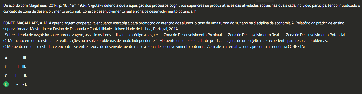 De acordo com Magalhães (2014, p. 18), "em 1934, Vygotsky defendia que a aquisição dos processos cognitivos superiores se produz através das atividades sociais nas quais cada indivíduo participa, tendo introduzido conceito de zona de desenvolvimento proximal, [zona de desenvolvimento real e zona de desenvolvimento potencial]" FONTE: A. M. A aprendizagem cooperativa enquanto estratégia para promoção da atenção dos alunos: caso de uma turma do 10° ano na disciplina de economia A. Relatório da prática de ensino supervisionada. Mestrado em Ensino de Economia e Contabilidade. Universidade de Lisboa, Portugal, 2014. Sobre a teoria de Vygotsky sobre aprendizagem, associe os itens, utilizando código a seguir: I - Zona de Desenvolvimento - Zona de Desenvolvimento Real.III - Zona de Desenvolvimento Potencial. Momento em que estudante realiza ações ou resolve problemas de modo independente.() Momento em que estudante precisa da ajuda de um sujeito mais experiente para resolver problemas. () Momento em que estudante encontra-se entre a zona de desenvolvimento real e a zona de desenvolvimento potencial. Assinale a alternativa que apresenta a sequência CORRETA: A I II III. B II- III. D II III I.