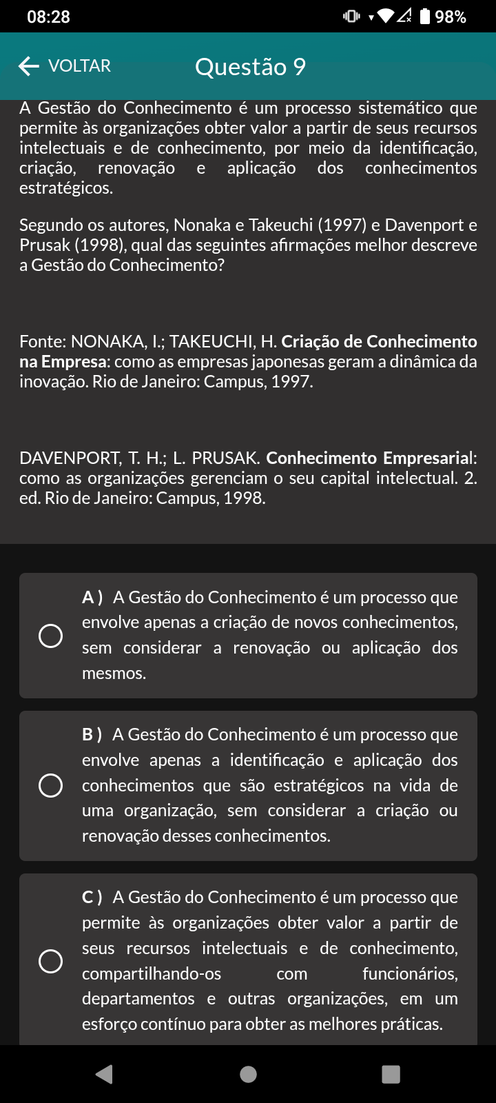 08:28 98% VOLTAR Questão 9 A Gestão do Conhecimento é um processo sistemático que permite às organizações obter valor a partir de seus recursos intelectuais e de conhecimento, por meio da identificação, criação, renovação e aplicação dos conhecimentos estratégicos. Segundo os autores, Nonaka e Takeuchi (1997) e Davenport e Prusak (1998), qual das seguintes afirmações melhor descreve a Gestão do Conhecimento? Fonte: NONAKA, I.; TAKEUCHI, H. Criação de Conhecimento na Empresa: como as empresas japonesas geram a dinâmica da inovação. Rio de Janeiro: Campus, 1997. DAVENPORT, T. H.; L. PRUSAK. Conhecimento Empresarial: como as organizações gerenciam seu capital intelectual. 2. ed. Rio de Janeiro: Campus, 1998. A) A Gestão do Conhecimento é um processo que envolve apenas a criação de novos conhecimentos, sem considerar a renovação ou aplicação dos mesmos. B) A Gestão do Conhecimento é um processo que envolve apenas a identificação e aplicação dos conhecimentos que são estratégicos na vida de uma organização, sem considerar a criação ou renovação desses conhecimentos. C) A Gestão do Conhecimento é um processo que permite às organizações obter valor a partir de seus recursos intelectuais e de conhecimento, compartilhando-os com funcionários, departamentos e outras organizações, em um esforço contínuo para obter as melhores práticas.
