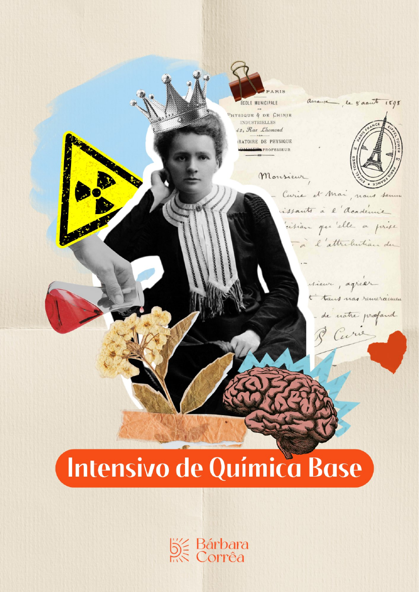 PARIS ÉCOLE MUNICIPALE 1898 PHYSIQUE & DE CHIMIE INDUSTRIELLES 42, Rue Lhomond FRANCE RATOIRE DE PHYSIQUE PROFESSEUR 18 Curie a l a l attribution du agreer t was de Curie Intensivo de Química BaseIntensivo de Química Base Material produzido por Bárbara Corrêa em conjunto de Professoras de Química Luciana Borges do Amaral @luciana.jpeg Maria Isabel Martins da Rocha @mariamrtnss Designer para redes sociais Aline Corona @alineccorona Este trabalho está licenciado sob CC BY-NC-ND 4.0. Para visualizar uma = cópia desta licença, visite BY NC ND 2 por Bárbara Aviso legal: Os materiais e conteúdos disponibilizados pela Bárbara Corrêa são protegidos por direito de propriedade intelectual (Lei n°9.610/1998). É vedada a utilização para fins comerciais, bem como a cessão de materiais a terceiros, a título gratuito ou não, sob pena de responsabilização civil e criminal nos termos da legislaçãoSumário Estudo da Matéria e Estados Físicos 5 Grandezas Químicas 8 Propriedades da Matéria 10 Comportamento Anômalo da Água 13 Substâncias, Sistemas e Misturas 15 Fenômenos Físicos e Químicos 19 Modelos Atômicos 21 Partículas Subâtomicas 23 Distribuição Eletrônica 25 Números Quânticos 27 Tabela Periódica 29 Aviso legal: Os materiais e conteúdos disponibilizados pela Bárbara Corrêa são protegidos por direito de propriedade intelectual (Lei n°9.610/1998). É vedada a utilização para fins comerciais, bem como a cessão de materiais a terceiros, a título gratuito ou não, sob pena de responsabilização civil e criminal nos termos da legislaçãoApresentação Olá querido estudante, Sou Bárbara Corrêa, professora de química formada pela Universidade Federal de Santa Catarina, apaixonada por educar e transformar vidas. Ao longo dos anos, tenho buscado revolucionar a forma como a química é percebida pelos estudantes brasileiros, e hoje estou muito empolgada em compartilhar com você uma ferramenta valiosa que desenvolvi para auxiliá-lo nessa trajetória educacional: meu livro de resumos de química. Como educadora, a jornada de muitos estudantes que, com dedicação e foco, alcançaram seus objetivos nas melhores instituições de ensino do país. Esse sucesso não é apenas uma conquista pessoal, mas sim o resultado do comprometimento mútuo entre aluno e professor, onde juntos aprendemos, crescemos intelectualmente e emocionalmente, enfrentamos desafios e celebramos vitórias. O material que tenho a honra de apresentar a você é fruto dessa experiência compartilhada. Desenvolvi cuidadosamente resumos de química que sintetizam os principais conceitos de forma clara e objetiva. Meu intuito é fornecer a você uma ferramenta que simplifica o aprendizado, permitindo uma compreensão mais profunda e, consequentemente, o sucesso nas avaliações. A química está em constante evolução, e eu acredito que, ao os estudantes estarão mais preparados para os desafios acadêmicos e profissionais que o futuro reserva. Este livro não é apenas um guia, mas sim um companheiro de estudos que será seu aliado durante essa fase desafiadora. Os resumos foram elaborados pensando não somente na compreensão dos conteúdos, mas também em despertar o interesse pela química, tornando-a uma disciplina acessível e fascinante. Seja bem-vindo(a) ao mundo transformador da química, e que esta apostila feita com muito cuidado e muita entrega seja uma ferramenta valiosa em sua trajetória. Juntos, vamos construir um caminho brilhante, baseado no conhecimento, na dedicação e na paixão pelo aprendizado. Com carinho, Bárbara BárbaraEstudo da Matéria e Estados FísicosEstados físicos da matéria ESTADOS FÍSICOS FORMA VOLUME ORGANIZAÇÃO DA MATÉRIA SÓLIDO DEFINIDA DEFINIDO com interações intensas e pouca energia cinética LÍQUIDO VARIÁVEL Proximidade média de DEFINIDO átomos/moléculas com interações Baixa proximidade de GASOSO VARIÁVEL VARIÁVEL sem muitas interações Além dos três estados físicos mais comuns, existem outros dois pouco difundidos mas muito importantes Não é um estado comum da Nessa fase, as partículas de uma matéria aqui na Terra, mas pode substância têm mais energia ser o estado mais comum da cinética que as de um sólido. Não matéria no universo. plasma são mantidas em um arranjo consiste em partículas altamente regular, mas ainda estão muito carregadas com energia cinética próximas umas das outras, de extremamente alta. Estrelas são modo que os líquidos possuam um essencialmente bolas de plasma volume definido. superaquecidas. Líquido Plasma Sólido Condensado de Gases Base-Einstein (BEC) No estado sólido, a força coesiva As partículas de gás têm muito Também conhecido como "luz da matéria é forte o suficiente espaço entre elas e possuem alta líquida", esse estado ocorre para manter as ou energia Se não quando os átomos de gás com átomos nas posições dadas, as partículas de um densidade baixa são resfriados até restringindo a mobilidade gás se espalham indefinidamente; quase zero absoluto (-273,15 se confinado, o gás se expande ou OK) e se agrupam para formar para preencher seu recipiente. um estado quântico altamente denso. Nesta temperatura extremamente baixa, o movimento molecular praticamente para. Bárbara Bárbara 6 Material produzido por Bárbara Corrêa @babicorrea Todos os direitos reservadosSólido cristalino X Sólido amorfo Sólido cristalino Estrutura organizada lentamente em formas regulares e estáveis, gerando um arranjo ordenado. Ex: Diamante, o silício, minerais. Sólido amorfo Solidificação acontece rapidamente e as partículas perdem mobilidade antes de se organizarem o que gera uma estrutura irregular, similar a estrutura de um líquido. Ex: parafina, sabões, vidro, vários polímeros (poliestireno, por exemplo). Bárbara Mudança dos estados de agregação Aumenta a entalpia (H) e entropia Processos endotérmicos fusão SÓLIDO LÍQUIDO GASOSO sublimação e ressublimação 
