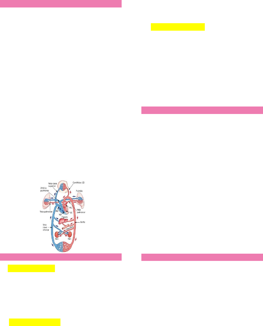 Mirele Letícia – Graduanda em Odontologia Mirele Letícia – Graduanda em Odontologia Morfofisiologia do Sistema Circulatório ● Sistema Circulatório difere do Sistema Cardiovascular; ● Sistema Cardiovascular + Sistema Linfático = Sistema Circulatório (transporta sangue e linfos pelo corpo); ● O Sistema Circulatório é composto por sangue, coração, artérias, veias, capilares e linfático (vasos e linfonodos – nódulos que estão relacionados ao sistema imunológico); ● Coração -> Artérias -> Capilares -> Veias -> Coração; ● Fluxo Sanguíneo: O sangue sai do coração e vai para as artérias (grandes vasos que irão se dividir em vasos menores, até formar os capilares), os capilares começam a se unir e formam as veias, e as veias trazem o sangue de volta para o coração; ● Se por algum motivo o sangue for no sentido contrário ao fluxo, tem-se um refluxo. ● Volume de sangue é de cerca de 79ml por kg de peso; ● O lado esquerdo do coração, em vermelho, é rico em oxigênio, enquanto o lado direito, em azul, tem sangue pobre em oxigênio. Tipos de circulação ● Grande Circulação: transporta oxigênio para o corpo e volta desoxigenado; ● Circulação sistêmica pelo organismo (transporta oxigênio para todos os sistemas, exceto o sistema respiratório); ● Começa no ventrículo esquerdo e termina no átrio direito. ● Pequena Circulação: oxigena o sangue nos pulmões (entra desoxigenado e volta oxigenado para o coração); ● Circulação pulmonar; ● Começa no ventrículo direito, vai apenas para os pulmões e termina no átrio esquerdo. ● Circulação coronária: circulação própria do coração. Sai do ventrículo esquerdo (oxigenado), irriga o coração e termina no átrio direito (desoxigenado). OBS.: Sopro no coração: presença de um orifício entre os dois átrios, ocasionando a mistura do sangue oxigenado e desoxigenado, fazendo com que o coração precise bater mais vezes para oxigenar o sangue. Portanto, a especialização de um lado oxigenado e outro desoxigenado é de extrema importância, pois a eficiência do coração é melhorada. Sangue ●Transporte de gases respiratórios (função mais importante); ● Transporte de materiais nutritivos; ●Transporte de excretas; ● Manutenção da homeostase: através da regulação do pH nos tecidos; ● Auxiliar na regulação da temperatura do corpo: proporciona meios para dissipar o calor; ● Defesa dos tecidos contra substâncias tóxicas estranhas ao corpo: através de células fagocíticas e anticorpos no sangue; ● Auxiliar na regulação do volume de fluído nos tecidos e seu conteúdo; ● Prevenção de perda excessiva de líquidos: através do mecanismo da coagulação. ● Transporte de produtos celulares: transporte de hormônios para as células. Coração ● Bomba sanguínea; ● Forma de cone; ● Aproximadamente do tamanho de uma mão; ● Base e vértice (ápice); ● 4 Cavidades: ● 2 átrios; ● 2 ventrículos. ● Fisiologia do coração (contração): Fisiologia Humana Mirele Letícia – Graduanda em Odontologia Mirele Letícia – Graduanda em Odontologia ● Sístole: fase de contração do coração, onde o sangue é bombeado para os vasos sanguíneos; ● O coração não se contrai todo ao mesmo tempo. A contração cardíaca acontece em 3 tempos: ● Sístole auricolar (ou atrial): que se refere à contração dos átrios; ● Sístole ventricular: que se refere à contração dos ventrículos; ● Diástole geral: breve momento em que todas as quatro câmaras estão relaxadas simultaneamente Obs.: qualquer coisa que fuja desse ritmo é considerada arritmia cardíaca. ● Diástole: fase de relaxamento (dilatação), fazendo com que o sangue entre no coração; ● Feixe condutor: rede de células especializadas que transmitem impulsos elétricos para os músculos cardíacos. ● Átrio direito -> Valva tricúspide -> Ventrículo direito -> Valva pulmonar -> Artéria -> Pulmão -> Veia -> Átrio esquerdo -> Valva mitral -> Ventrículo esquerdo -> Valva Aórtica -> Artéria -> Organismo -> Veia -> Átrio direito. ● Sistema Nervoso Autônomo: ● Taquicardia ● Bradicardia ● Feixe condutor (autonomia): ● Os tecidos especializados que geram e conduzem impulsos elétricos (contração) através do coração, são: 1. Nódulo sinusal ou seio-auricular (SA): situado no átrio direito, marca passo (dita o ritmo). Produz o impulso elétrico que irá percorrer o átrio através das fibras musculares. O átrio irá se contrair e a eletricidade chega na estrutura 2; 2. Nódulo aurículoventricular (AV): se situa no septo interauricolar. Conduz eletricidade para o ventrículo. A contração ventricular é atrasada em relação à contração do átrio, pois a eletricidade do átrio não passa diretamente para o ventrículo, em decorrência de uma parede fibrosa que se estabelece entre o átrio e o ventrículo. A contração ventricular inicia-se mais lentamente porque a eletricidade cardíaca terá que percorrer um caminho maior até alcançar a parede lateral do ventrículo; ● Feixe de Hiss: localizado no vértice do coração. Conduz eletricidade, mas não contrai o coração; ● Fibras de Purkinje: emergem dos ramos do feixe de Hiss. Começa a contração do ventrículo. ● Frequência cardíaca: ● 70 a 80 por minuto. ● Eletrocardiograma: ● Onda P à despolarização atrial: representa a ativação dos átrios; ● Complexo QRS à despolarização ventricular: representa a ativação dos ventrículos. ● Onda T à repolarização ventricular, mascara a repolarização atrial: onda de recuperação; ● O relaxamento do átrio não aparece no eletrocardiograma, pois como ele acontece simultaneamente com o relaxamento do ventrículo, e o ventrículo, por ser maior, o relaxamento do ventrículo esconde o relaxamento do átrio. Vasos sanguíneos ● Artérias: são vasos que recebem o sangue que está saindo do coração e irrigam para o