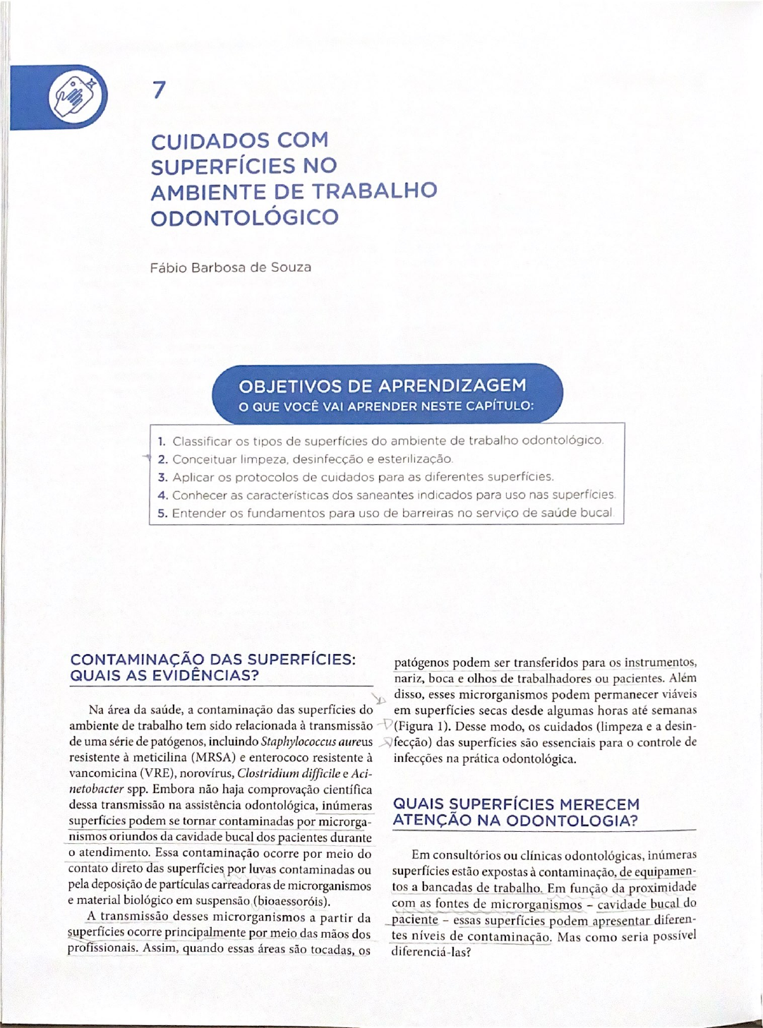7 CUIDADOS COM SUPERFÍCIES NO AMBIENTE DE TRABALHO ODONTOLÓGICO Fábio Barbosa de Souza OBJETIVOS DE APRENDIZAGEM QUE VOCÊ VAI APRENDER NESTE CAPÍTULO: 1. Classificar os tipos de superfícies do ambiente de trabalho odontológico. 2. Conceituar limpeza, desinfecção e esterilização. 3. Aplicar os protocolos de cuidados para as diferentes superfícies. 4. Conhecer as características dos saneantes indicados para uso nas 5. Entender os fundamentos para uso de barreiras no serviço de saúde bucal CONTAMINAÇÃO DAS SUPERFÍCIES: patógenos podem ser transferidos para os instrumentos, QUAIS AS EVIDÊNCIAS? nariz, boca e olhos de trabalhadores ou pacientes. Além disso, esses microrganismos podem permanecer viáveis Na área da saúde, a contaminação das superfícies do em superfícies secas desde algumas horas até semanas ambiente de trabalho tem sido relacionada à transmissão (Figura 1). Desse modo, os cuidados (limpeza e a desin- de uma série de patógenos, incluindo Staphylococcus aureus fecção) das superfícies são essenciais para o controle de resistente à meticilina (MRSA) e enterococo resistente à infecções na prática odontológica. vancomicina (VRE), norovírus, Clostridium difficile e Aci- netobacter spp. Embora não haja comprovação científica dessa transmissão na assistência odontológica, inúmeras QUAIS SUPERFÍCIES MERECEM superfícies podem se tornar contaminadas por microrga- ATENÇÃO NA ODONTOLOGIA? nismos oriundos da cavidade bucal dos pacientes durante o atendimento. Essa contaminação ocorre por meio do Em consultórios ou clínicas odontológicas, inúmeras contato direto das superfícies por luvas contaminadas ou superfícies estão expostas à contaminação, de equipamen- pela deposição de partículas carreadoras de microrganismos tos a bancadas de trabalho. Em função da proximidade e material biológico em suspensão com as fontes de microrganismos - cavidade bucal do A transmissão desses microrganismos a partir da paciente essas superfícies podem apresentar diferen- superfícies ocorre principalmente por meio das mãos dos tes níveis de contaminação. Mas como seria possível profissionais. Assim, quando essas áreas são tocadas, os diferenciá-las?7 CUIDADOS COM SUPERFÍCIES NO AMBIENTE DE TRABALHO 101 Herpes 4,5 horas a 8 semanas Hepatite B semana SARS-CoV-2 4 horas a 1 semana HIV semana Influenza 2 dias Tempo FIGURA 1 Permanência de microrganismos em superfícies inanimadas Fonte adaptada de Kramer et al Em 1991, o Centro de Controle e Prevenção de Doen- perfícies clínicas de contato. São superfícies que requerem ças (CDC) americano, considerando a classificação de tratamento, no mínimo, ao final do dia, sendo contrain Spaulding para produtos para saúde, propôs uma cate- dicada a técnica de varredura a seco (uso de vassouras). gorização das superfícies ambientais, que não entram em contato direto com o paciente durante o atendimento. Essa classificação utiliza como critério a possibilidade de COMO LIDAR COM AS SUPERFÍCIES transmissão de microrganismos, sendo classificadas como CLÍNICAS DE CONTATO NA PRÁTICA superfícies clínicas de contato ou superfícies de limpeza ODONTOLÓGICA? doméstica. Neste capítulo, as áreas de limpeza doméstica serão denominadas superfícies tratamento das superfícies clínicas de contato no ambiente odontológico pode seguir duas linhas de ação: Superfícies clínicas de contato Realização de limpeza e desinfecção da superfície. As superfícies clínicas de contato representam as áreas Utilização de barreiras protetoras para prevenir a con- capazes de se tornar contaminadas com sangue, saliva ou taminação da área durante o atendimento. outros materiais potencialmente infecciosos e, posterior- mente, entrar em contato com instrumentos, dispositivos e mãos. Essas superfícies requerem tratamento adequado após LIMPEZA E DESINFECÇÃO o atendimento de cada paciente, uma vez que podem servir como fonte de contaminação para o próximo atendimento. A eliminação dos patógenos das superfícies exige a No contexto odontológico, há uma grande quantidade de adoção de duas estratégias básicas: limpeza e desinfecção. superfícies clínicas de contato, descritas na Figura 2. De uma forma geral, o ato da limpeza consiste na remoção tratamento das superfícies clínicas de contato deverá mecânica e/ou química de sujidades de determinada super- acontecer sempre antes do primeiro atendimento, após o fície. Já a desinfecção é a eliminação de microrganismos, atendimento de cada e ao final do dia de trabalho exceto endósporos bacterianos, de materiais ou artigos (descontaminação terminal). Além disso, a limpeza e de- inanimados. A destruição dos endósporos só será possível sinfecção terminais no último dia de trabalho da semana através da esterilização, que é um processo validado capaz deve ser implementada, mesmo que não tenha havido de tornar um objeto inanimado livre de todas as formas atendimentos. viáveis de microrganismos. Esse método de tratamento destina-se aos instrumentos odontológicos e será discutido Superfícies de limpeza ambiental no Capítulo 10. A Tabela 1 traz as diferenças básicas entre esses processos. As diferentes técnicas/produtos eliminarão As superfícies de limpeza ambiental não entram em os microrganismos de acordo com o grau de susceptibili- contato com mãos da equipe de saúde bucal, nem mesmo (Figura 3). com dispositivos usados em procedimentos odontológicos. Na clínica odontológica, portanto, a estratégia da de- São exemplos dessas áreas: pisos, paredes e pias. Como sinfecção das superfícies será o método de escolha, estando essas superfícies possuem risco limitado de transmissão de relacionada ao uso de produtos químicos líquidos com microrganismo, podem ser descontaminadas com métodos objetivo de inativar microrganismos à temperatura ambien- menos rigorosos quando comparad