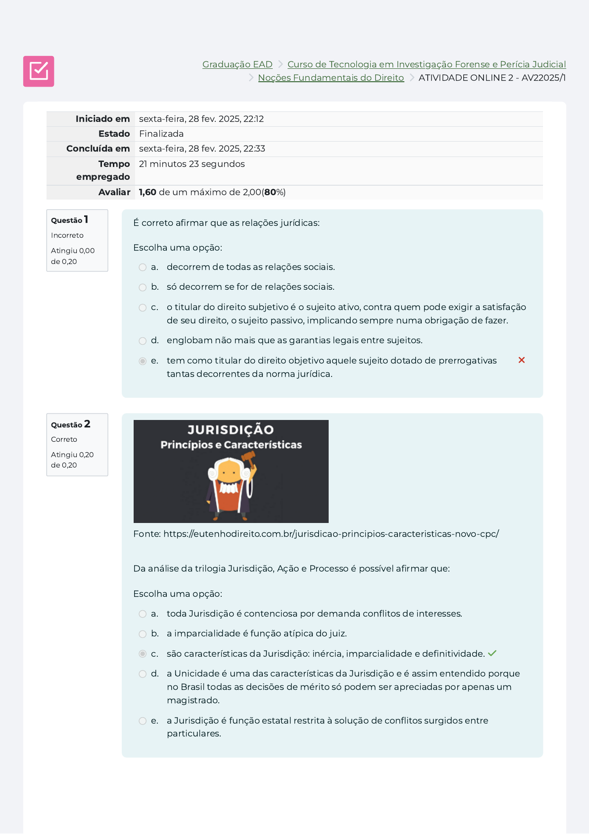 Graduação EAD 〉 Curso de Tecnologia em Investigação Forense e Perícia Judicial 〉 Noções Fundamentais do Direito 〉 ATIVIDADE ONLINE 2 - AV22025/1 Questão 1 Incorreto Atingiu 0,00 de 0,20 Questão 2 Correto Atingiu 0,20 de 0,20 Iniciado em sexta-feira, 28 fev. 2025, 22:12 Estado Finalizada Concluída em sexta-feira, 28 fev. 2025, 22:33 Tempo empregado 21 minutos 23 segundos Avaliar 1,60 de um máximo de 2,00(80%) É correto afirmar que as relações jurídicas: Escolha uma opção: a. decorrem de todas as relações sociais. b. só decorrem se for de relações sociais. c. o titular do direito subjetivo é o sujeito ativo, contra quem pode exigir a satisfação de seu direito, o sujeito passivo, implicando sempre numa obrigação de fazer. d. englobam não mais que as garantias legais entre sujeitos. e. tem como titular do direito objetivo aquele sujeito dotado de prerrogativas tantas decorrentes da norma jurídica. × Fonte: https://eutenhodireito.com.br/jurisdicao-principios-caracteristicas-novo-cpc/ Da análise da trilogia Jurisdição, Ação e Processo é possível afirmar que: Escolha uma opção: a. toda Jurisdição é contenciosa por demanda conflitos de interesses. b. a imparcialidade é função atípica do juiz. c. são características da Jurisdição: inércia, imparcialidade e definitividade. ✓ d. a Unicidade é uma das características da Jurisdição e é assim entendido porque no Brasil todas as decisões de mérito só podem ser apreciadas por apenas um magistrado. e. a Jurisdição é função estatal restrita à solução de conflitos surgidos entre particulares. https://ava.graduacaoead.unicv.edu.br/course/index.php?categoryid=34 https://ava.graduacaoead.unicv.edu.br/course/index.php?categoryid=79 https://ava.graduacaoead.unicv.edu.br/course/view.php?id=2156#section-4 Questão 3 Correto Atingiu 0,20 de 0,20 Questão 4 Correto Atingiu 0,20 de 0,20 https://advocaciamaciel.adv.br/o-novo-cpc-e-sua-aplicacao-no-processo-do-trabalho- com-relacao-aos-prazos-por-jose-alberto-couto-maciel/ Quanto ao Processo é possível dizer que. Escolha uma opção: a. é o meio pelo qual se instrumentaliza o direito de ação. ✓ b. também é possível, com os mesmos institutos, na arbitragem que é dotada de jurisdição. c. é uma relação jurídica autônoma, assim como a que nasce do direito material. d. é termo sinônimo de Ação. e. define-se como direito subjetivo de deduzir uma pretensão em juízo. Fonte: https://www.megajuridico.com/fontes-do-direito-administrativo/ Assinale a opção correta relativa a Fontes do Direito e a Hierarquia de normas. Escolha uma opção: a. na hierarquia de normas as Leis Ordinárias reputam-se acima das Leis Complementares, abaixo da Constituição Federal. b. em caso de antinomia entre Constituição Federal e Lei Ordinária, essa deverá prevalecer. c. o conjunto normativo que compõe o sistema jurídico possui dispositivos com força vinculante hierarquicamente homogênea. d. As Leis Complementares assim são chamadas porque complementam o texto constitucional, por isso estão hierarquicamente acima das Leis Ordinárias, em mesmo nível da Carta Política vigente. e. A aprovação de Lei Complementar exige quórum de votação distinto das Leis Ordinárias, esta é uma das razões que motivam as primeiras prevalecerem sobre as últimas. ✓ Questão 5 Correto Atingiu 0,20 de 0,20 Questão 6 Correto Atingiu 0,20 de 0,20 Observe as assertivas abaixo e assinale a opção correta. I – O Direito do Trabalho é formado pelo Direito Individual do Trabalho e pelo Direito Coletivo do Trabalho. II – O Direito Individual do Trabalho se preocupa com a relação individual de emprego e outras relações regulando o contrato de trabalho do início ao fim. III – O Direito Coletivo do Trabalho volta atenção às organizações sindicais, as negociações coletivas e os instrumentos normativos inerentes ao tema, tendo como alguns e seus temas, por exemplo, a greve. Escolha uma opção: a. duas assertivas são verdadeiras e apenas uma é falsa. b. todas estão corretas. ✓ c. item I é verdadeiro, mas o II é falso. d. o item I é falso, mas existe uma assertiva verdadeira. e. apenas o Itens I é verdadeiro, os demais são falsos. Código de 2002 A elaboração da nova codificação foi confiada a Miguel Reale, que convidou outros juristas para auxiliá-lo. Concluído o projeto, sofreu inúmeras criticas, pois abdicou da circunstância de ser um Código moderno em troca do comodismo e soluções passadistas. Após alterações, em 1983 foi aprovado na Câmara dos deputados, mas em razão da redemocratização do país e da elaboração da nova Constituição os trabalhos foram interrompidos e caídos no esquecimento. Abruptamente despertado, o projeto foi aprovado no Senado e na Câmara em 2001, inúmeras emendas foram efetuadas com o objetivo de adequar o projeto à nova realidade constitucional, e finalmente foi sancionado pelo presidente Fernando Henrique Cardoso em 2002. Fonte: https://pt.wikipedia.org/wiki/C%C3%B3digo_Civil_brasileiro Assinale a melhor definição de Direito Civil: Escolha uma opção: a. ramo do Direito que regula as relações jurídicas entre particulares, estabelecendo normas jurídicas capazes de proporcionar uma vida em sociedade minimamente viável, tratando de questões relacionadas a bens, contratos, relações de família, empresas e sucessões, dentre outros. ✓ b. ramo do Direito que regula as relações jurídicas entre particulares e os entes públicos, estabelecendo normas jurídicas capazes de proporcionar uma vida em sociedade minimamente viável, tratando de questões relacionadas a bens, contratos, relações de família, empresas e sucessões, dentre outros. c. ramo do direito que trata da punição aos crimes. d. ramo do Direito que trata das finanças públicas. e. ramo do Direito que regula as relações jurídicas limitando e conferindo poderes e tutelando normas fundamentais e garantias i