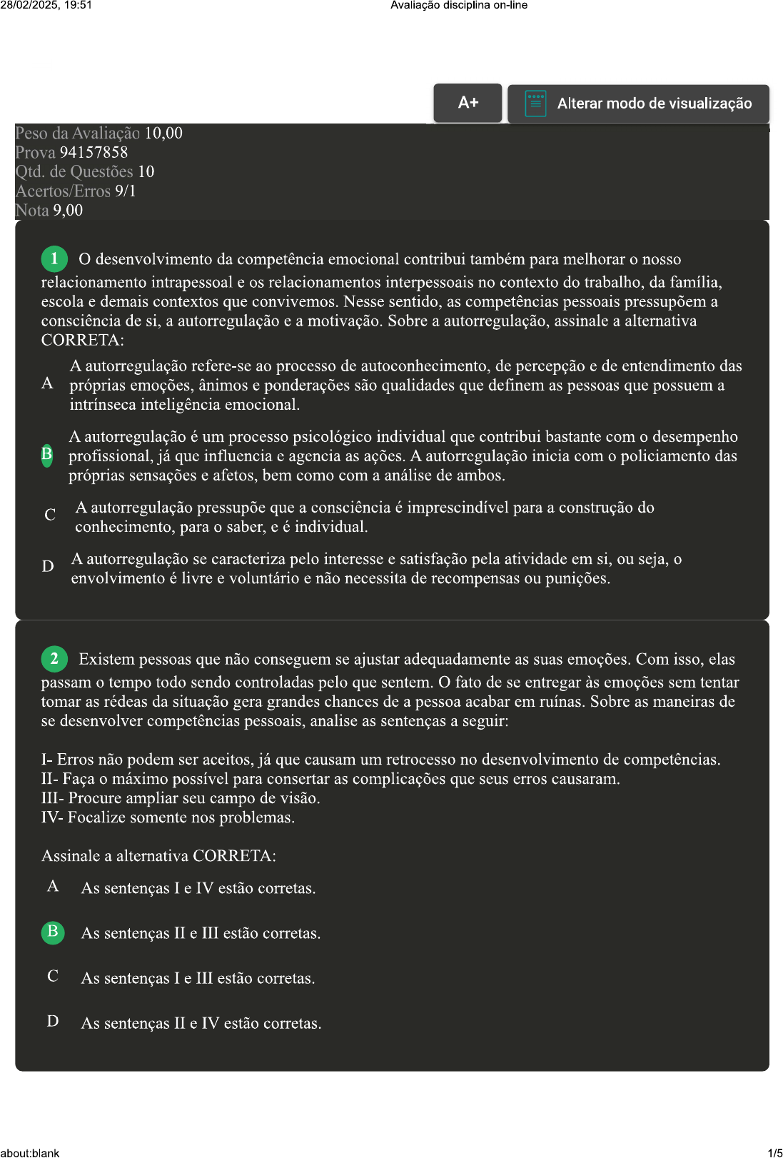 19:51 Avaliação disciplina on-line A+ Alterar modo de visualização Peso da Avaliação 10,00 Prova 94157858 Qtd. de Questões 10 Acertos/Erros 9/1 Nota 9,00 1 O desenvolvimento da competência emocional contribui também para melhorar nosso relacionamento intrapessoal e os relacionamentos interpessoais no contexto do trabalho, da família, escola e demais contextos que convivemos. Nesse sentido, as competências pessoais pressupõem a consciência de si, a autorregulação e a motivação. Sobre a autorregulação, assinale a alternativa CORRETA: A autorregulação refere-se ao processo de autoconhecimento, de percepção e de entendimento das A próprias emoções, ânimos e ponderações são qualidades que definem as pessoas que possuem a intrínseca inteligência emocional. A autorregulação é um processo psicológico individual que contribui bastante com desempenho B profissional, já que influencia e agencia as ações. A autorregulação inicia com policiamento das próprias sensações e afetos, bem como com a análise de ambos. C A autorregulação pressupõe que a consciência é imprescindível para a construção do conhecimento, para saber, e é individual. D A autorregulação se caracteriza pelo interesse e satisfação pela atividade em si, ou seja, envolvimento é livre e voluntário e não necessita de recompensas ou punições. 2 Existem pessoas que não conseguem se ajustar adequadamente as suas emoções. Com isso, elas passam tempo todo sendo controladas pelo que sentem. O fato de se entregar às emoções sem tentar tomar as rédeas da situação gera grandes chances de a pessoa acabar em Sobre as maneiras de se desenvolver competências pessoais, analise as sentenças a seguir: I- Erros não podem ser aceitos, já que causam um retrocesso no desenvolvimento de competências. II- Faça máximo possível para consertar as complicações que seus erros causaram. III- Procure ampliar seu campo de visão. IV- Focalize somente nos problemas. Assinale a alternativa CORRETA: A As sentenças I e IV estão corretas. B As sentenças II e III estão corretas. C As sentenças I e III estão corretas. D As sentenças II e IV estão corretas. about:blank 1/528/02/2025, 19:51 Avaliação disciplina on-line 3 A falta de inteligência emocional pode acarretar diversos dispêndios ou malefícios a si mesmo e/ou aos demais. Começando pelo fato de que pessoas que necessitam desenvolver sua inteligência emocional com urgência estão fadadas a dilacerar suas relações pessoais em qualquer uma das esferas. Sobre as formas de se agir durante discussões, analise as sentenças a seguir: I- Mesmo que seu oponente se mostre irado ou descontrolado, a melhor coisa que você pode fazer é mostrar-se pacífico e tranquilo. II- O melhor a fazer é não ficar em silêncio até que você e a outra pessoa tenham chegado num acordo, pois dá a impressão de que você está errado. III- Não aja com desdém, pois isso pode deixar outro ainda mais furioso. Assinale a alternativa CORRETA: A Somente a sentença I está correta. B As sentenças I e II estão corretas. C As sentenças II e III estão corretas. D As sentenças I e III estão corretas. 4 Não somente de ideias vive uma pessoa. As emoções são parte significativa do que é ser humano. E muito do sucesso obtido nos mais diversos âmbitos (pessoal, profissional, estudantil, entre outros) se deve à conseguir lidar com essas emoções. Diante do exposto, classifique V para as sentenças verdadeiras e F para as falsas: ( ) Com treinamento mental constante, é possível dominar completamente as emoções, a partir do momento que surgem até seu desfecho. ( ) Quando somos repentinamente afetados por uma emoção, não conseguimos antever que pode acontecer, reduzindo assim nosso poderio sobre ela. ( ) O autoconhecimento. a percepção e entendimento das próprias emoções, ânimos e ponderações são qualidades que definem as pessoas que possuem a intrínseca inteligência emocional. Assinale a alternativa que apresenta a sequência CORRETA: A V F V. B C D Revisar Conteúdo do Livro 5 Pode-se dizer que a inteligência emocional é muito proveitosa para crescimento pessoal ou intelectual de uma pessoa. Com passar do tempo, as pessoas adquirem experiências, que resultam em aprendizados e enriquecimento da inteligência emocional. Diante do exposto, assinale a alternativa CORRETA que apresenta um exercício eficaz para a otimização da inteligência emocional: about:blank 2/519:51 Avaliação disciplina on-line A A reflexão sobre mundo externo e os problemas alheios ajudam na otimização da inteligência emocional. B A reflexão íntima e interior, mais conhecida como introspecção, ajuda no aperfeiçoamento e na otimização da inteligência emocional. C Voltar-se para si, por meio da reflexão e do exercício físico ajuda na otimização da inteligência emocional em curto tempo. D A reflexão íntima e interior, mais conhecida como introspecção, contribui para aumento da ansiedade e do estresse. 6 É importante compreender os mecanismos que corpo humano utiliza para nos ajudar a gerir as emoções. A busca pela inteligência emocional pode ser facilitada se indivíduo utilizar conhecimento científico a seu favor. Sobre neocórtex, analise as sentenças a seguir: I- Neocórtex são as regiões cerebrais responsáveis pela coordenação de distintas informações obtidas pelas vias sensitivas e sensoriais do corpo II- É núcleo do planejamento de III- Encontra-se no sistema cardíaco, e produz somente sensações vistas como maléficas, como raiva e tristeza. IV- Abrange a organização e administração até das ações desencadeadas pelas emoções. Assinale a alternativa CORRETA: A Somente a sentença II está correta. B As sentenças I, II e IV estão corretas. C As sentenças I e III estão corretas. D As sentenças II, III e IV estão corretas. 7 Embora sejamos seres relacionais em nossa essência, a conivência humana a