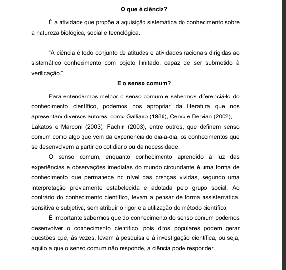que é ciência? É a atividade que propõe a aquisição do conhecimento sobre a natureza biológica, social e tecnológica. "A ciência é todo conjunto de atitudes e atividades racionais dirigidas ao sistemático conhecimento com objeto capaz de ser submetido à verificação." E senso comum? Para entendermos melhor senso comum e sabermos diferenciá-lo do conhecimento podemos nos apropriar da literatura que nos apresentam diversos autores, como Galliano Cervo e Bervian (2002), Lakatos e Marconi (2003), Fachin (2003), entre outros, que definem senso comum como algo que vem da experiência do dia-a-dia, os conhecimentos que se desenvolvem a partir do cotidiano ou da senso comum, enquanto conhecimento aprendido à luz das experiências e observações imediatas do mundo circundante é uma forma de conhecimento que permanece no nível das crenças vividas, segundo uma interpretação previamente estabelecida e adotada pelo grupo social. Ao contrário do conhecimento levam a pensar de forma sensitiva e subjetiva, sem atribuir rigor e a utilização do método É importante sabermos que do conhecimento do senso comum podemos desenvolver conhecimento pois ditos populares podem gerar questões que, às vezes, levam à pesquisa e à investigação ou seja, aquilo a que senso comum não responde, a ciência pode responder.