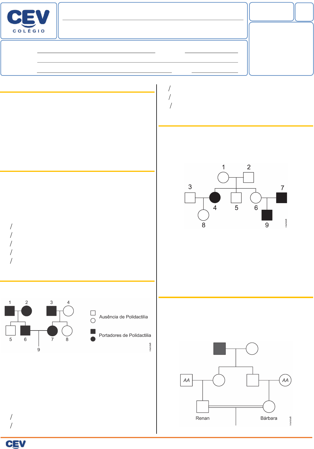 P á g i n a | 1 Biologia - 2020 Quem faz CEV faz mais pelo seu futuro CEV Colégio 2020 “Sonhos sem disciplina produzem pessoas frustradas, e disciplina sem sonhos produz pessoas autômatas, que só sabem obedecer a ordens”. Augusto Cury Data: 19/03/2020 1 Professor: CHICÃO SOARES Disciplina: BIOLOGIA Aluno (a): Turma: BIOLOGIA CONTRA O TEMPO – 1ª LEI DE MENDEL Turno: Questão 01 Um dos conceitos utilizados para a compreensão de genética diz que a propriedade de um alelo de produzir o mesmo fenótipo tanto em condição homozigótica quanto em condição heterozigótica é causada por um gene a) homozigoto. b) dominante. c) recessivo. d) autossomo. e) heterólogo Questão 02 O alelo dominante K é autossômico e condiciona pelagem amarela nos ratos, sendo letal ainda na fase embrionária quando em homozigose. Já o alelo recessivo k condiciona pelagem selvagem (marrom). Considerando um cruzamento entre parentais amarelos, a probabilidade de nascimento de uma fêmea marrom é de a) 1 8. b) 1 3. c) 1 4. d) 1 9. e) 1 6. Questão 03 Observe a genealogia abaixo. Os indivíduos 1, 2, 3, 6 e 7 são portadores de polidactilia (presença de seis ou mais dedos nas mãos e nos pés), enquanto que os indivíduos 4, 5 e 8 não são portadores de polidactilia. Sabendo-se que a característica analisada pela genealogia é condicionada por um par de alelos autossômicos, pode-se concluir que a probabilidade do indivíduo 9 nascer do sexo masculino e com ausência de polidactilia é de a) 1 4 b) 1 6 c) 1 8 d) 1 12 e) 3 8 Questão 04 No esquema apresentado a seguir, os indivíduos assinalados em preto apresentam surdez causada pela mutação do gene conexina 26, de padrão autossômico recessivo. No heredograma acima, são obrigatoriamente heterozigotos os indivíduos: a) 4, 7 e 9 b) 1, 2, 6 e 8 c) 3, 6 e 8 d) 1, 2, 5 e 6 e) 1 e 2 Questão 05 Acromatopsia é uma doença autossômica recessiva rara determinada por um par de alelos. Pessoas com essa doença pouco distinguem cores ou não as distinguem, podendo enxergar uma só cor. No heredograma, o avô de Renan e Bárbara apresenta a acromatopsia. P á g i n a | 2 Biologia - 2020 Grupo Educacional CEV 2 A probabilidade de Renan e Bárbara gerarem um menino com a acromatopsia será de a) 1 16. b) 1 8. c) 1 32. d) 1 64. e) 1 4. Questão 06 No heredograma, os símbolos preenchidos representam pessoas afetadas por uma doença hereditária. Os homens são representados pelos quadrados e as mulheres, pelos círculos. O padrão de herança observado por essa doença é a) recessivo autossômico, porque pais (II–4 e II–5) tiveram filhas normais. b) recessivo ligado ao cromossomo X, porque a filha (II–2) do homem afetado (I–1) não é afetada. c) recessivo ligado ao cromossomo Y, pois a doença se manifesta apenas nos indivíduos do sexo masculino. d) dominante autossômica, porque os pais afetados (I–1 e I–2) tiveram uma filha normal (II–2). e) dominante ligado ao cromossomo X, pois todas as filhas de homens afetados também apresentam a doença. Questão 07 Até o início século XX a explicação mais aceita para a hereditariedade era a de que os gametas eram formados por partículas provindas de várias regiões do corpo e na fecundação eles se fundiam, misturando assim as características dos pais em um novo indivíduo. Mendel postulou que fatores, ou elementos, eram responsáveis pela transmissão de tais características e que eles são recebidos dos pais, via gametas. Marque a alternativa que representa de forma CORRETA as explicações de Mendel para a hereditariedade e os conceitos atuais da genética. a) Os genes correspondem ao que Mendel denominou fatores que se unem durante a fecundação, gerando um indivíduo com as características intermediárias do pai e da mãe. b) Ao herdar dos pais dois alelos diferentes para uma mesma característica hereditária, um indivíduo pode ter manifestada apenas uma variável: o fenótipo dominante. c) Na formação dos gametas, os alelos para uma mesma característica, herdados de pai e mãe, se separam independentemente nas células diploides. d) Em um indivíduo, cada característica hereditária é condicionada por um alelo, resultante da associação de diferentes genes oriundos da fusão dos gametas do pai e da mãe. e) Na segunda fase da meiose, ocorre o pareamento dos genes alelos em cromossomos homólogos na placa equatorial da célula, para a formação de gametas. Questão 08 Observe a ilustração abaixo, que indica o genótipo de uma característica monogênica Mendeliana em um indivíduo. Com relação ao que aparece na ilustração, é correto afirmar que a) o indivíduo é heterozigoto para a característica monogênica indicada e pode formar 50% dos gametas A e 50% dos gametas a. b) caso esse indivíduo tenha um filho gerado com outra pessoa de igual genótipo, a probabilidade de o filho ser heterozigoto é de 25%. c) esse genótipo é um exemplo de expressão de uma característica recessiva. d) quatro células haploides serão formadas na proporção de 1: 2 :1, ao final da meiose II desse indivíduo. e) as letras representam alelos para características diferentes e ocupam lócus diferentes nos cromossomos homólogos. Questão 09 A doença renal policística autossômica recessiva, conhecida em inglês pela sigla ARPKD, é uma rara enfermidade hereditária. Para desenvolver a enfermidade, uma criança deve herdar as duas cópias defeituosas do gene que causa a ARPKD. Quem tem apenas uma cópia do gene com problema não desenvolve a doença, embora possa transmiti-la a seus filhos se seu parceiro também carregar uma mutação nesse mesmo gene. Considere o heredograma abaixo que mostra uma família na qual o indivíduo V nasceu com ARPKD: P á g i n a | 3 Biologia - 2020 Grupo Educacional CEV 3 A probabilidade de o indivíduo III ser portador do gene para a ARPKD é a) 1 3 b) 2 3 c) 1 d) 1 2 e) 1 4 Questão 10 Gregor Mendel, no século XIX, investigou os mecanismos da h
